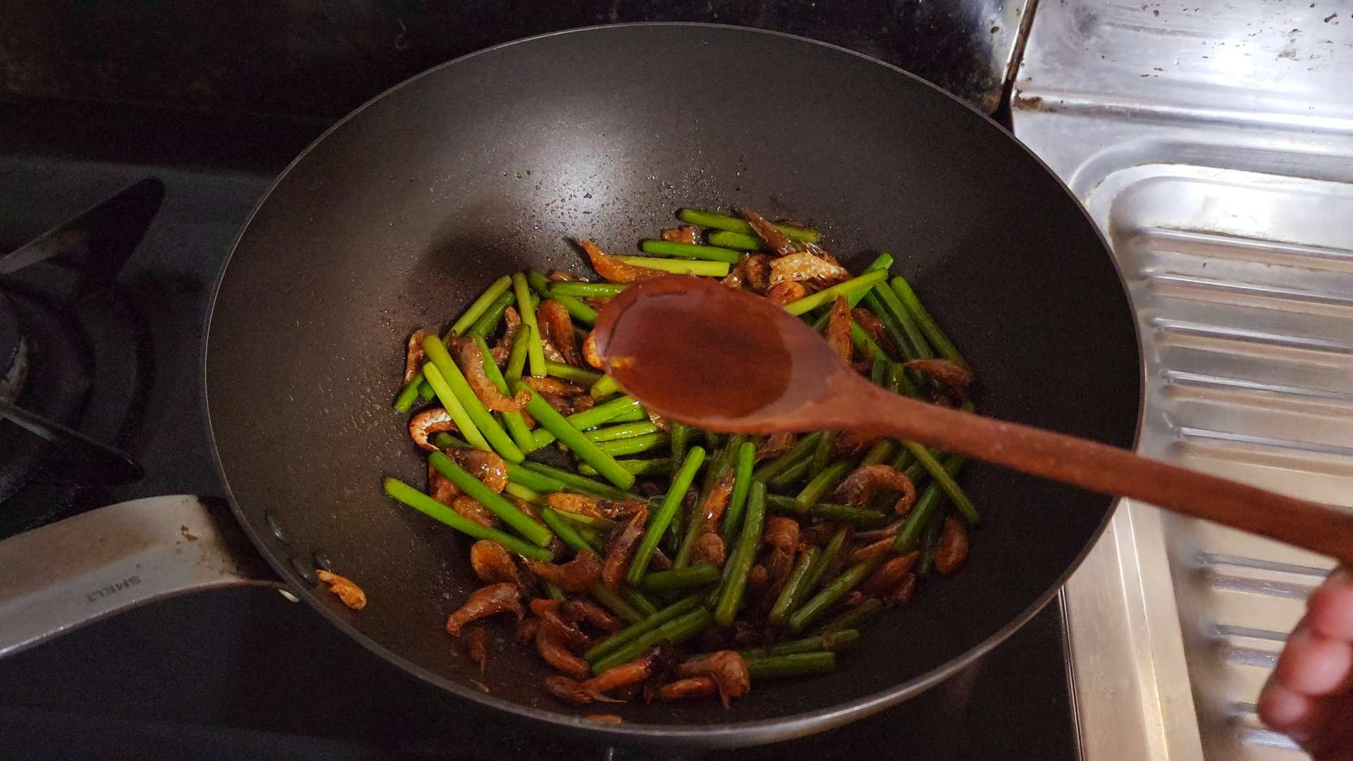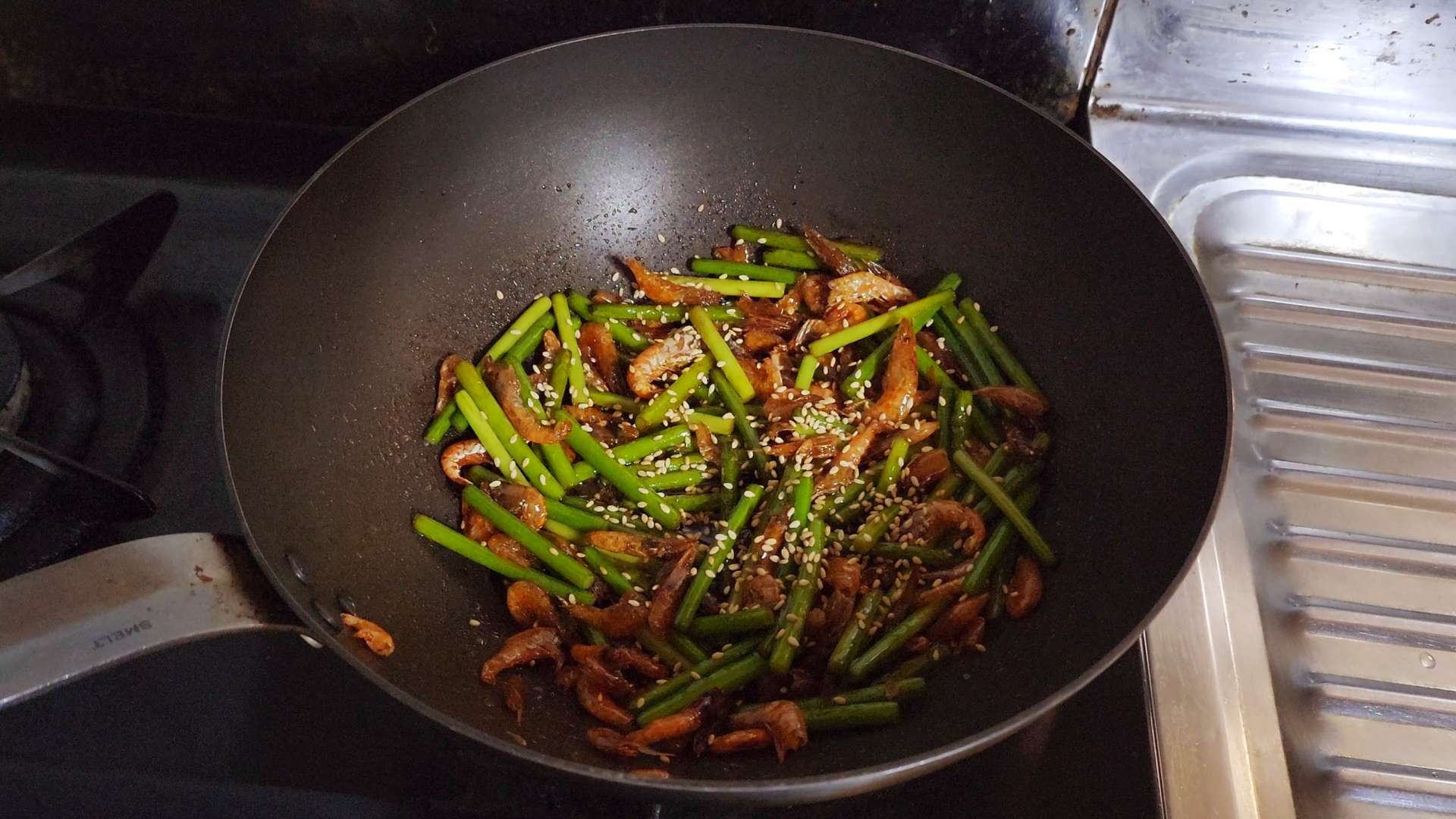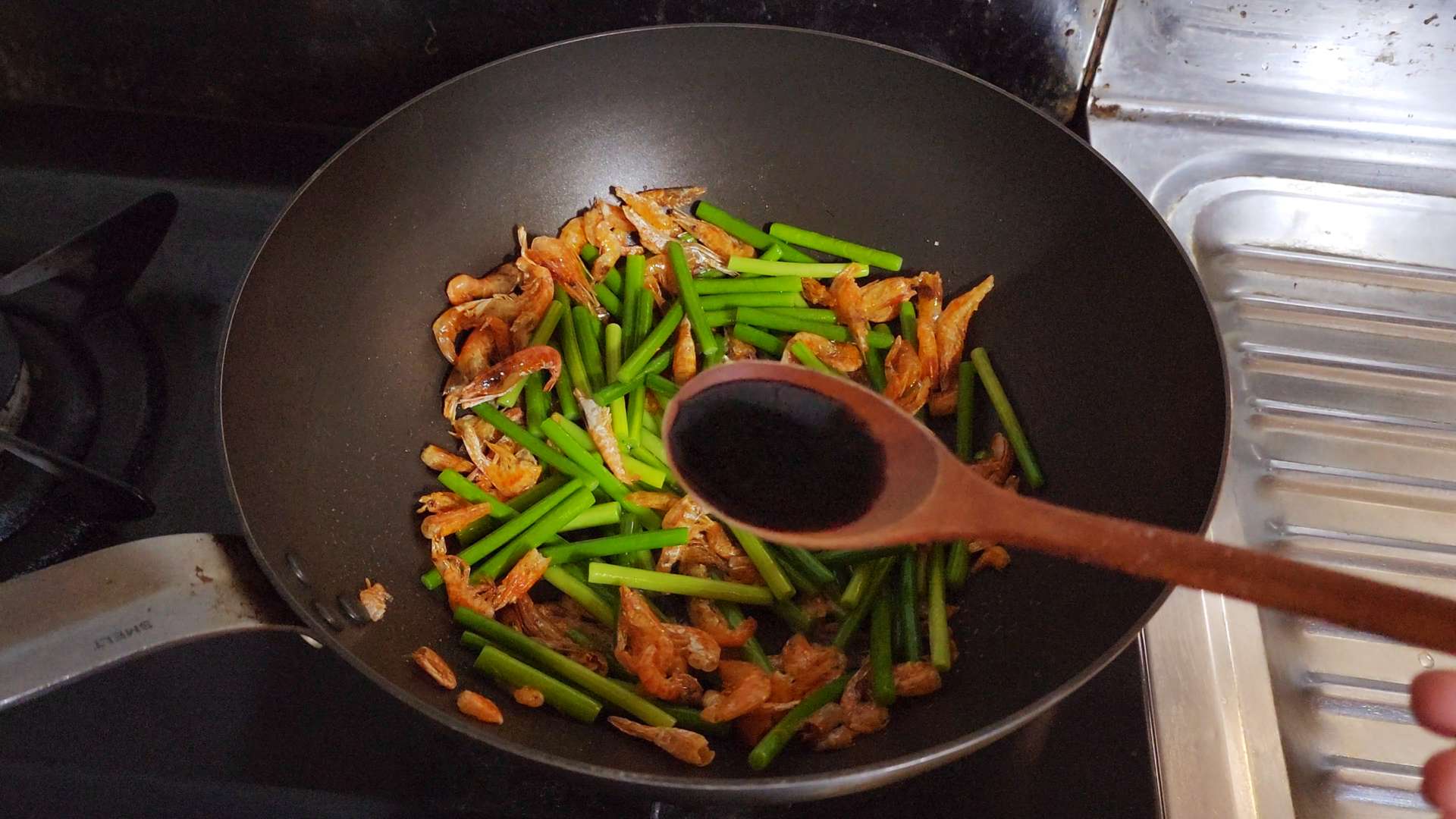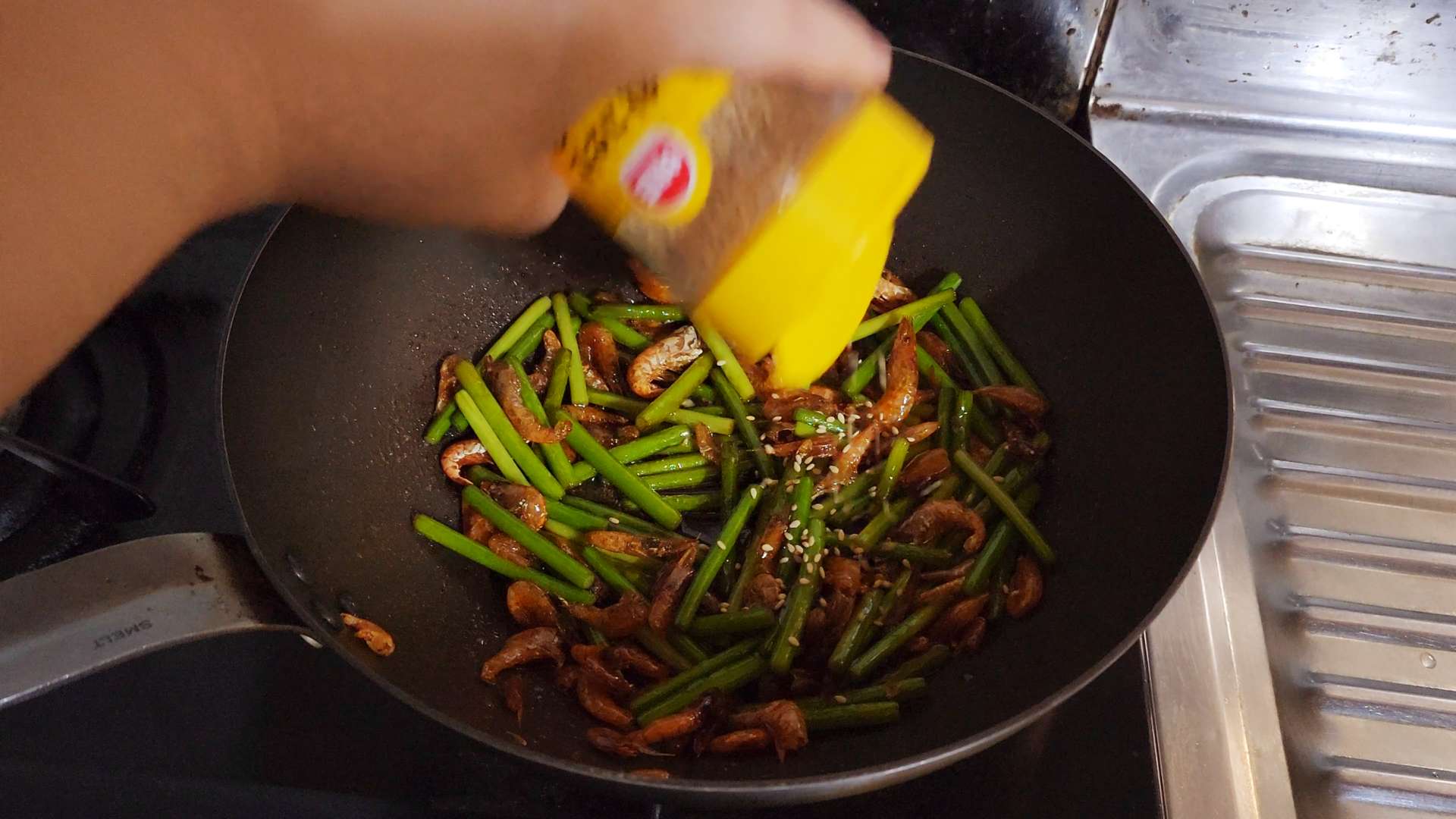 중불로 달군팬에 식용유, 마늘쫑, 건새우를 넣고 볶아줍니다.