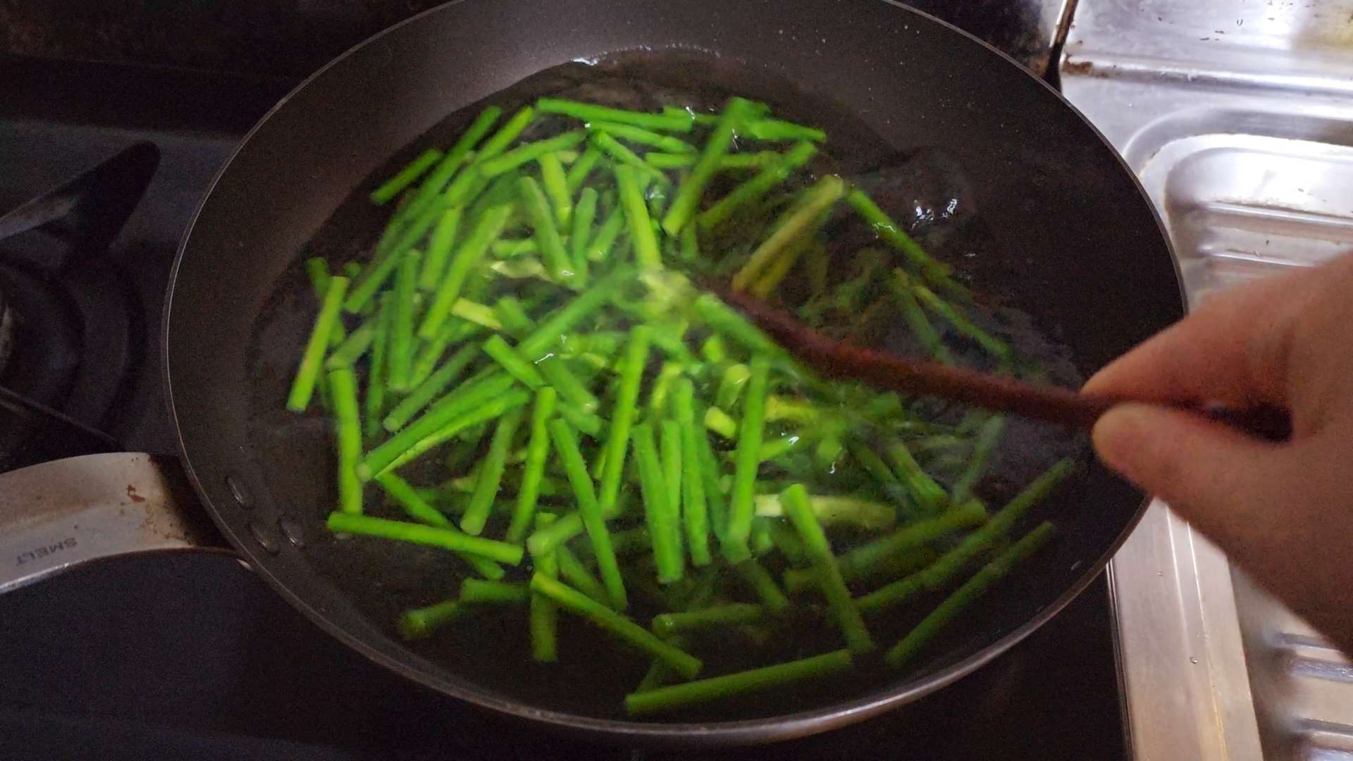 재료: 마늘쫑 150g, 건새우 100g, 굵은소금 1T, 식용유
