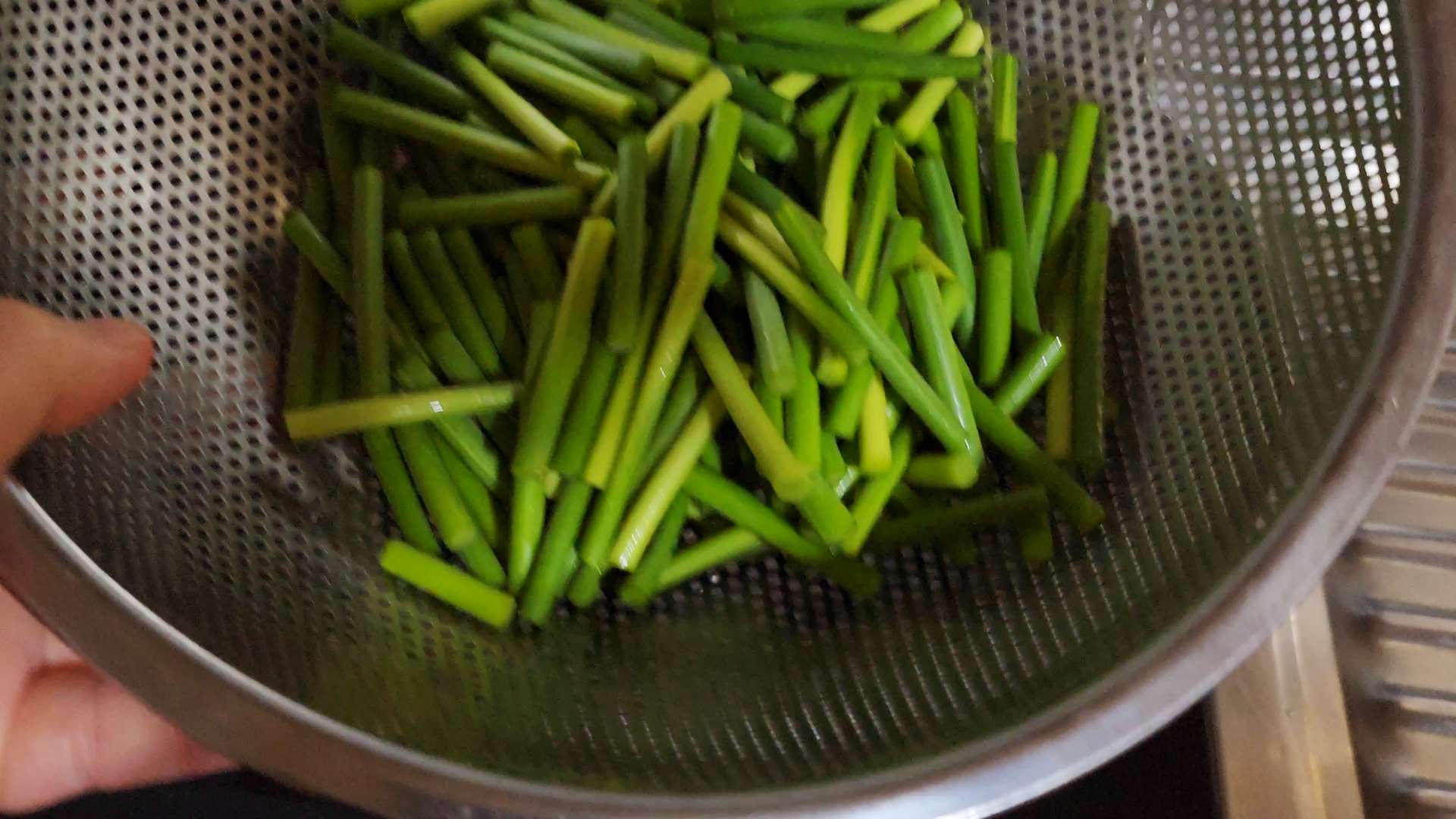끓는물에 굵은소금 1T, 마늘쫑을 넣고 1분 정도 데쳐줍니다. 데친 마늘쫑은 체반에 밭쳐 물기를 제거해줍니다.