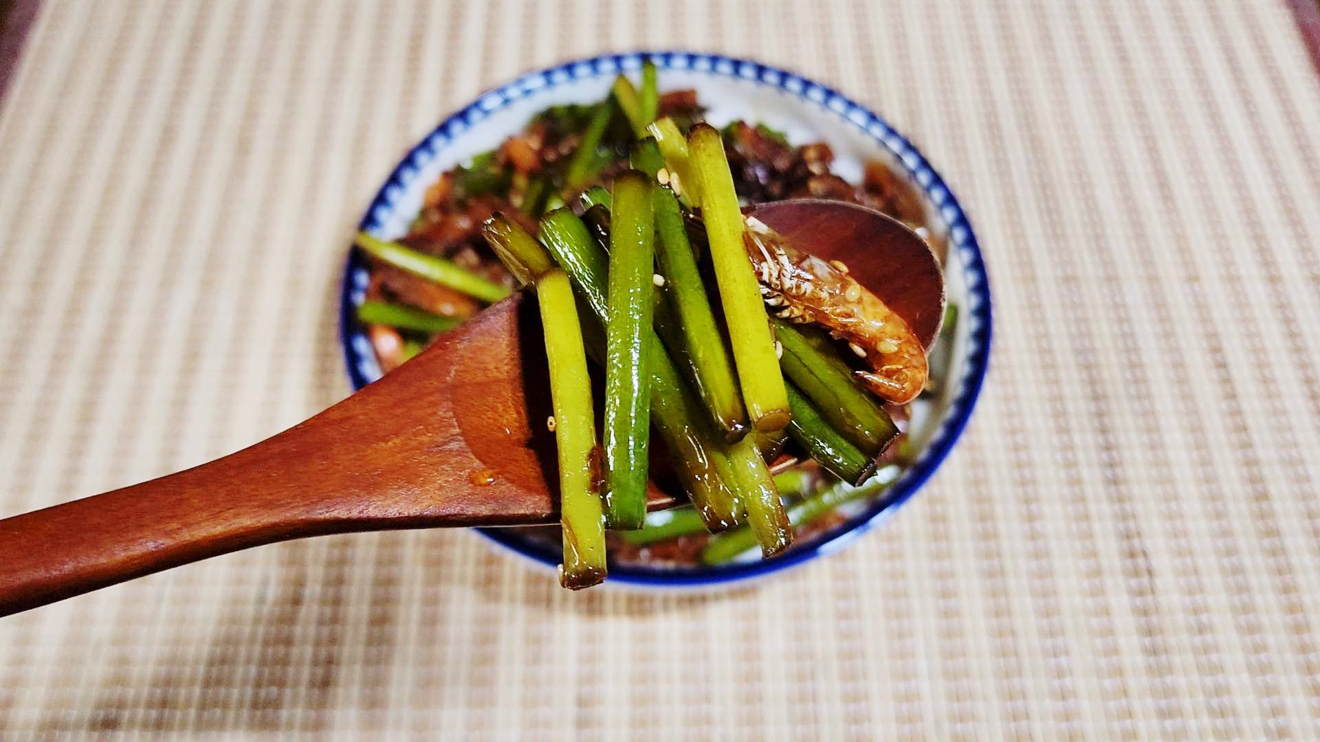 쫀득한 마늘쫑과 바삭한 새우를 같이 먹으면 맛있답니다.