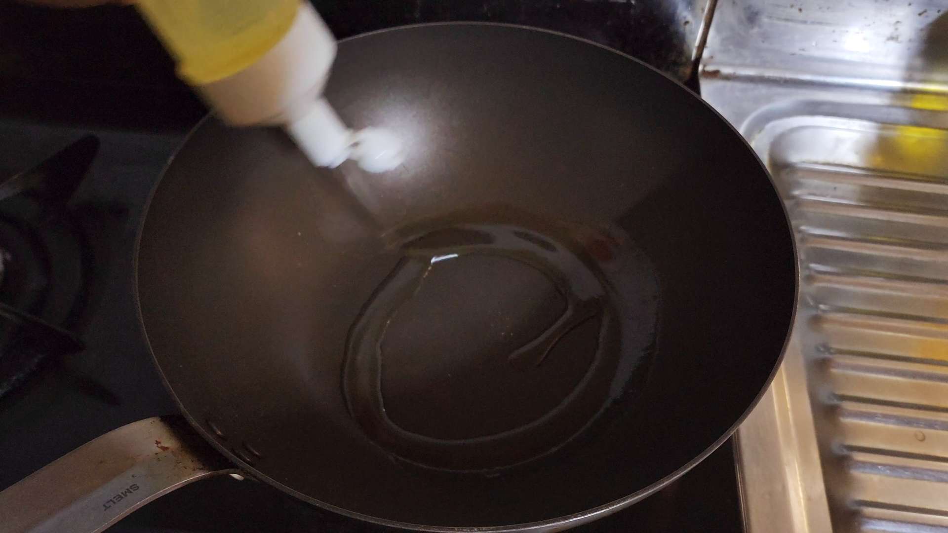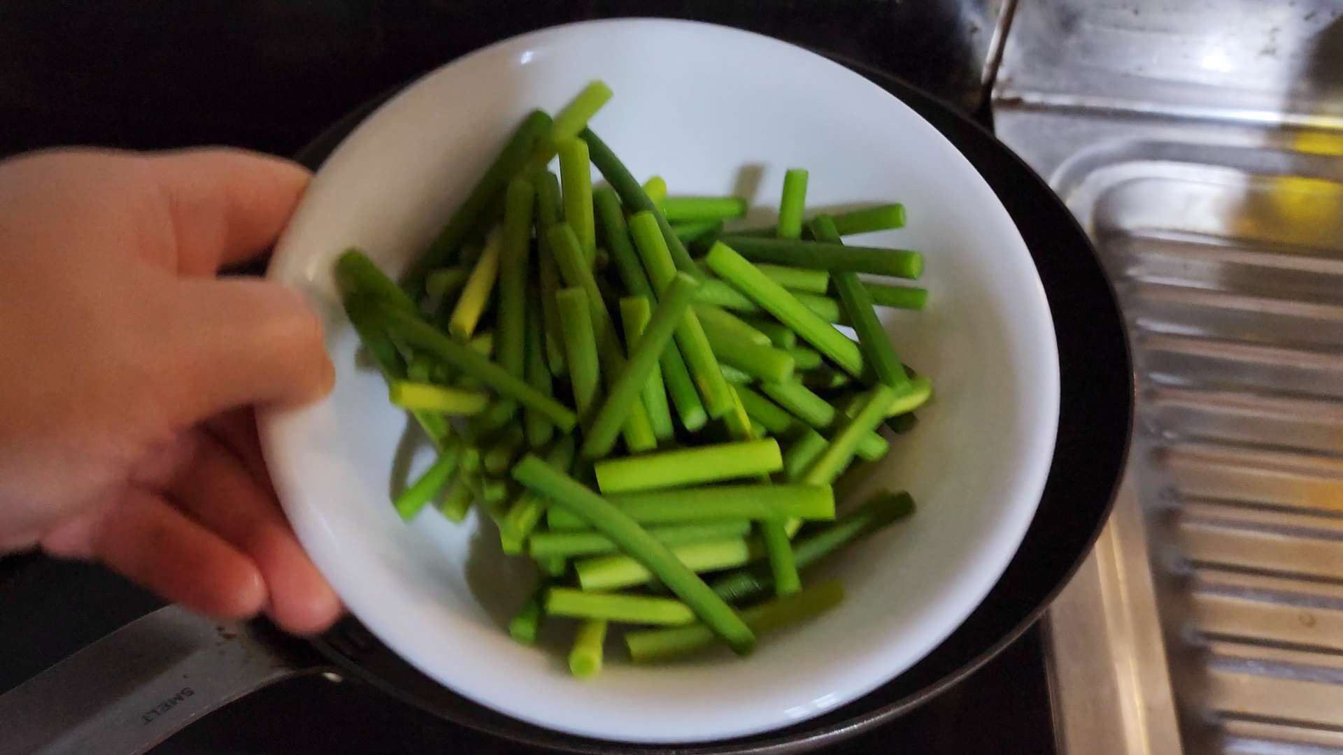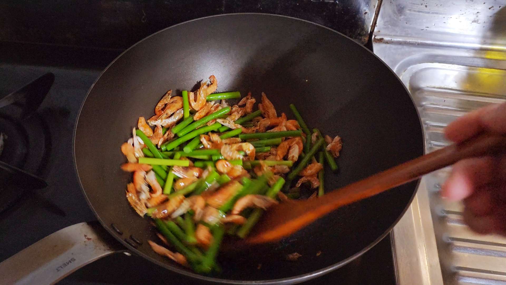 중불로 달군팬에 식용유, 마늘쫑, 건새우를 넣고 볶아줍니다.