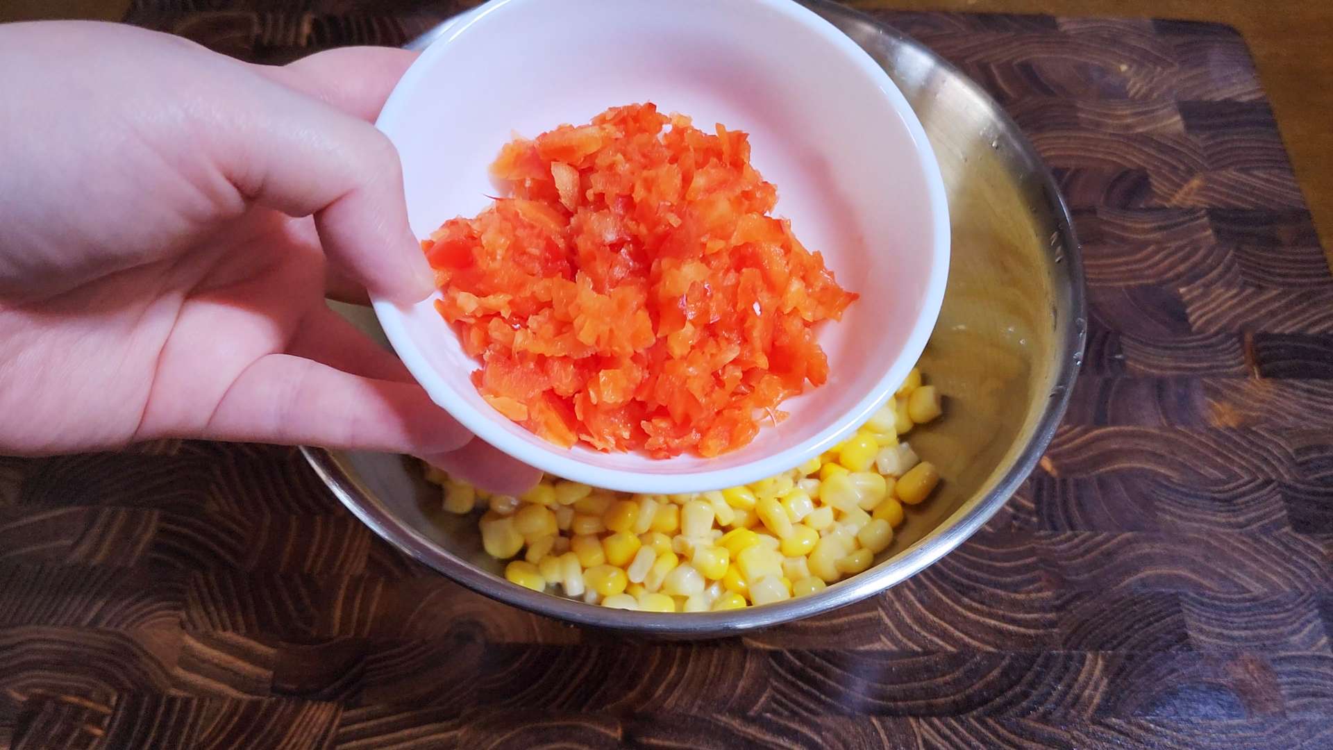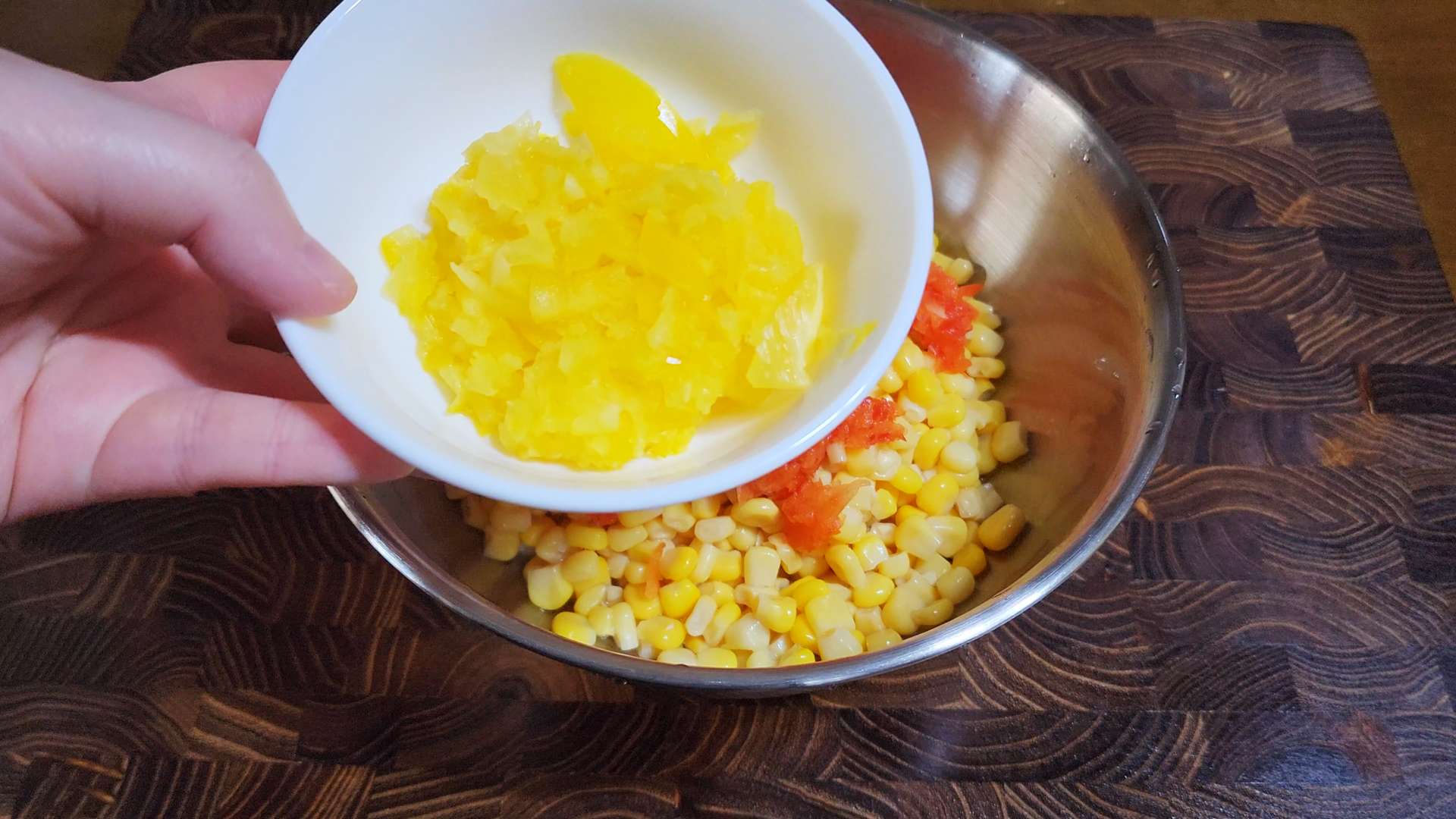 통조림 옥수수 1캔을 국물까지 담고 빨간 파프리카,