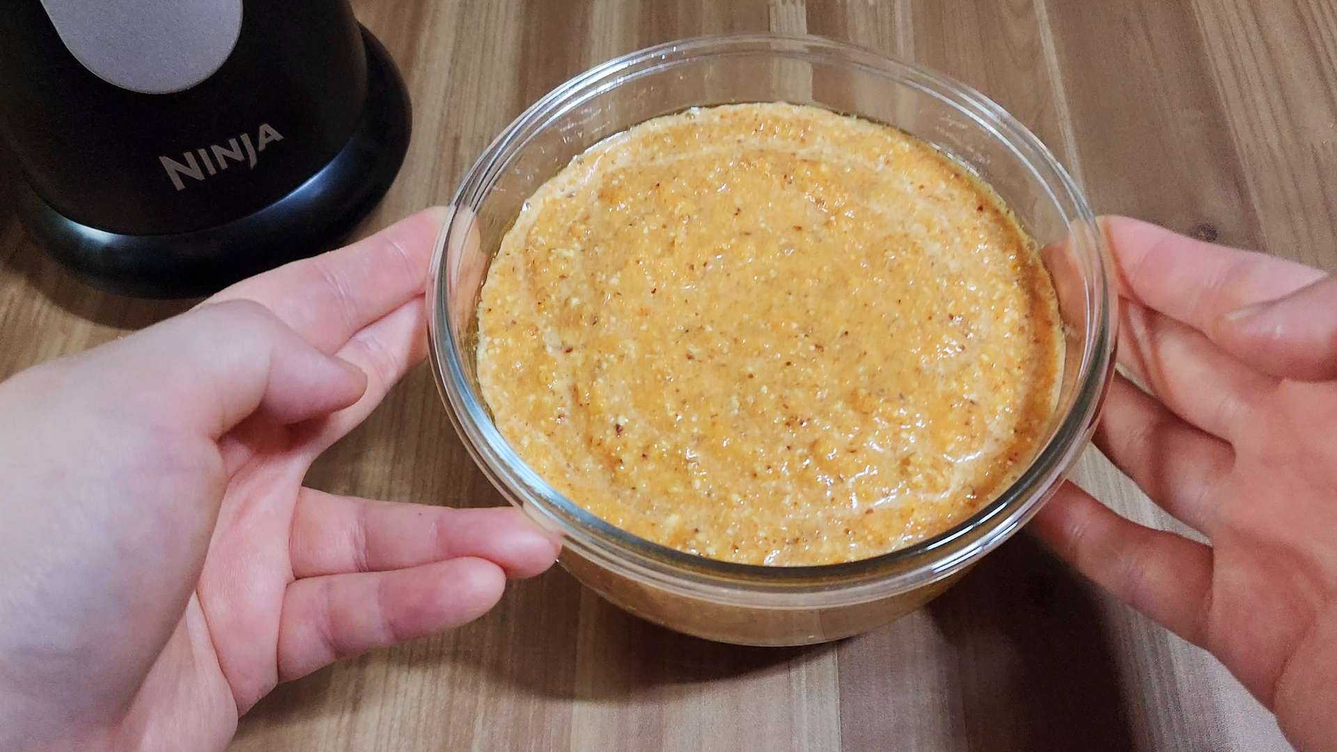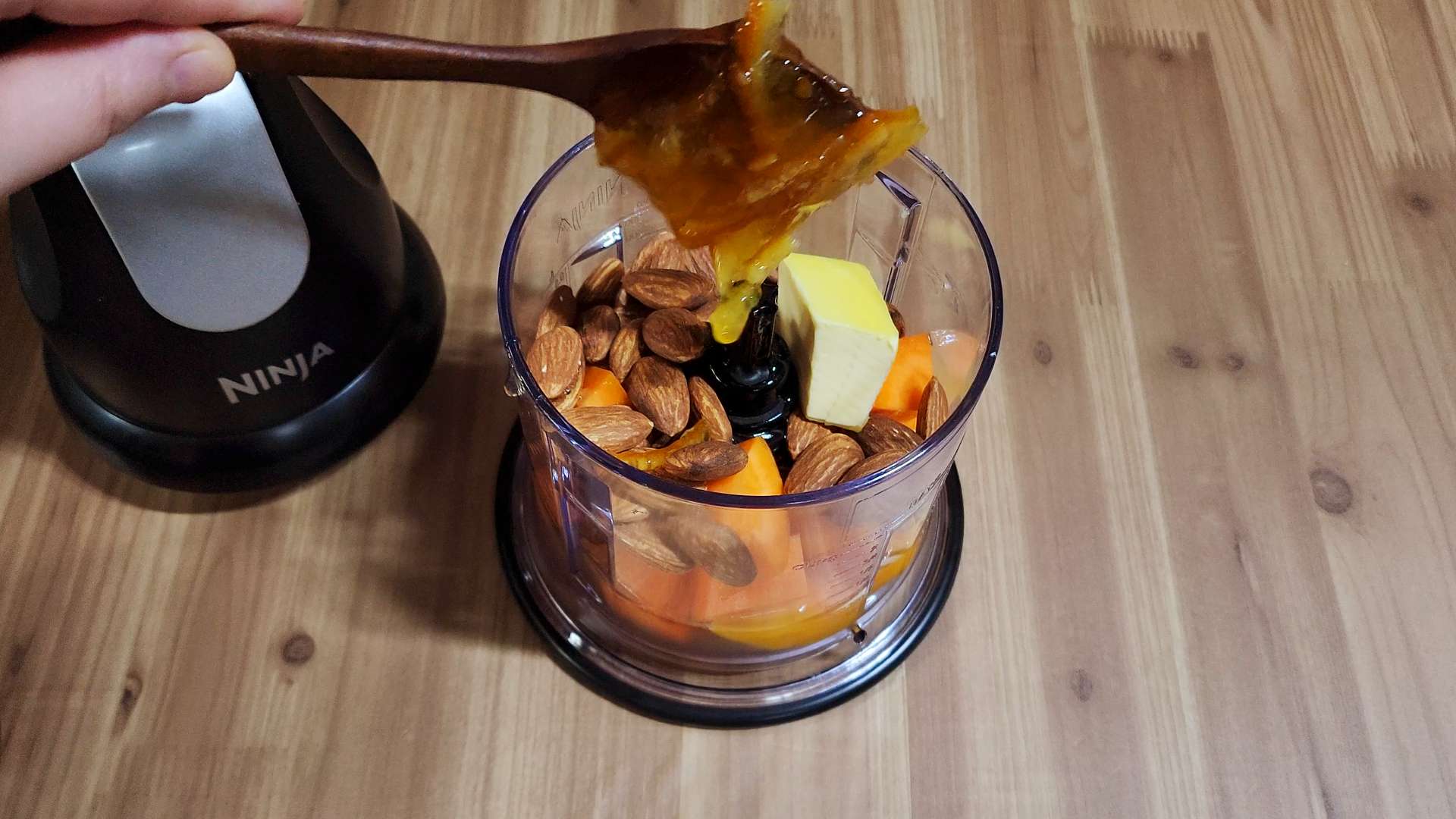 블렌더에 달걀 3개, 당근 150g, 아몬드 100g, 버터 1T, 유자청 1T 순으로 넣고 2분 정도 갈아줍니다.