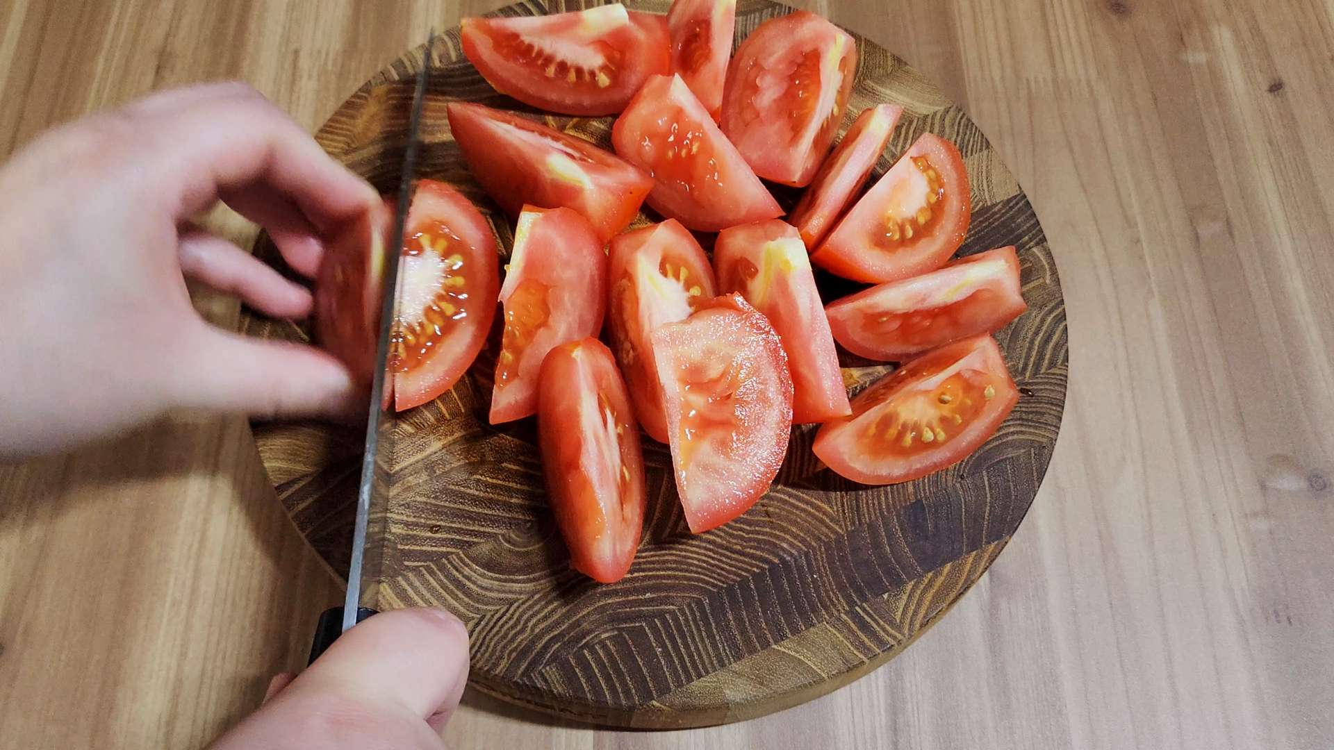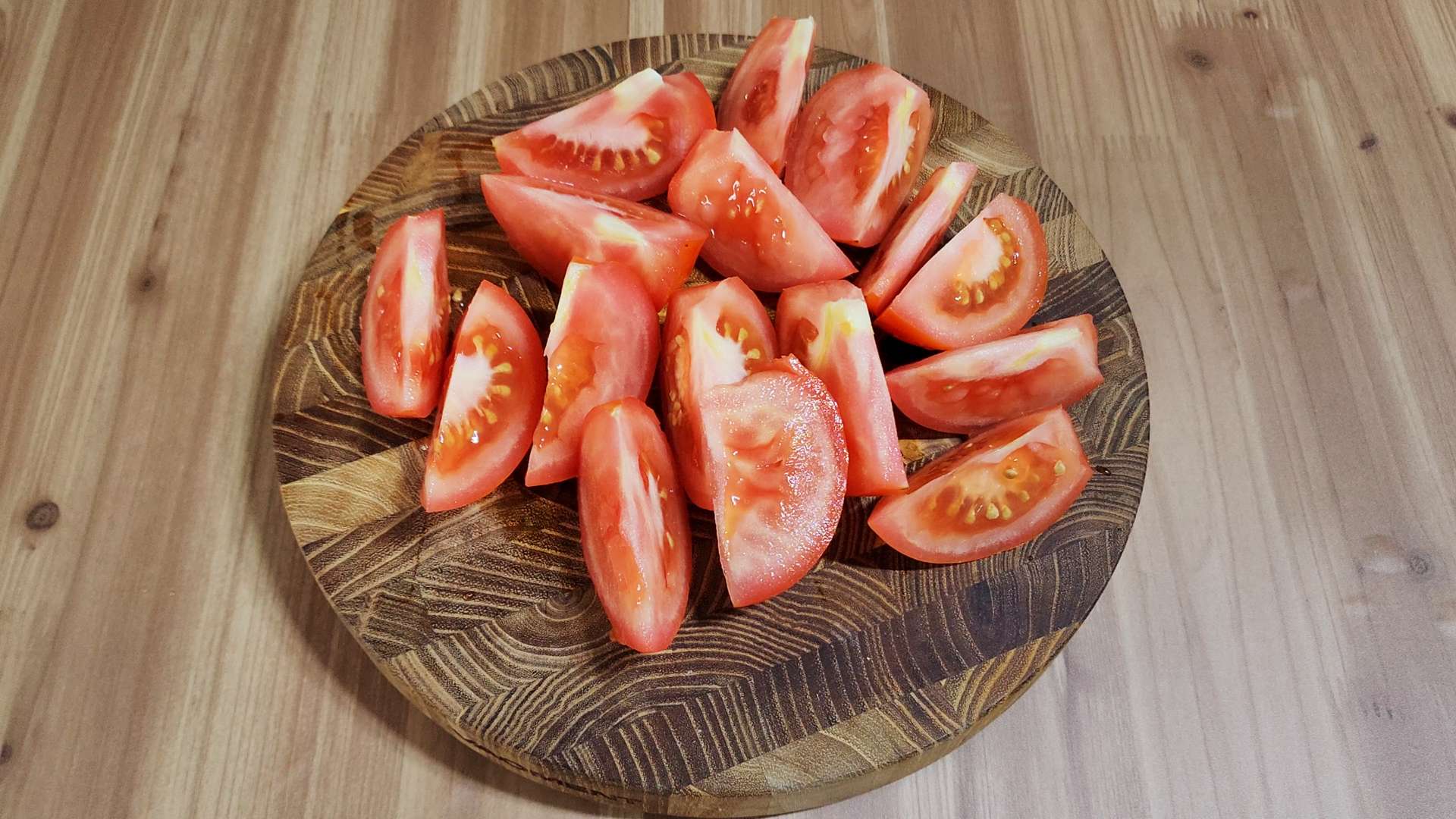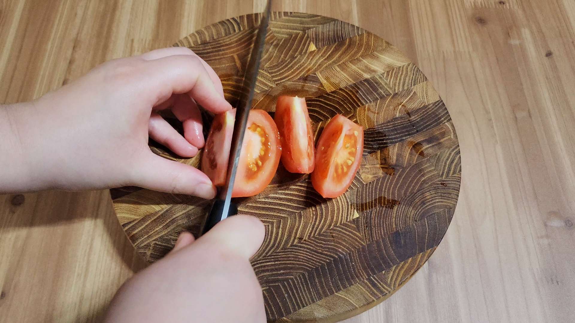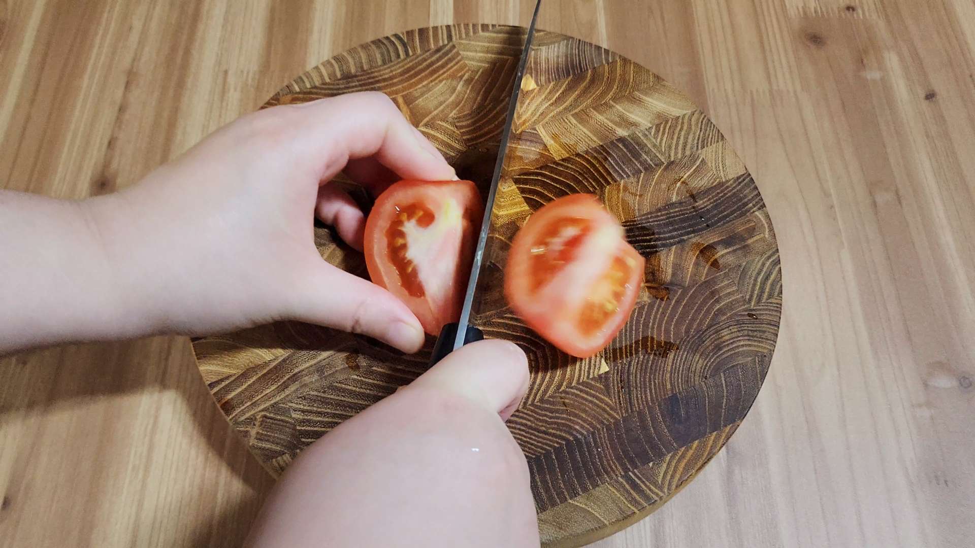 토마토는 반으로 잘라 꼭지를 제거해줍니다.