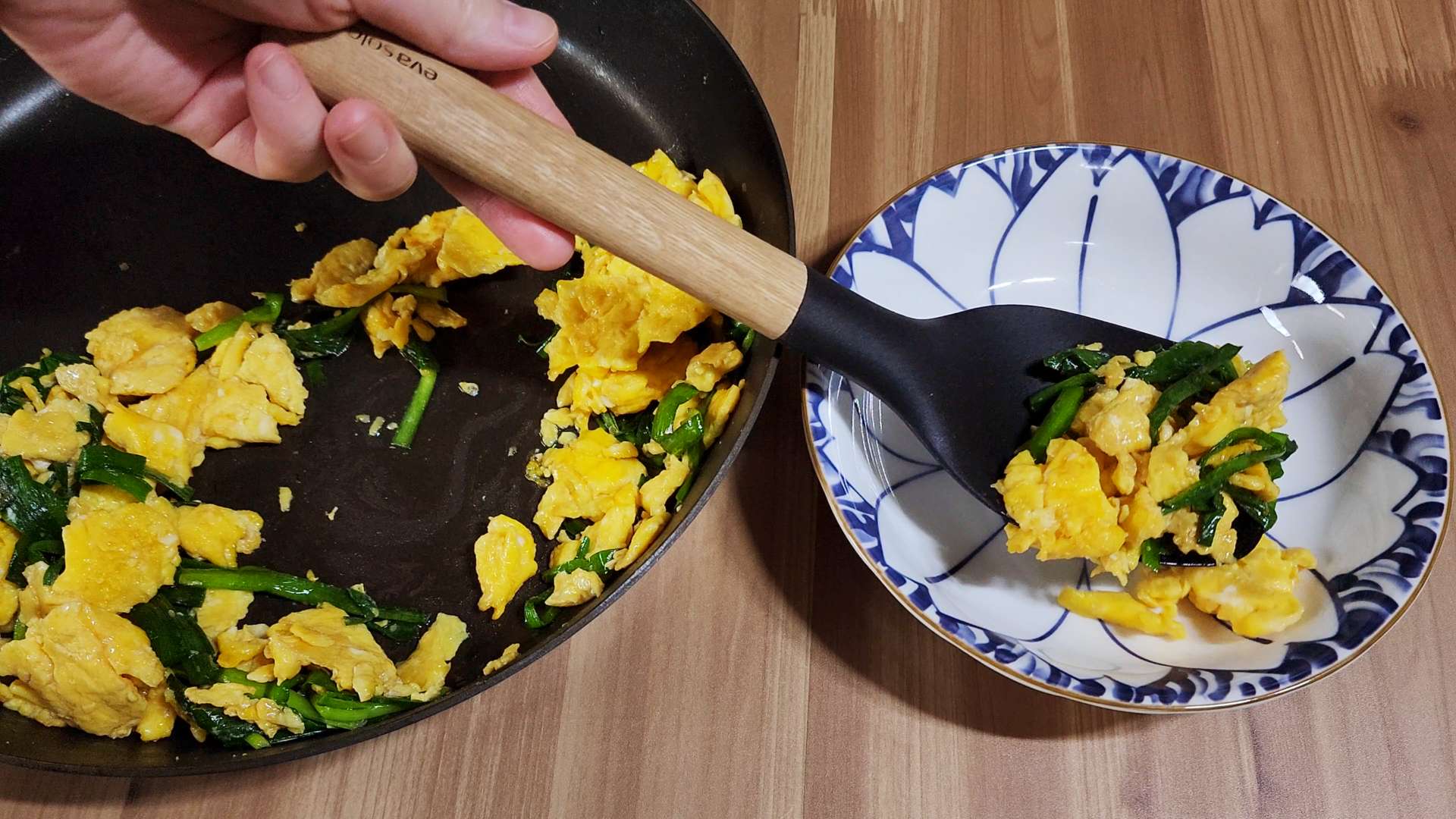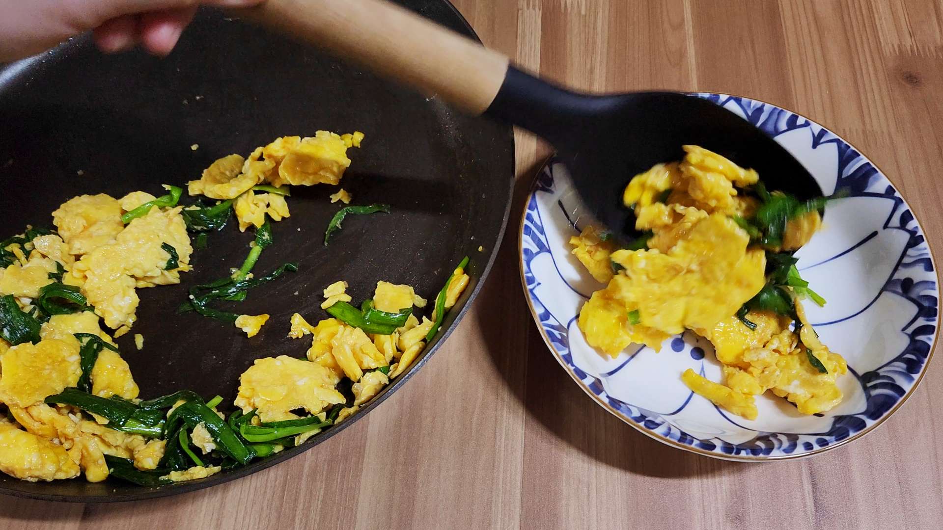 부드러운 계란과 아삭한 부추를 같이 먹으면 맛있어요.