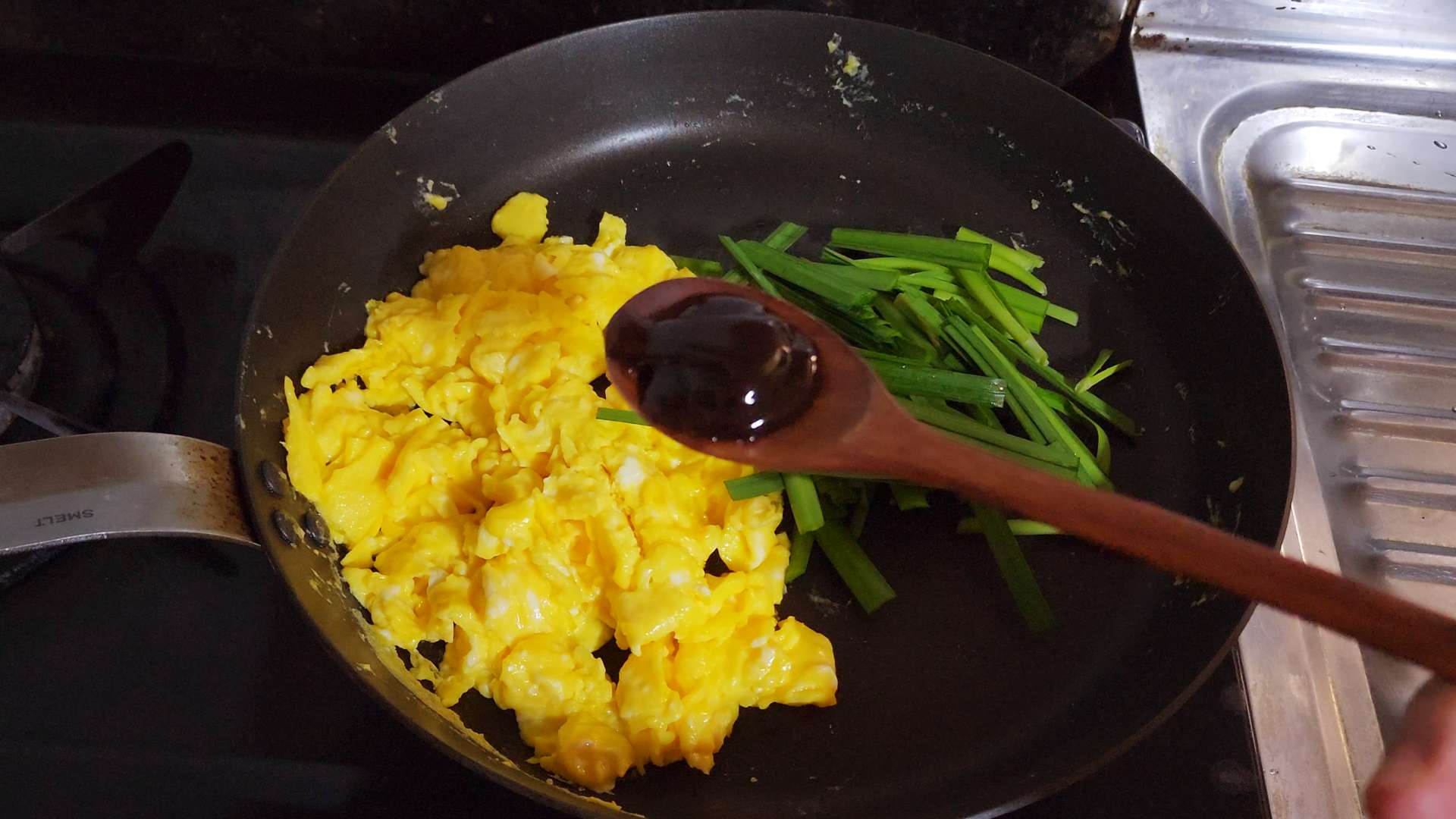 계란이 반쯤 익었을때 부추, 굴소스 1T를 넣고 중불에서 1분 정도 볶아줍니다.