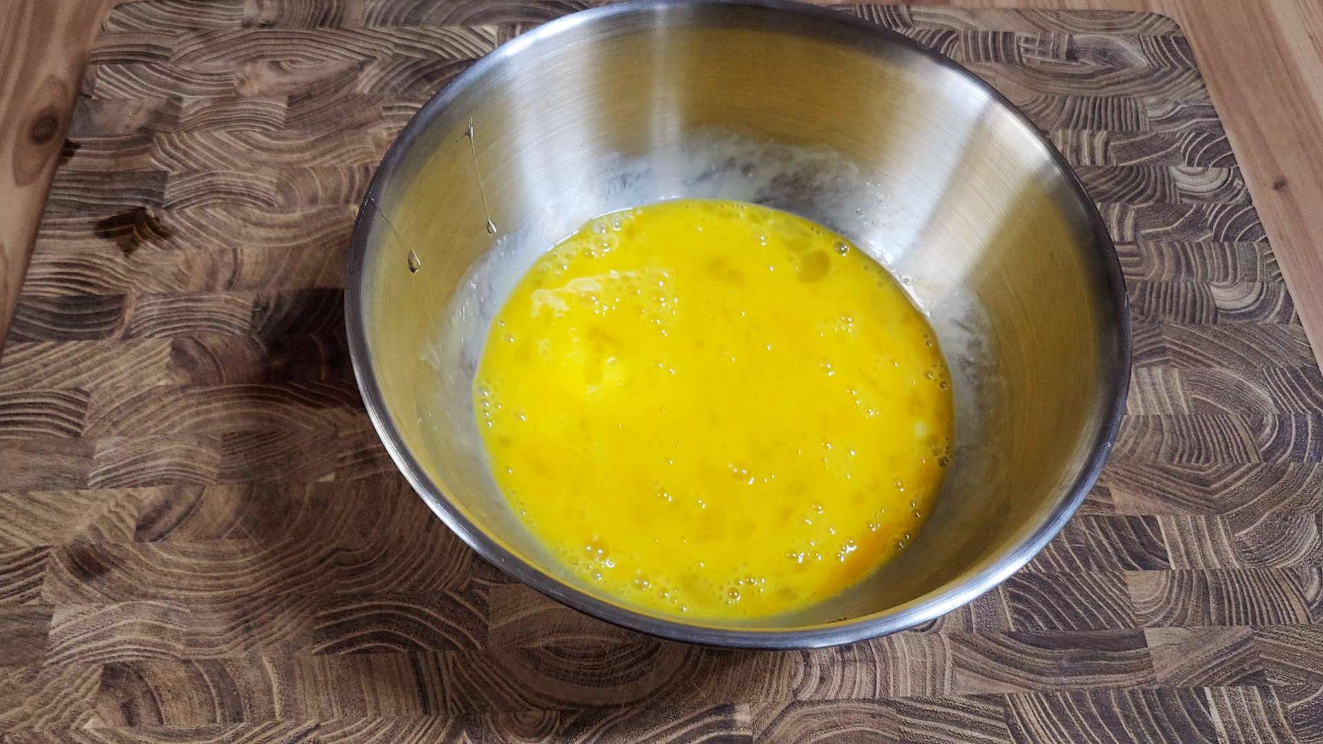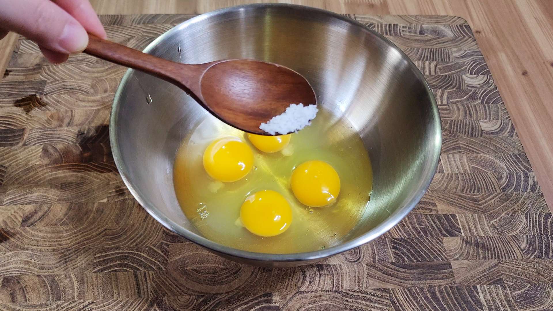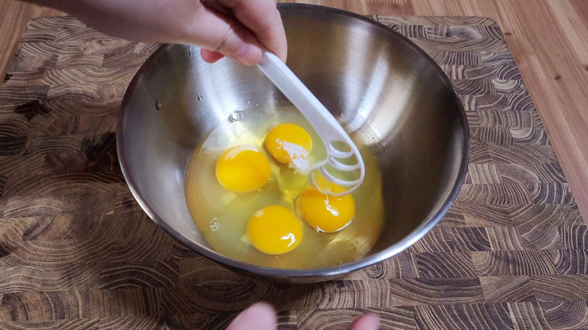 달걀 4개, 소금 0.3T를 넣고 섞어줍니다.