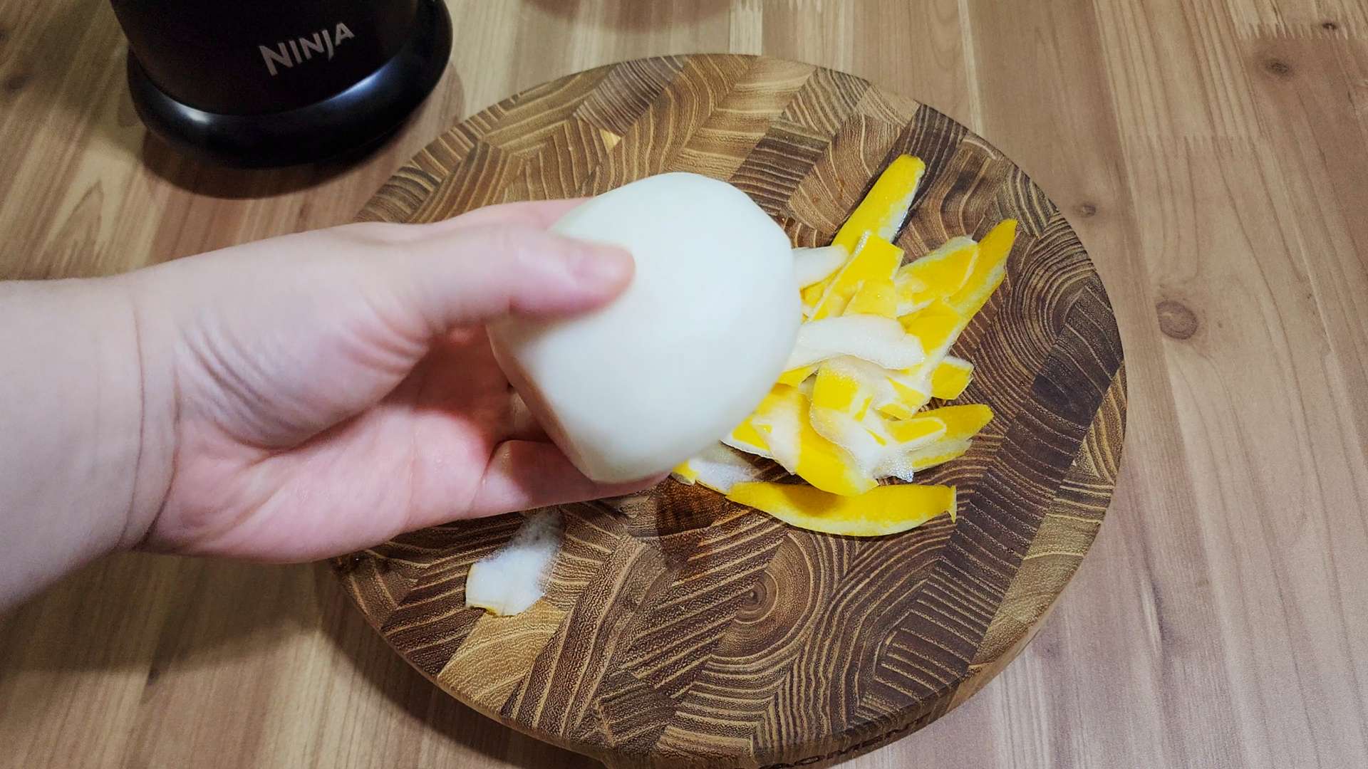 참외 3개는 꼭지를 자르고 필러로 껍질을 벗겨줍니다.