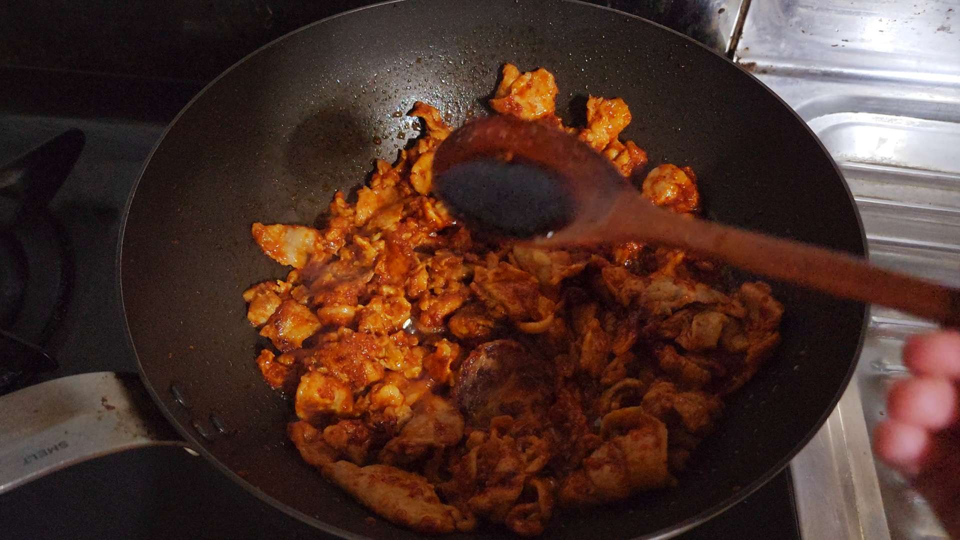 설탕 1T, 고추장 1T 넣고 볶아줍니다.