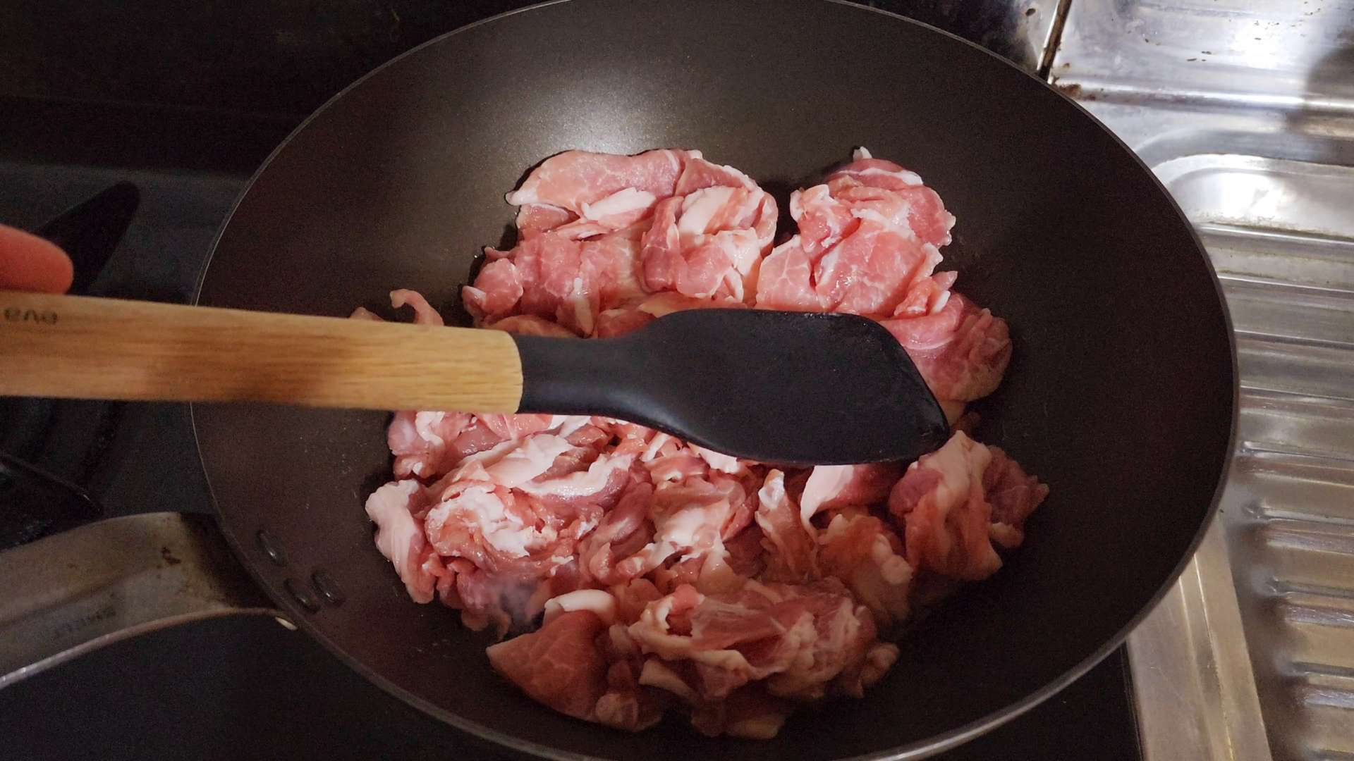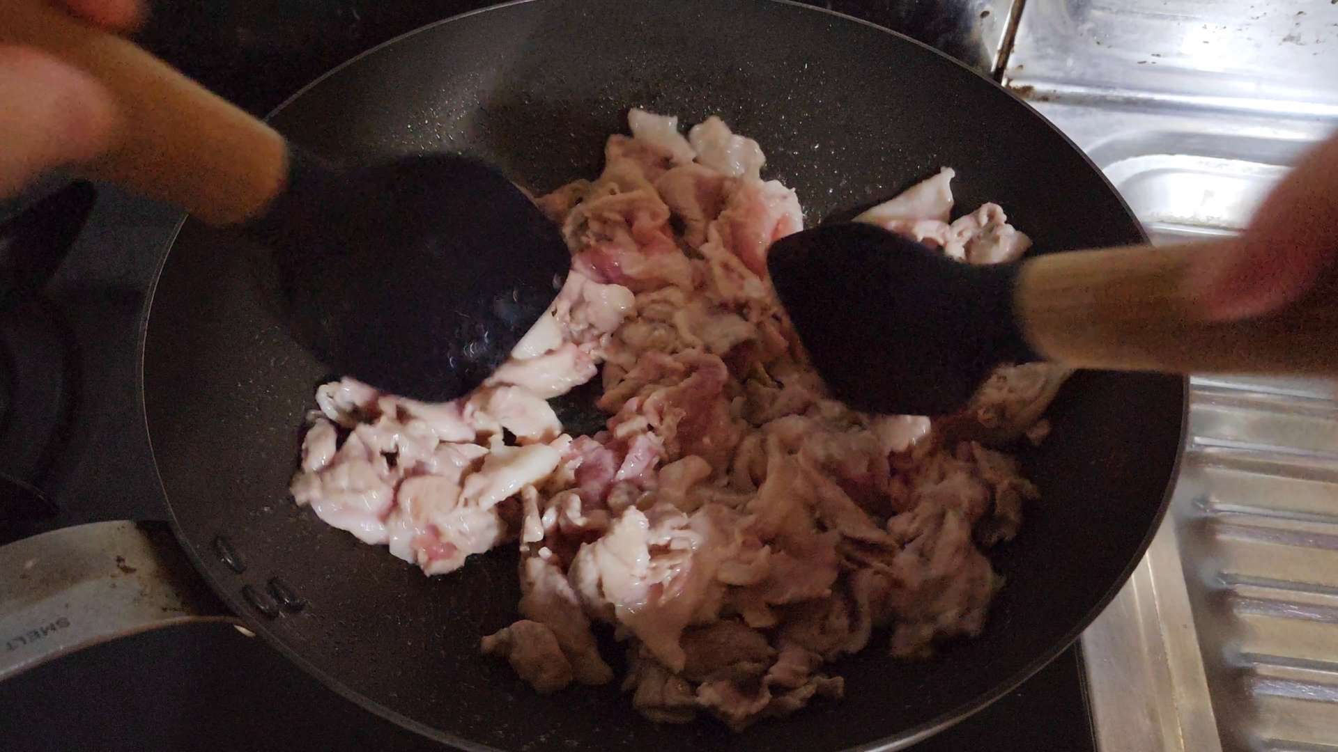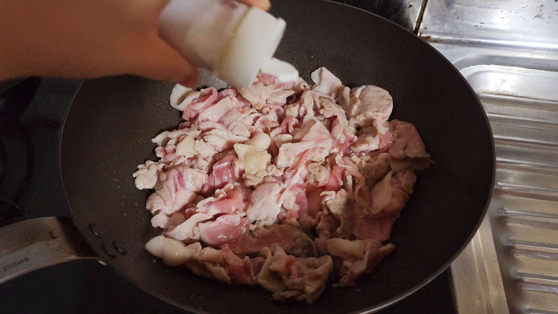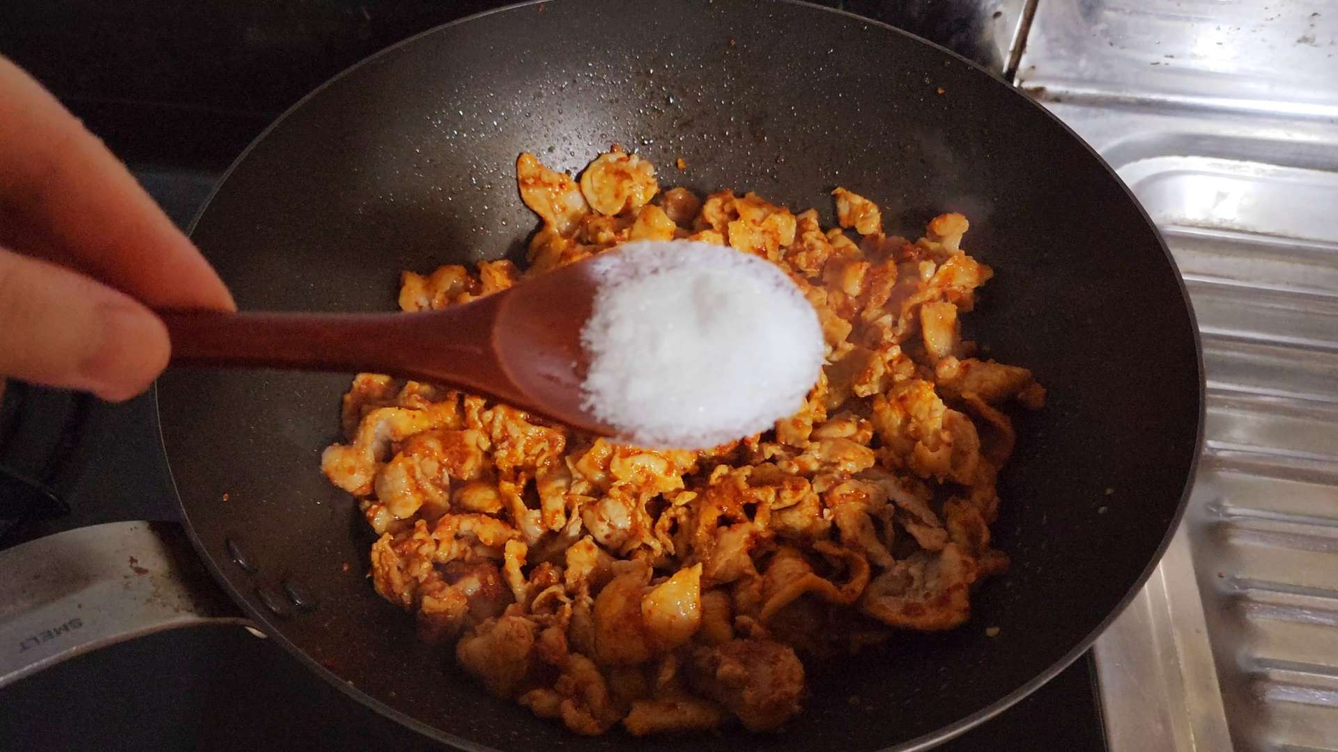 돼지고기가 반쯤 익으면 미원 1/2T를 넣고 볶아줍니다.