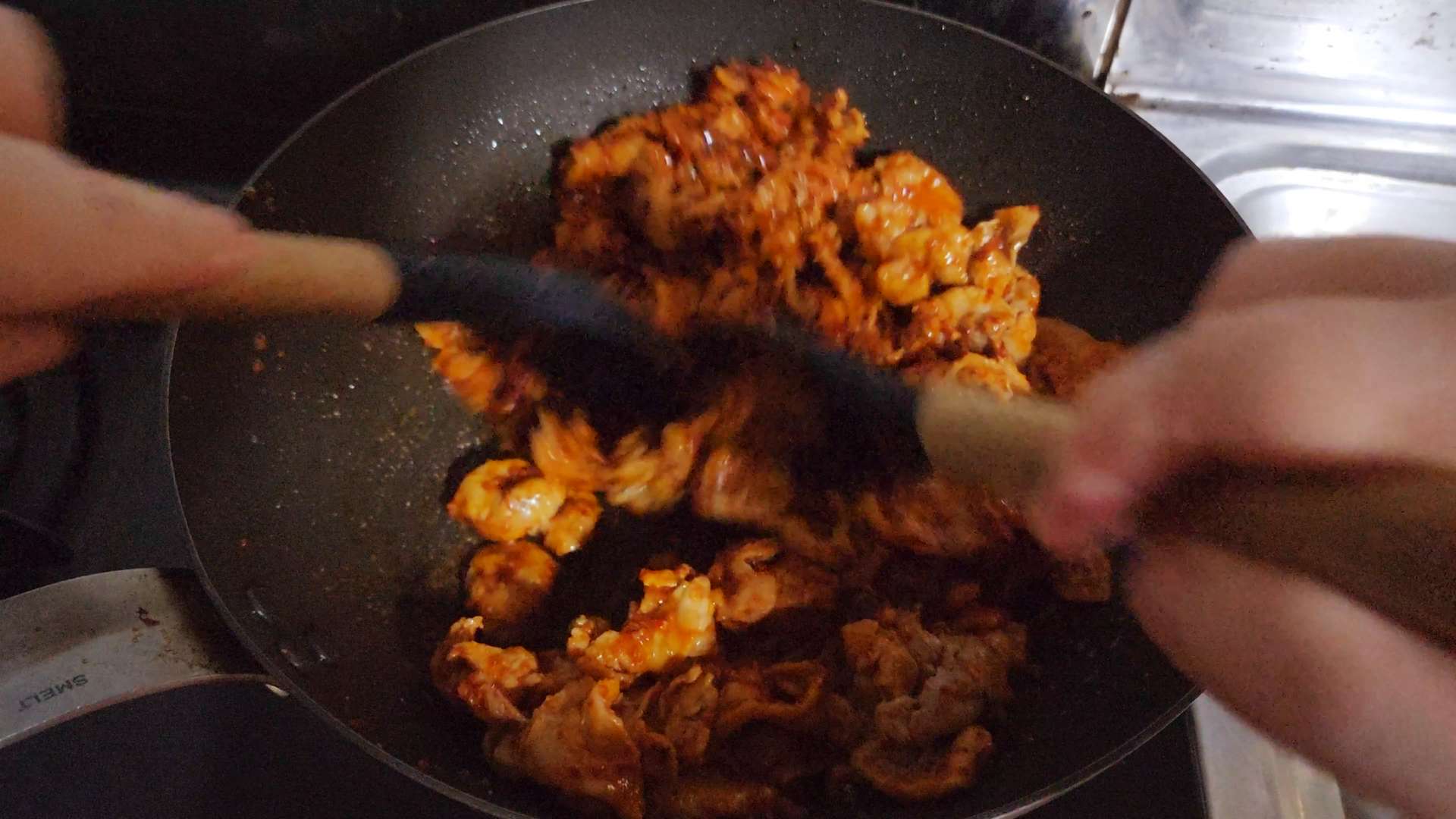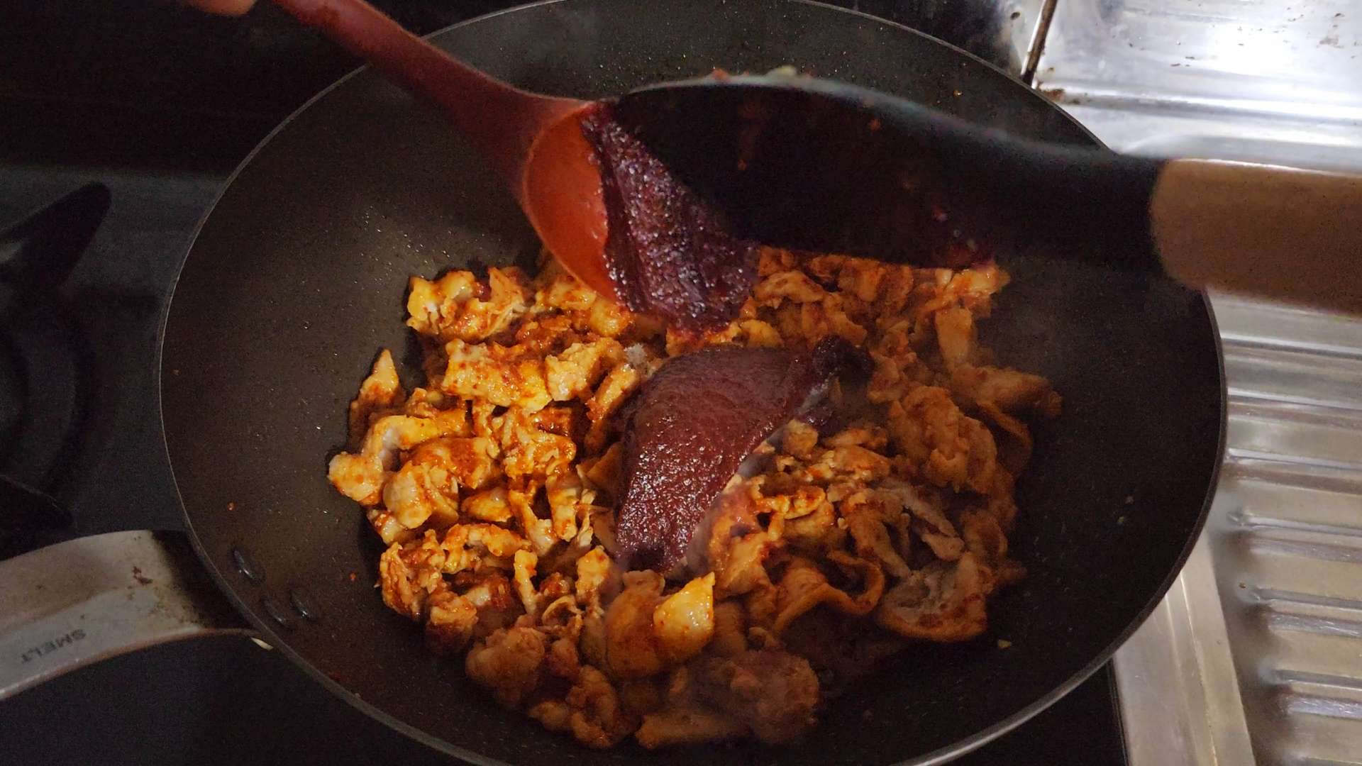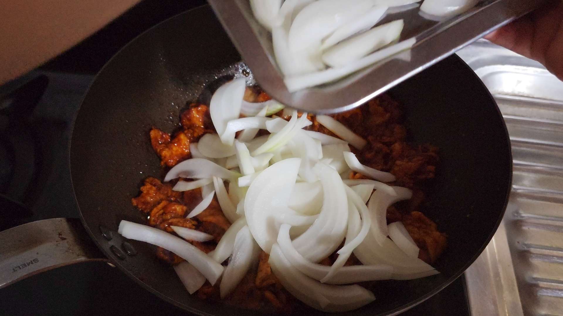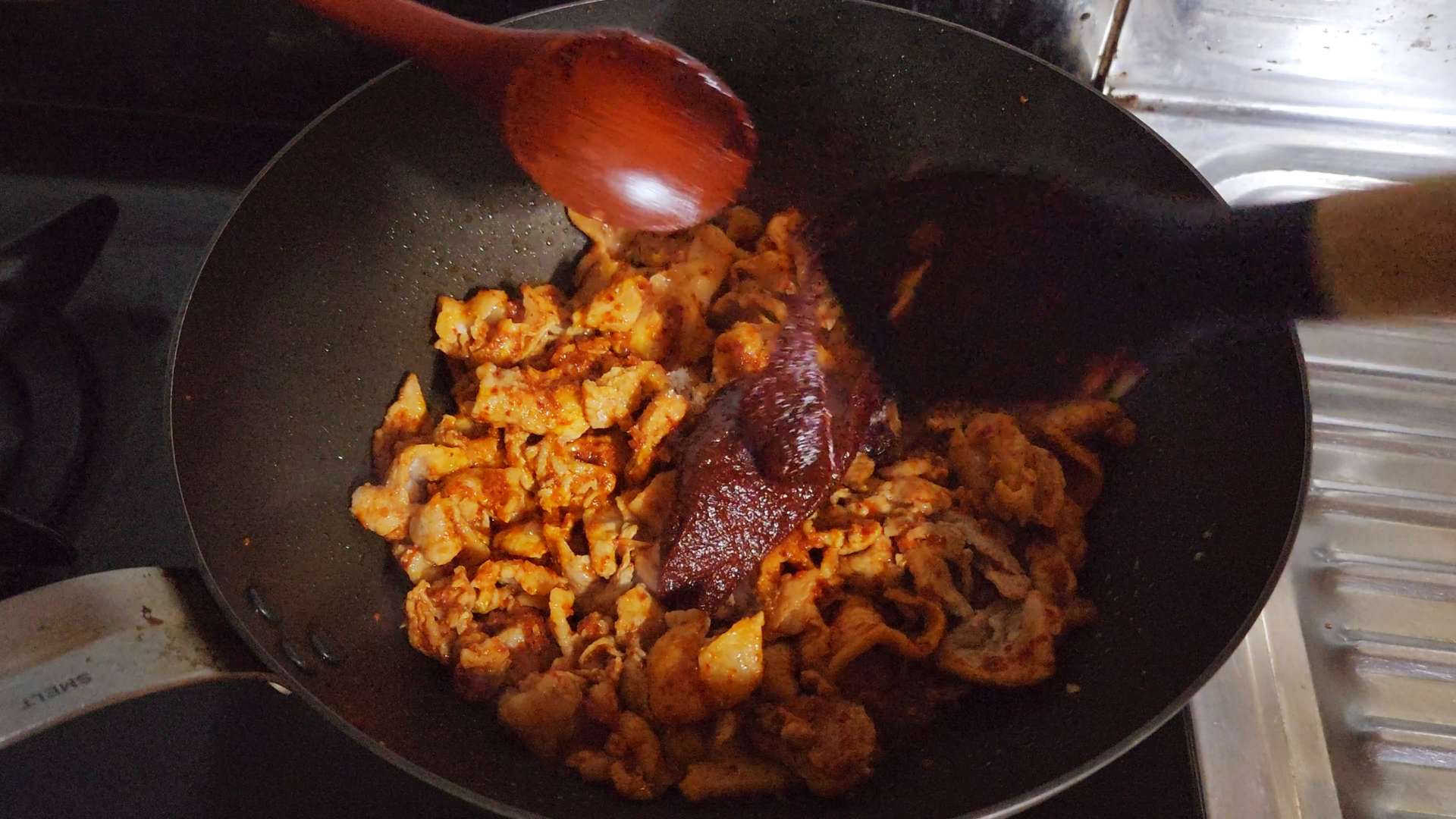 돼지고기가 반쯤 익으면 미원 1/2T를 넣고 볶아줍니다.