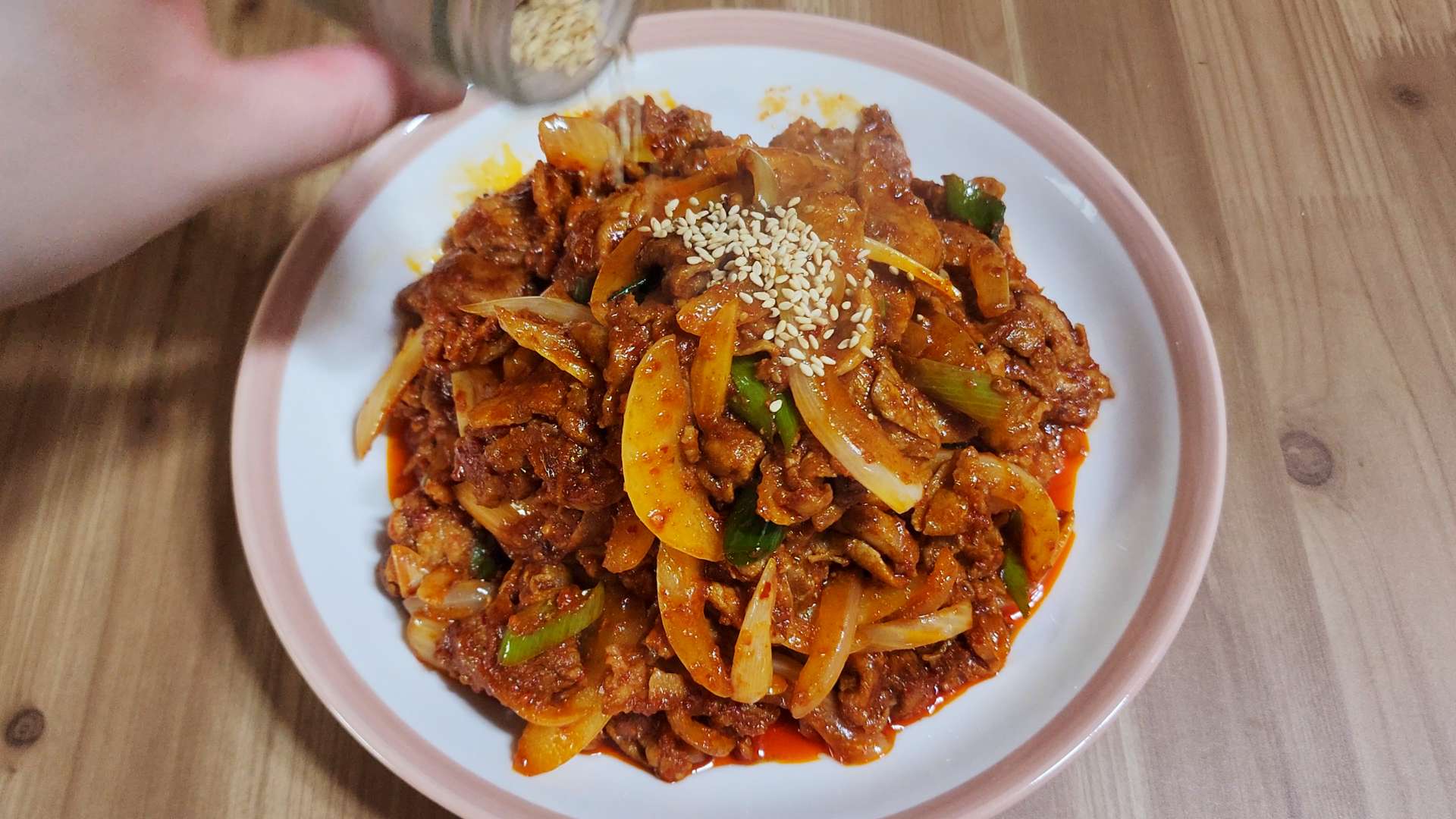 그릇에 제육볶음을 담고 통깨를 뿌려줍니다.