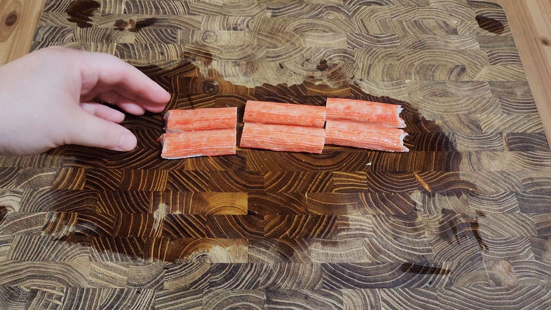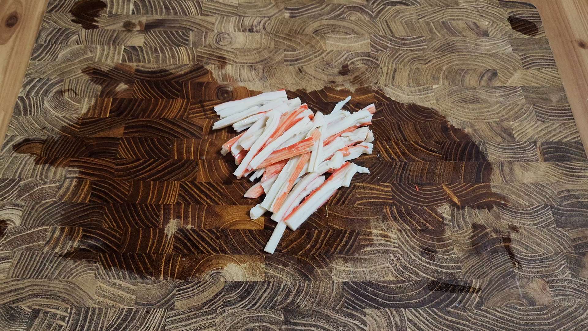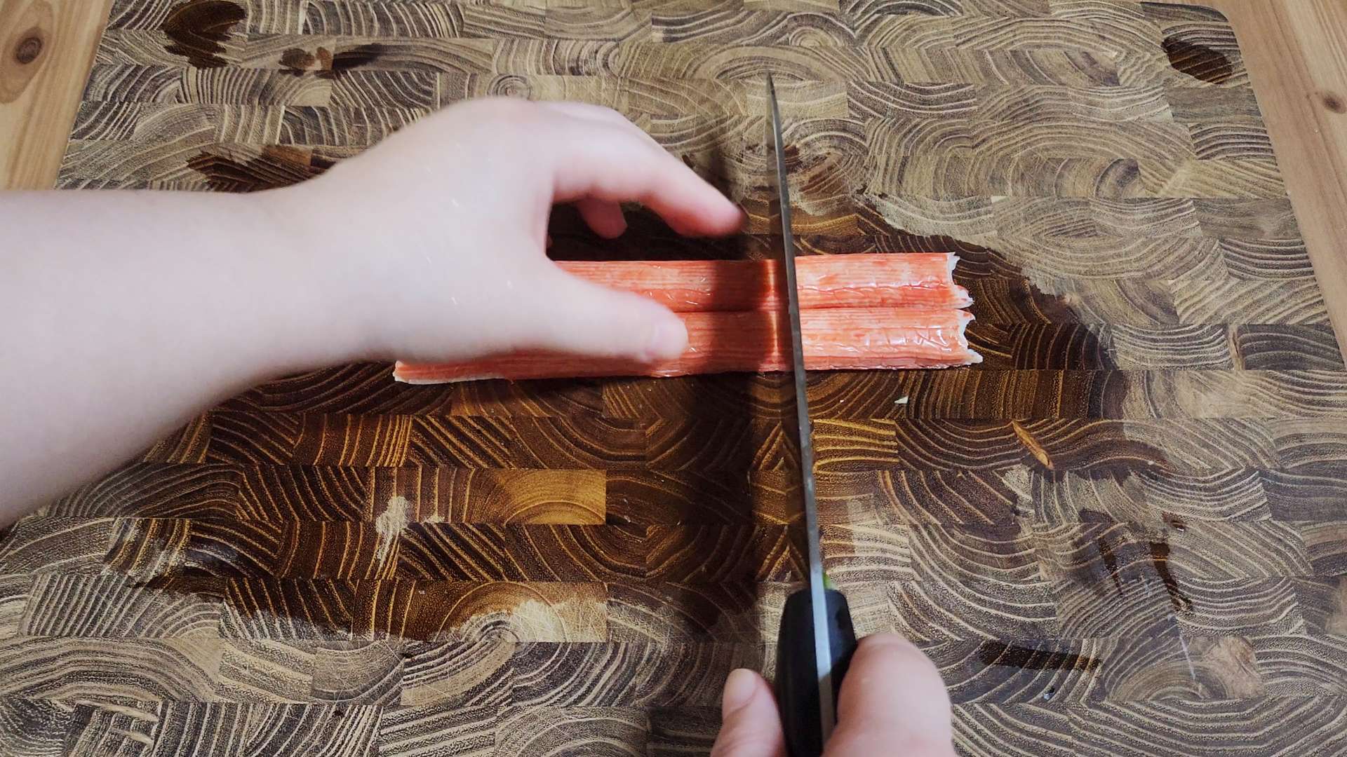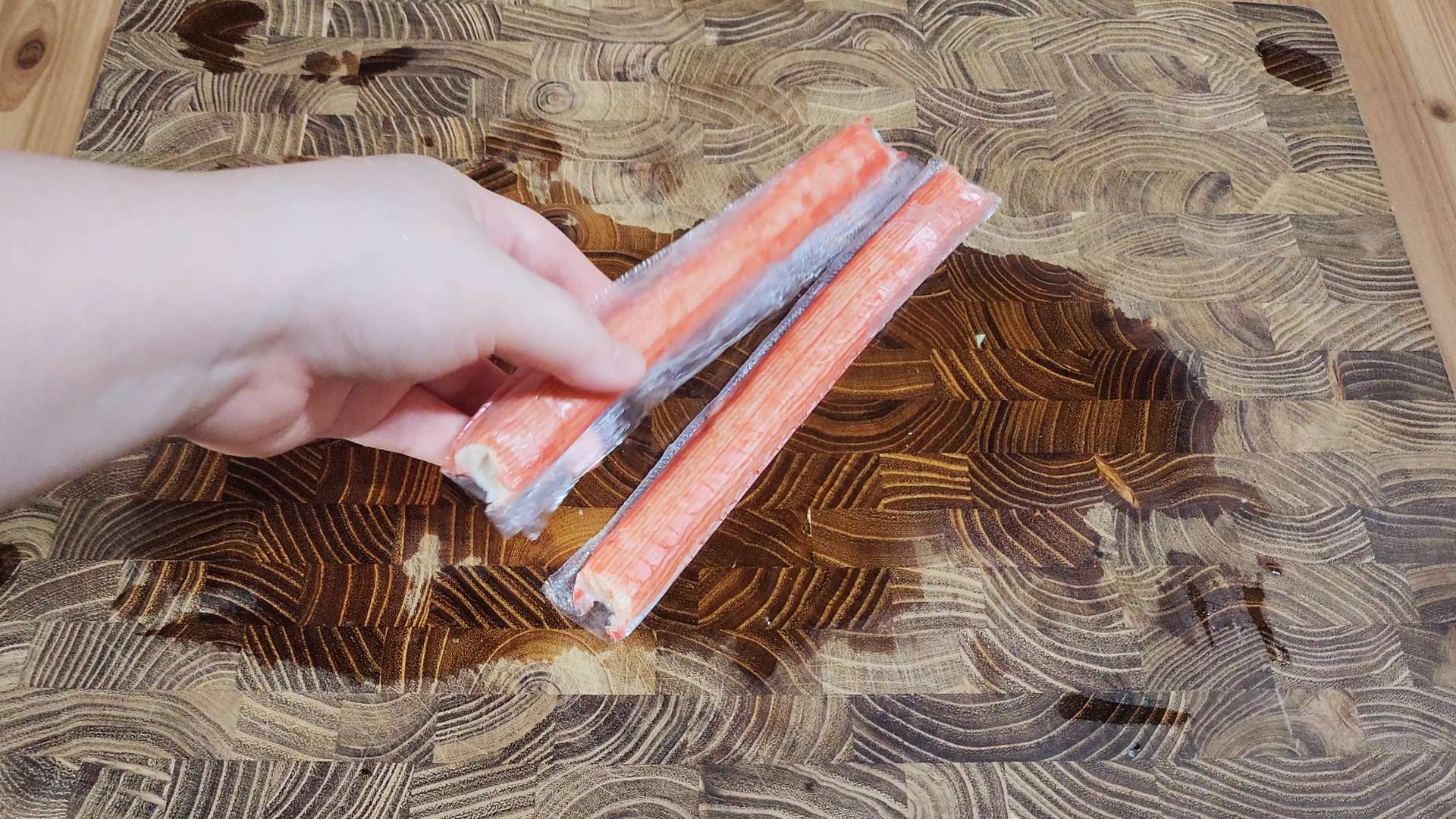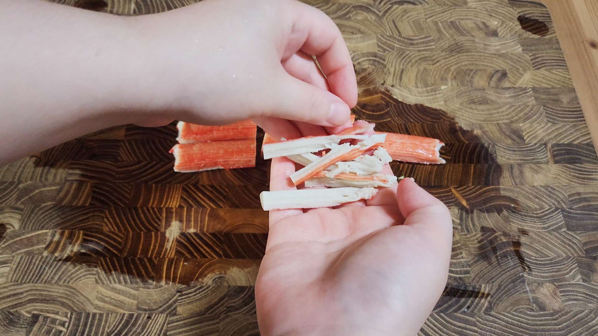 맛살 2줄은 3등분으로 자르고 잘게 찢어줍니다.