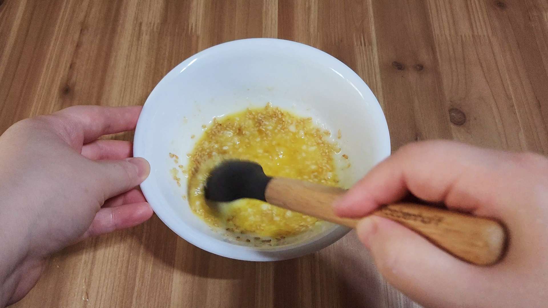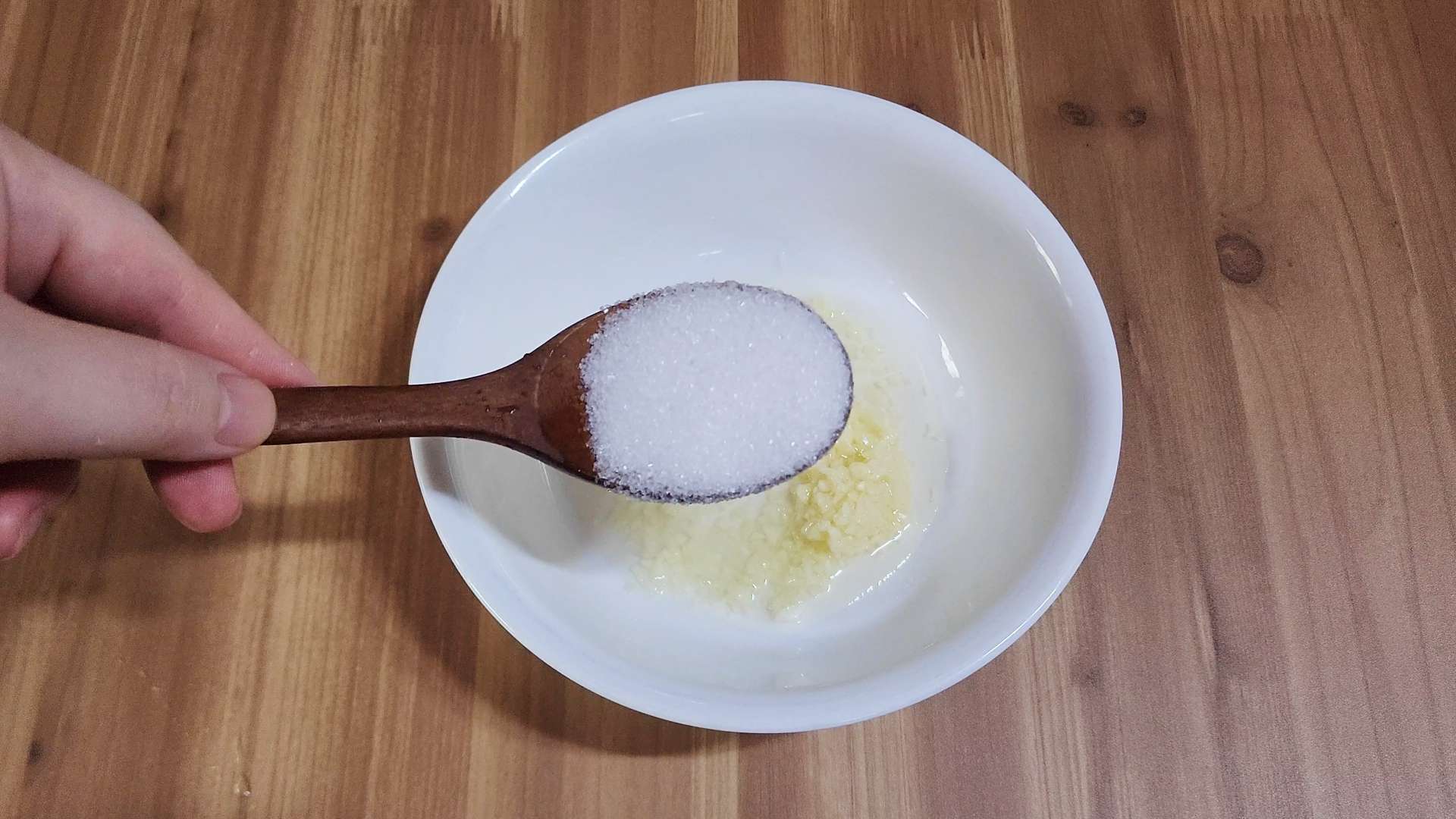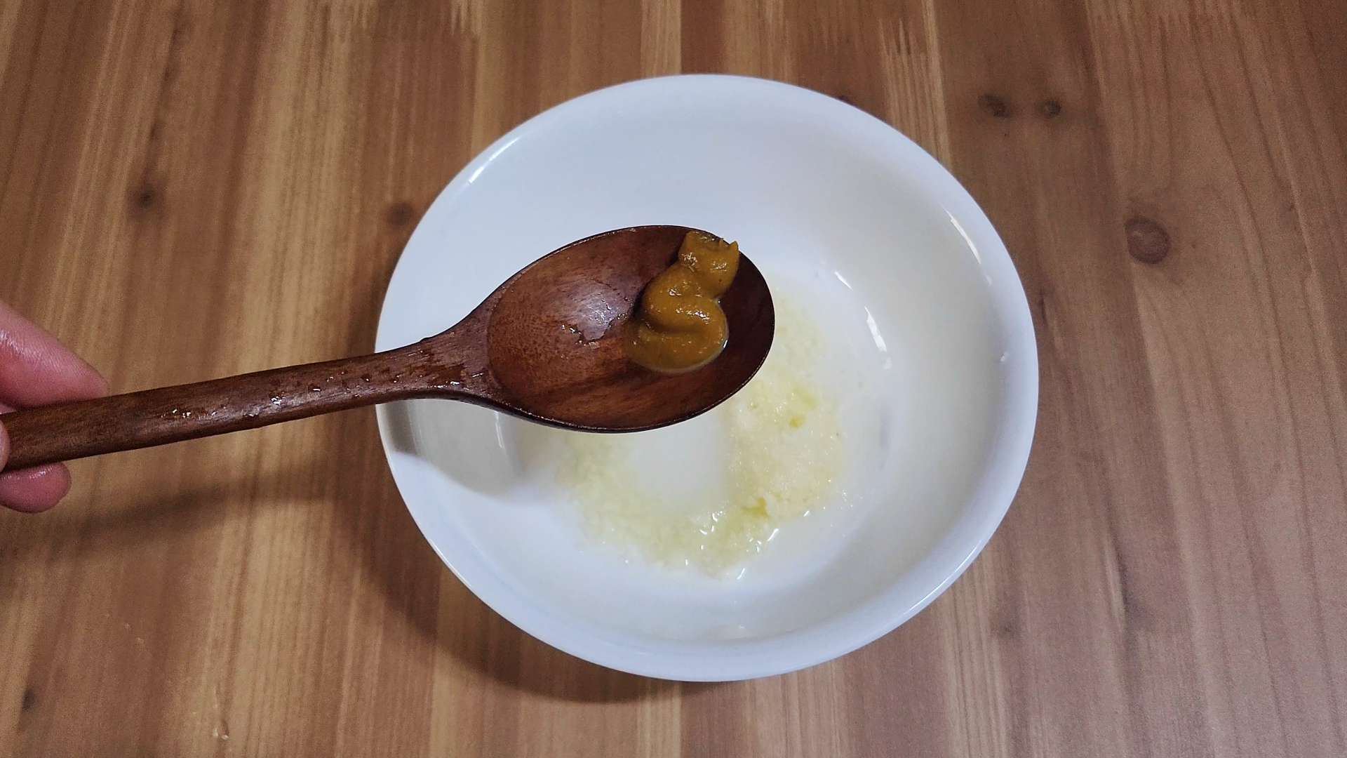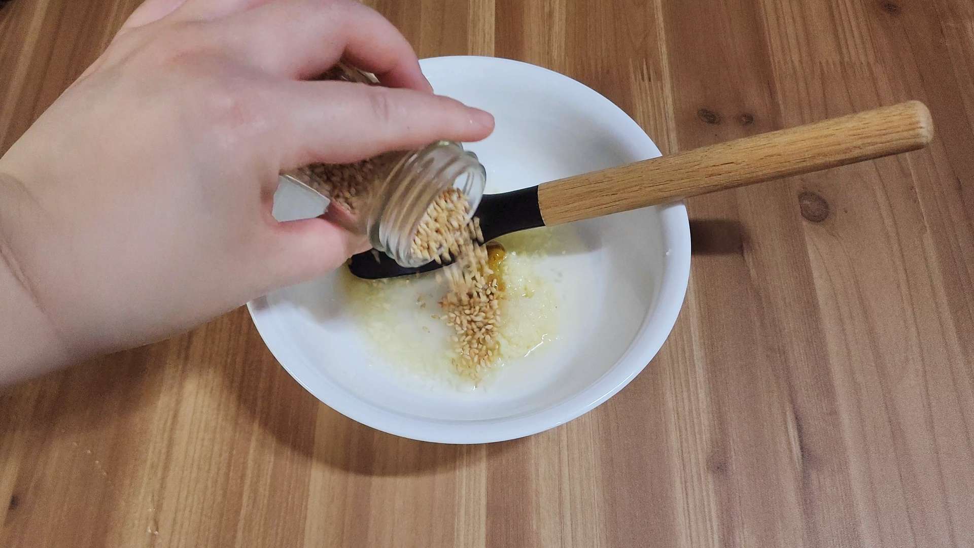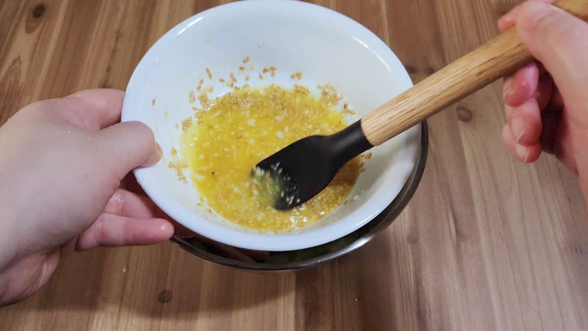 다진마늘 0.5T, 식초 2T, 레몬즙 1T, 설탕 1T, 소금 0.3t, 연겨자 0.3t, 통깨를 넣고 섞어 겨자소스를 만들어줍니다.