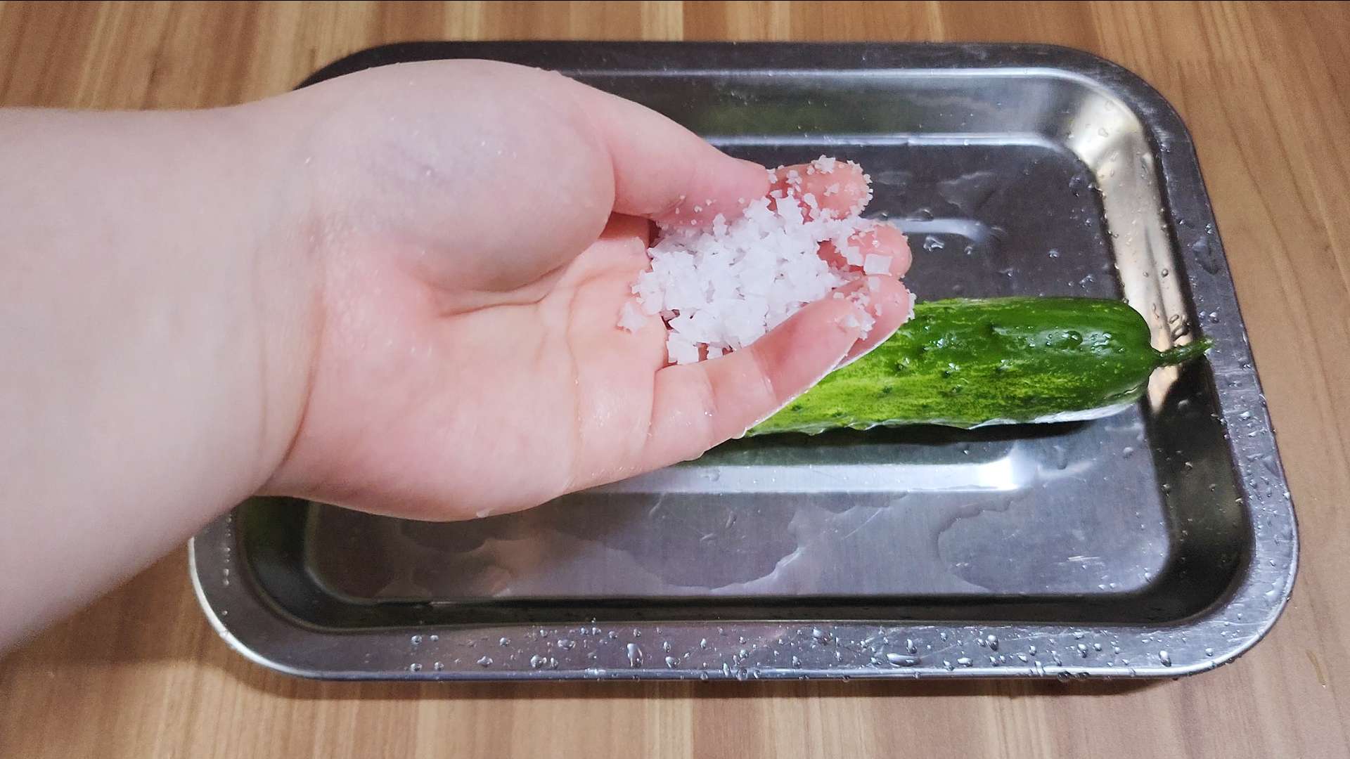 재료: 오이 1개, 맛살 2줄, 굵은소금 한줌 (세척용)
