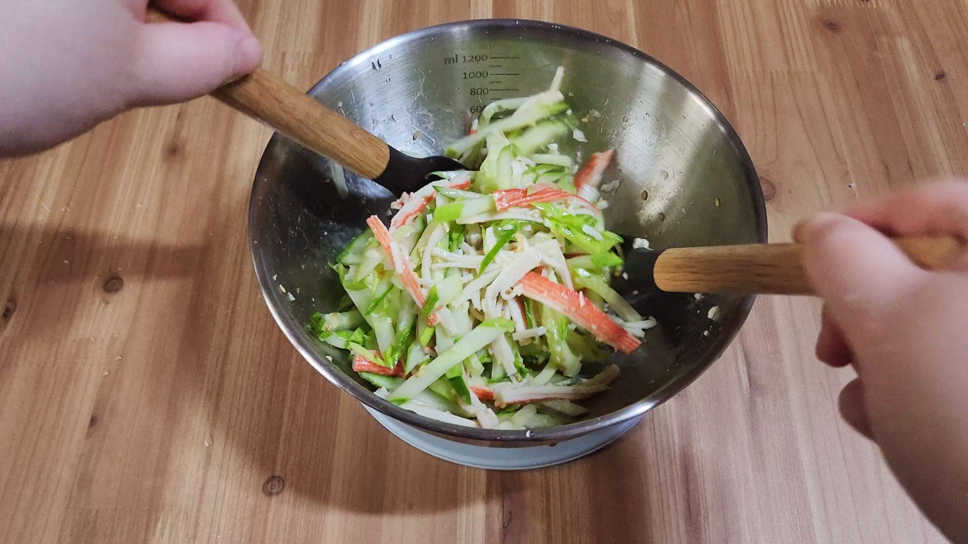 볼에 오이, 맛살, 겨자소스를 넣고 버무려줍니다.