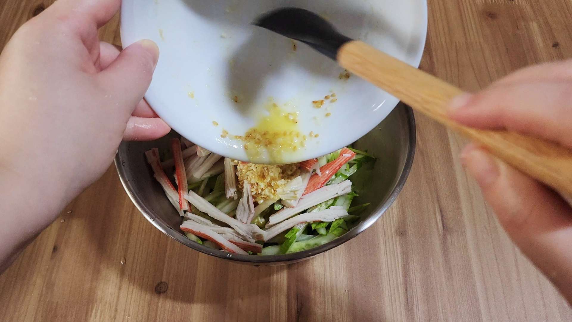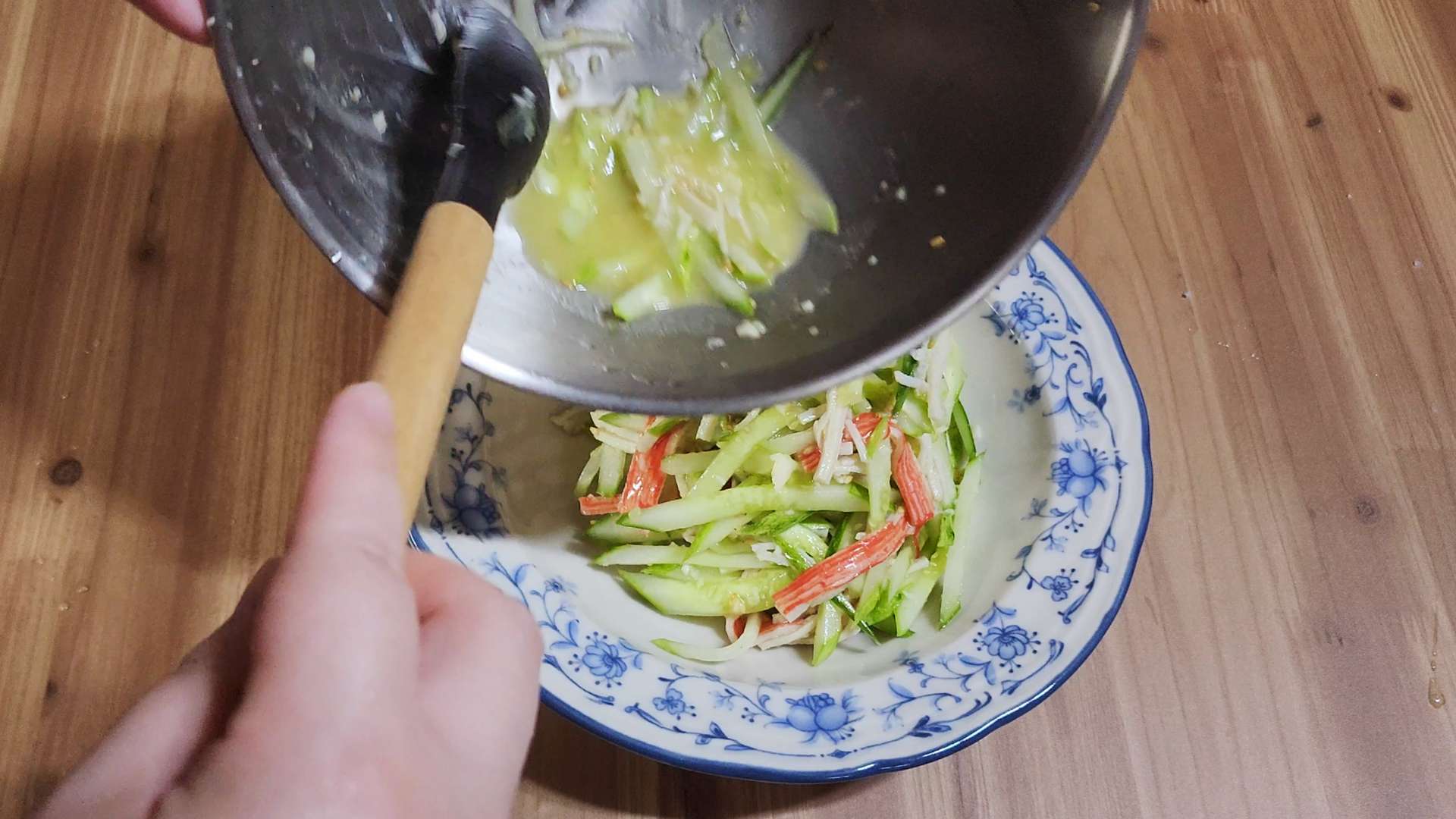 그릇에 오이맛살냉채를 담고 남은 소스까지 뿌려줍니다.