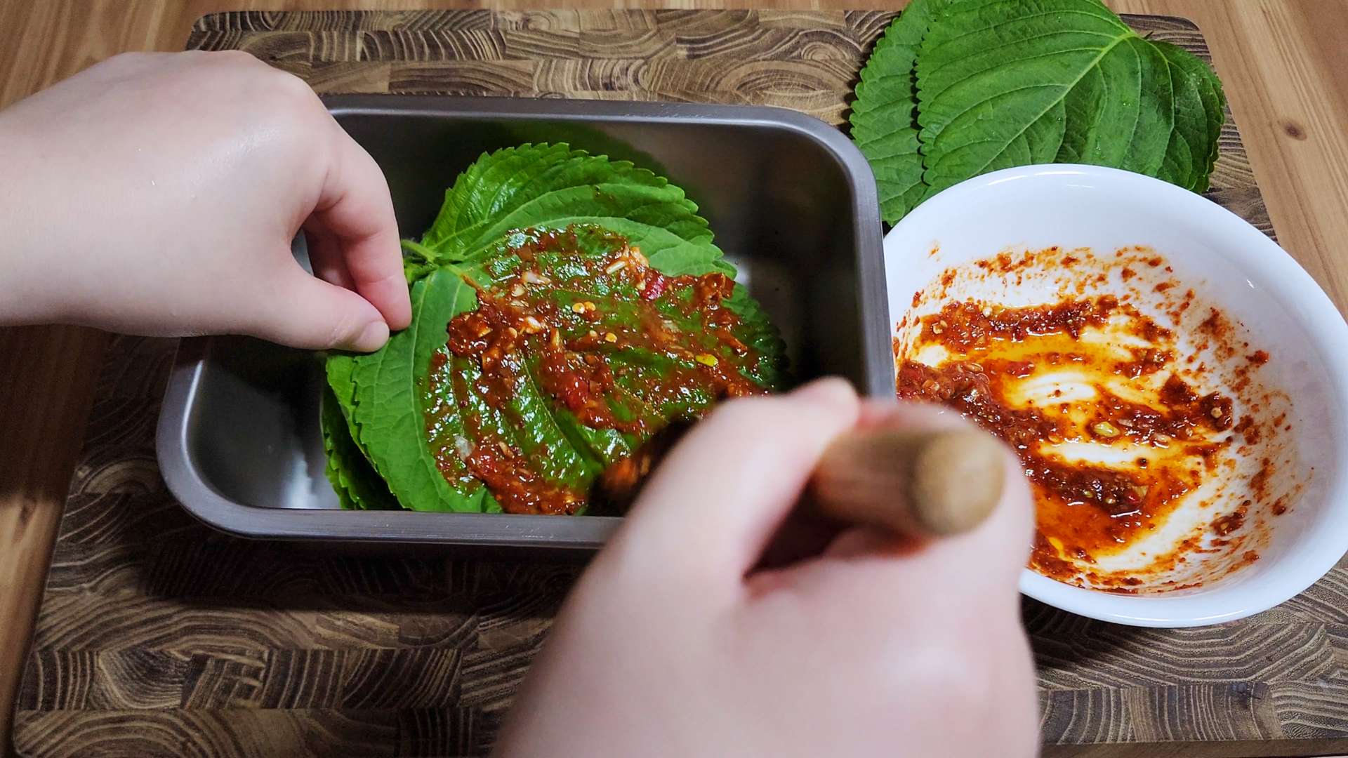 밀폐용기에 깻잎 2장을 넣고 양념장 1T를 발라가면서 켜켜이 쌓아줍니다.