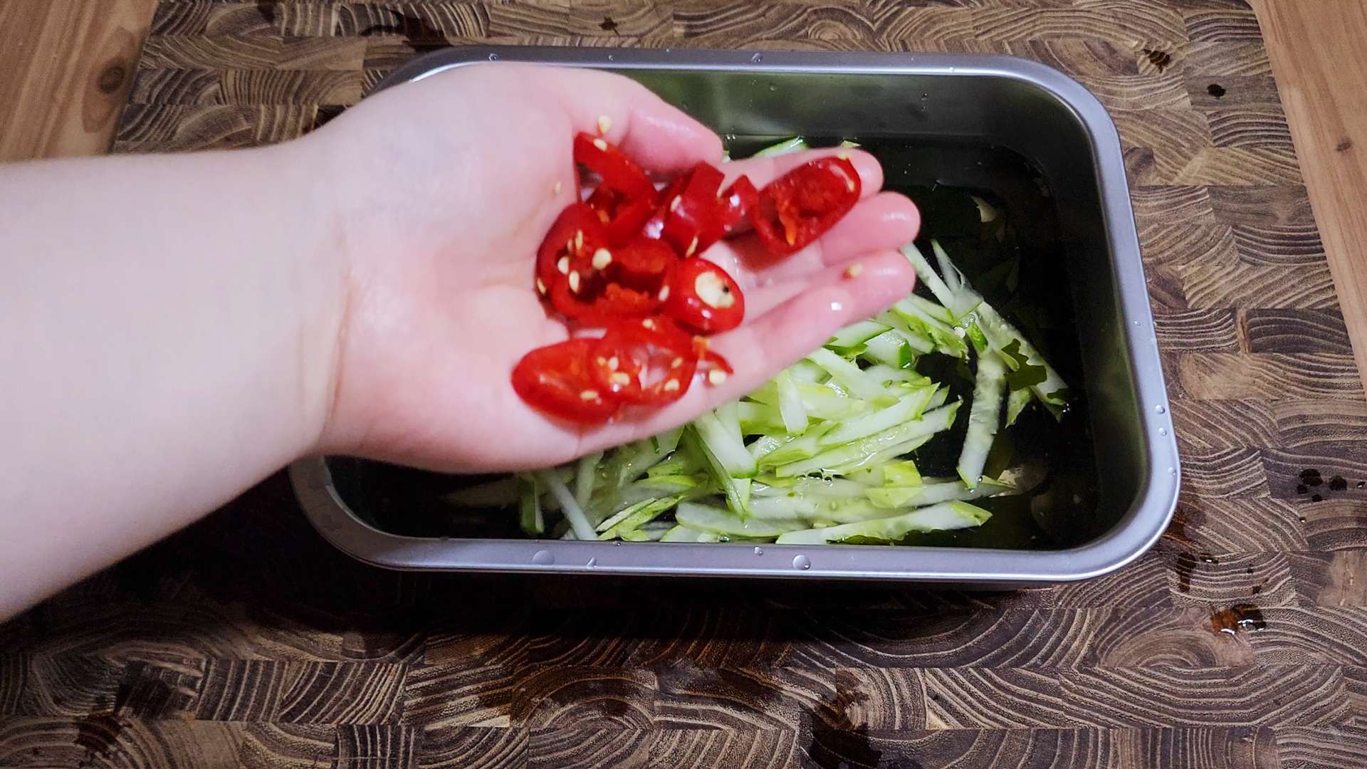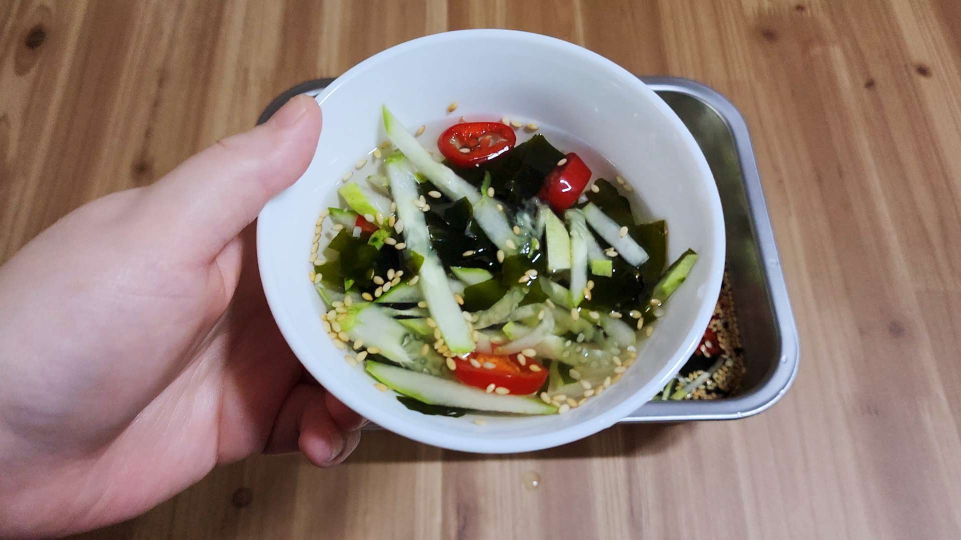 재료: 오이 1개, 건미역 15g, 홍고추 1개, 통깨