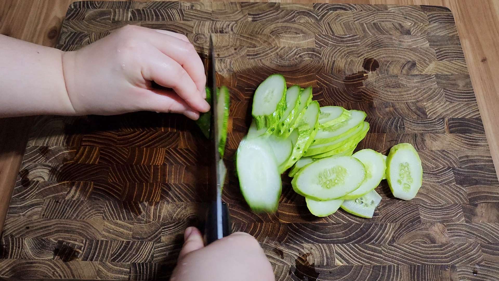 오이는 깨끗이 씻고 양끝을 자른 후 채썰어 줍니다.