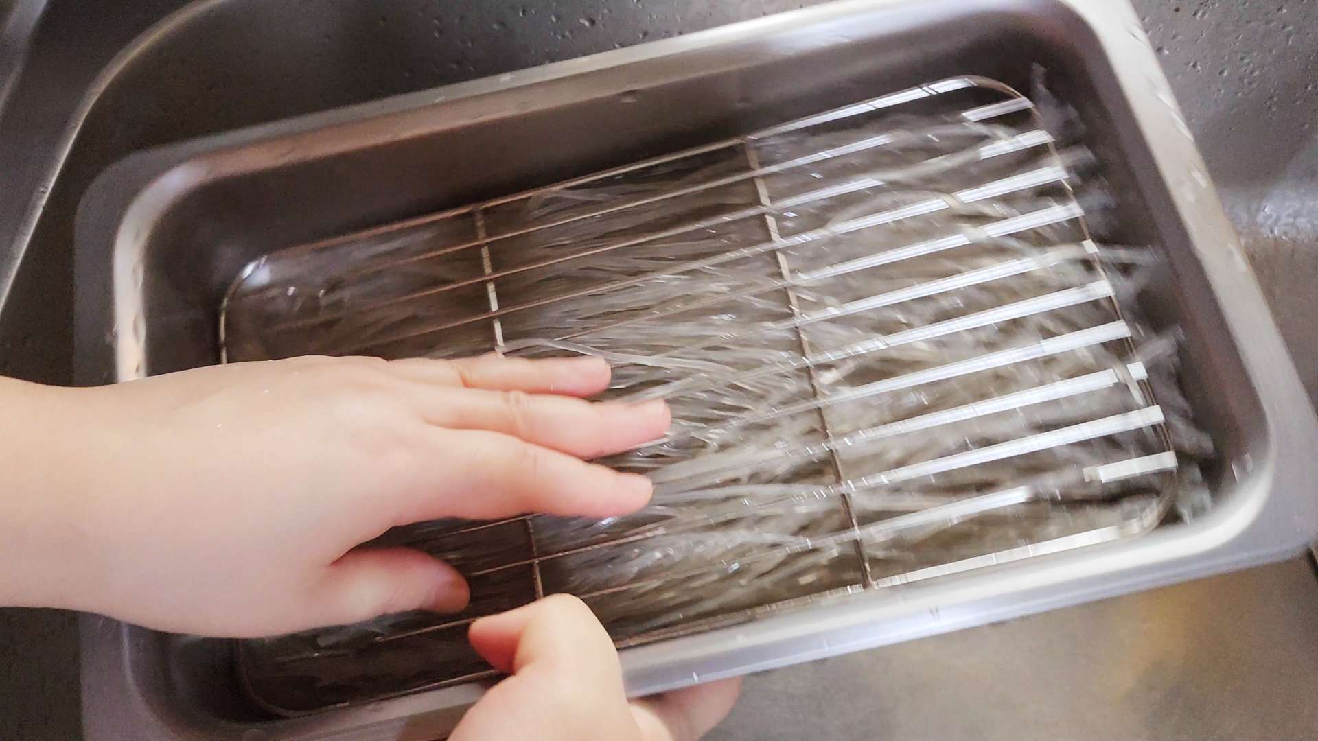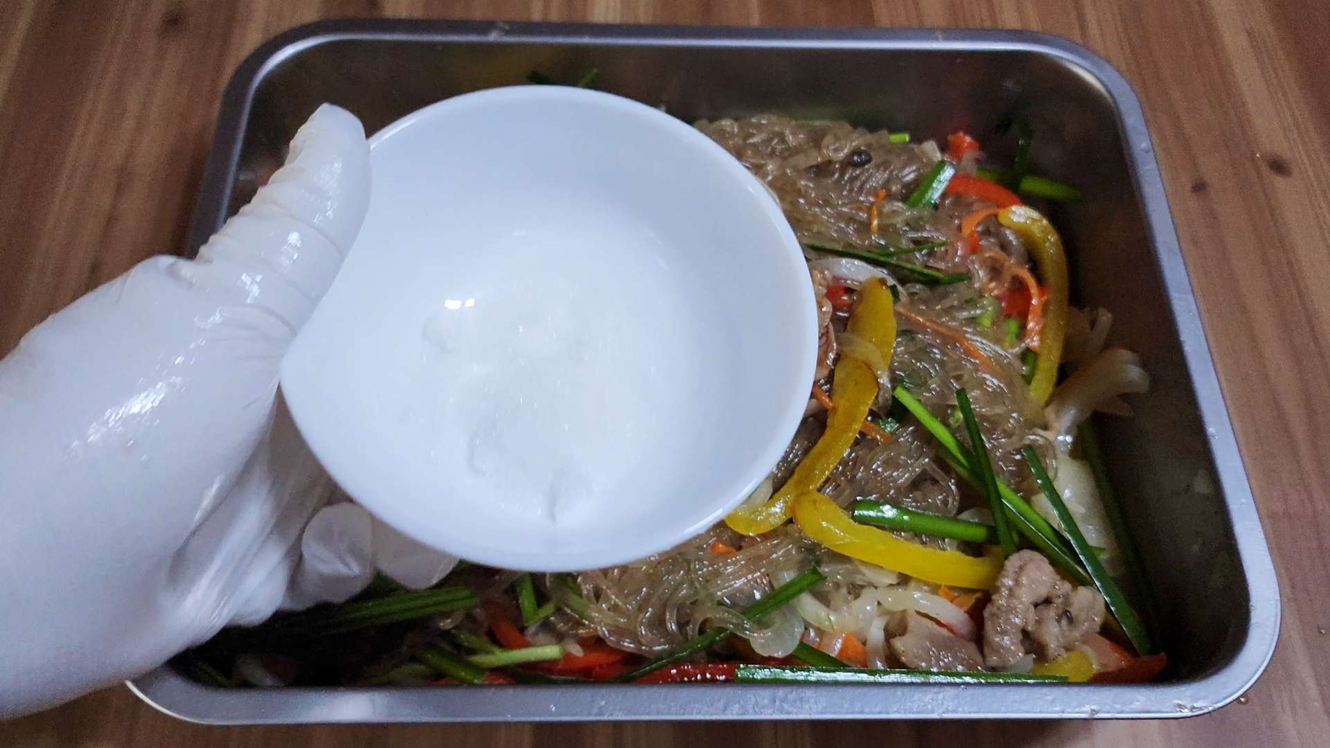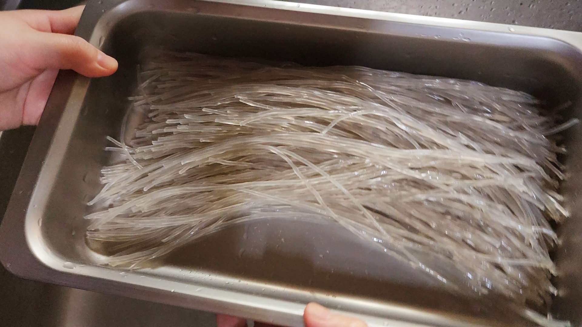 잘 불려진 당면은 와이드채망으로 눌러 물기를 제거해줍니다.