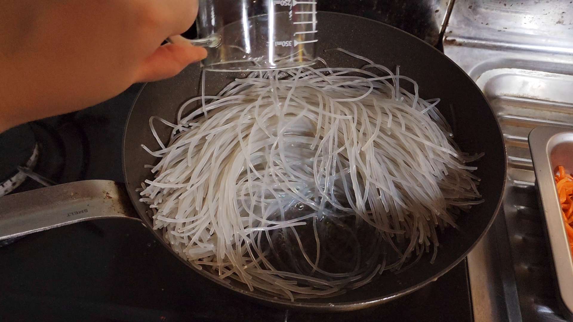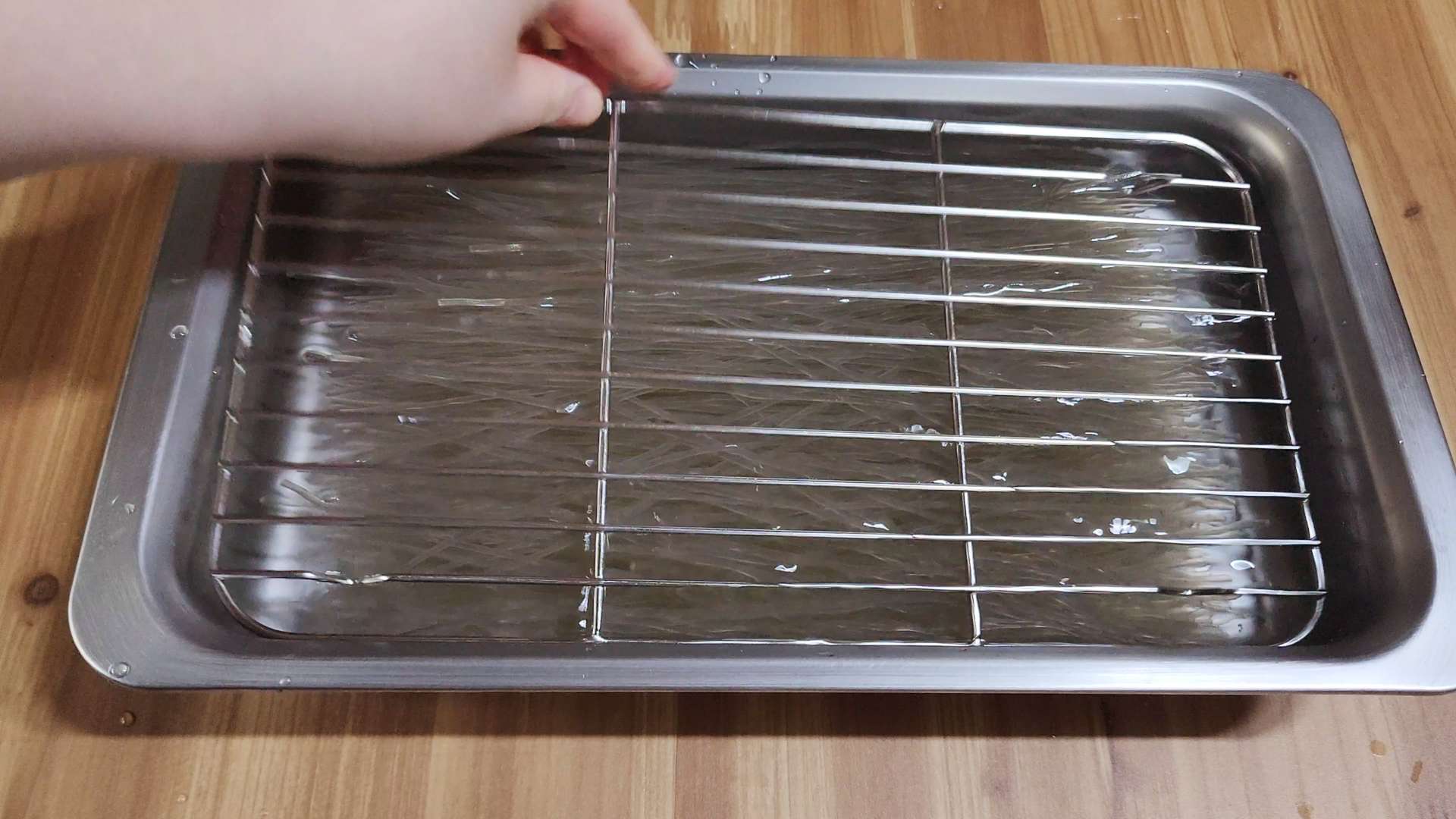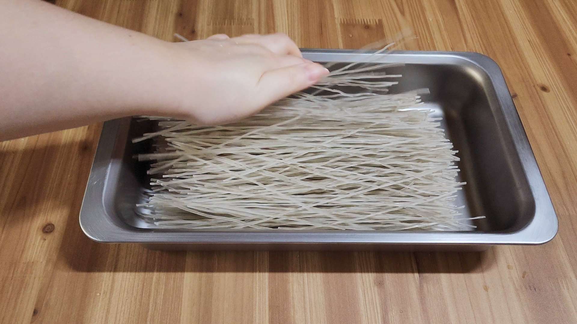 잘 불려진 당면은 와이드채망으로 눌러 물기를 제거해줍니다.