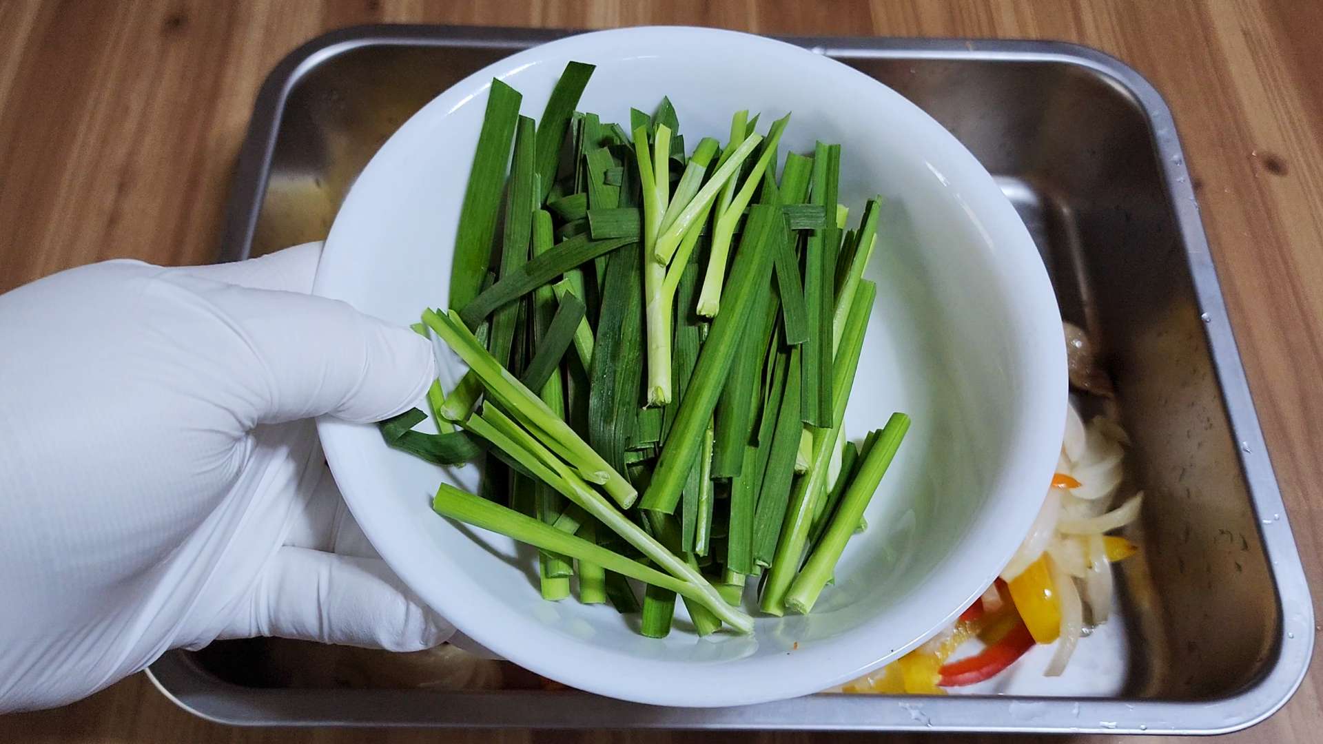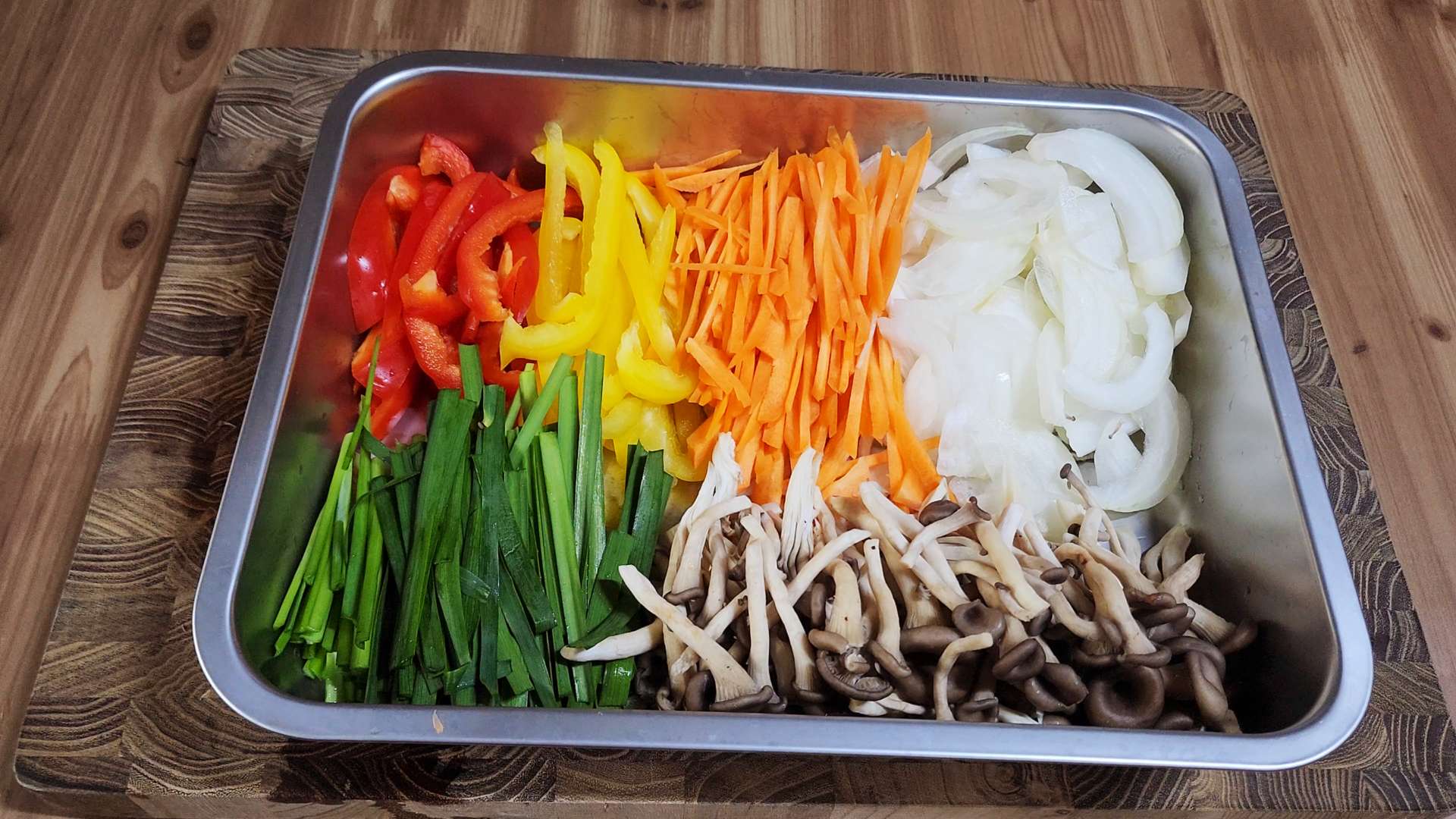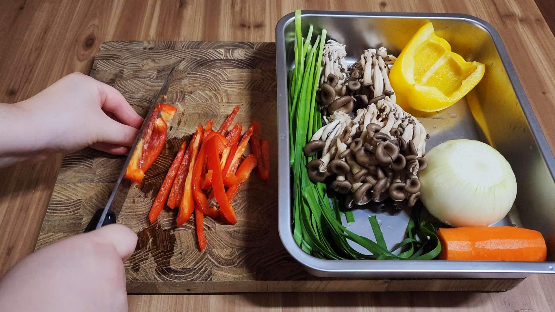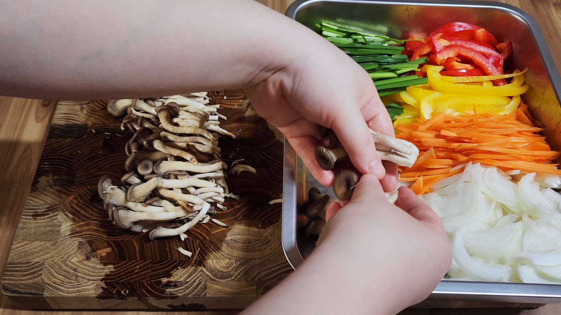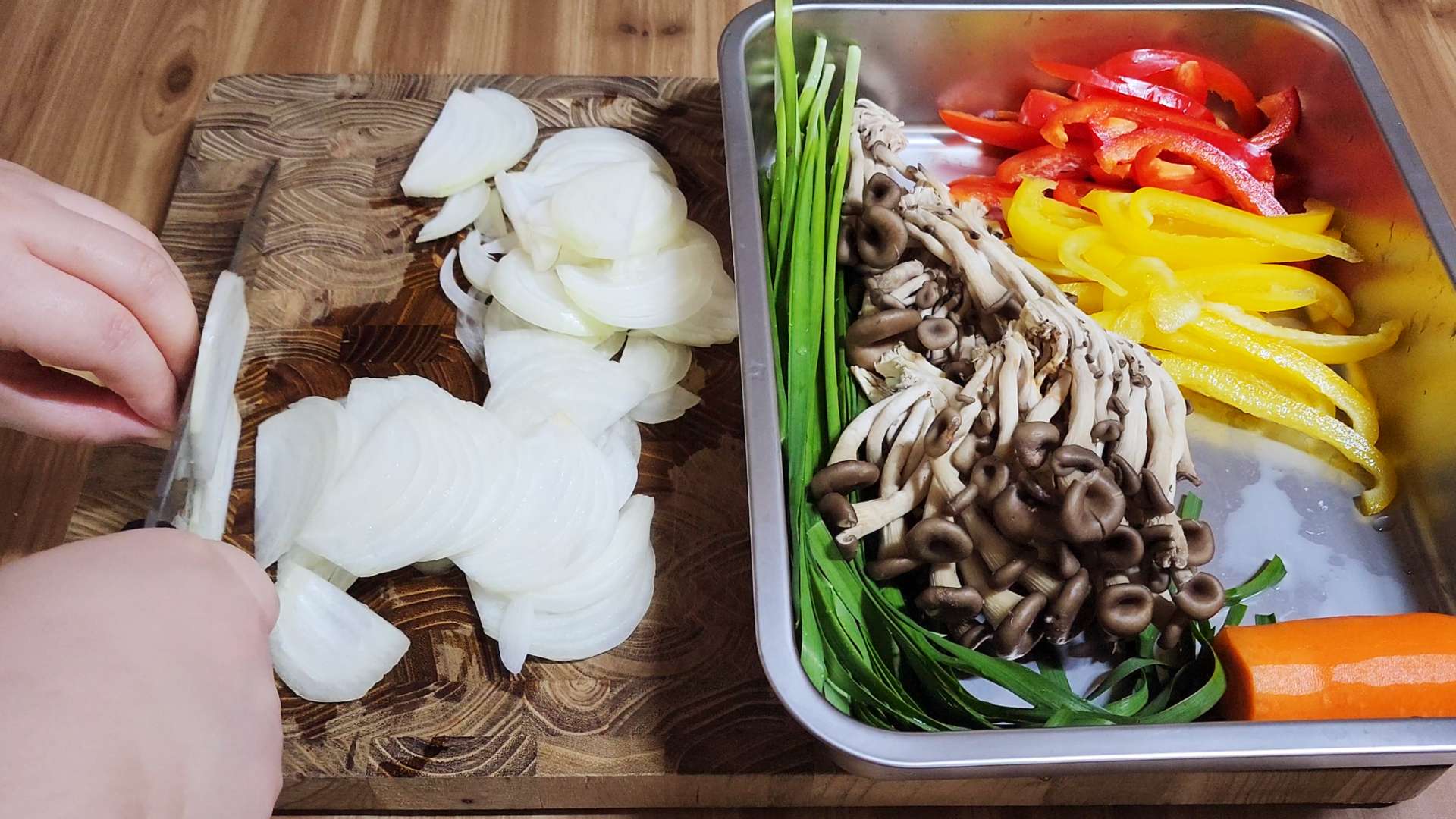 파프리카, 양파, 당근, 부추, 느타리버섯 등 기호에 맞게 채썰어 준비해주세요.