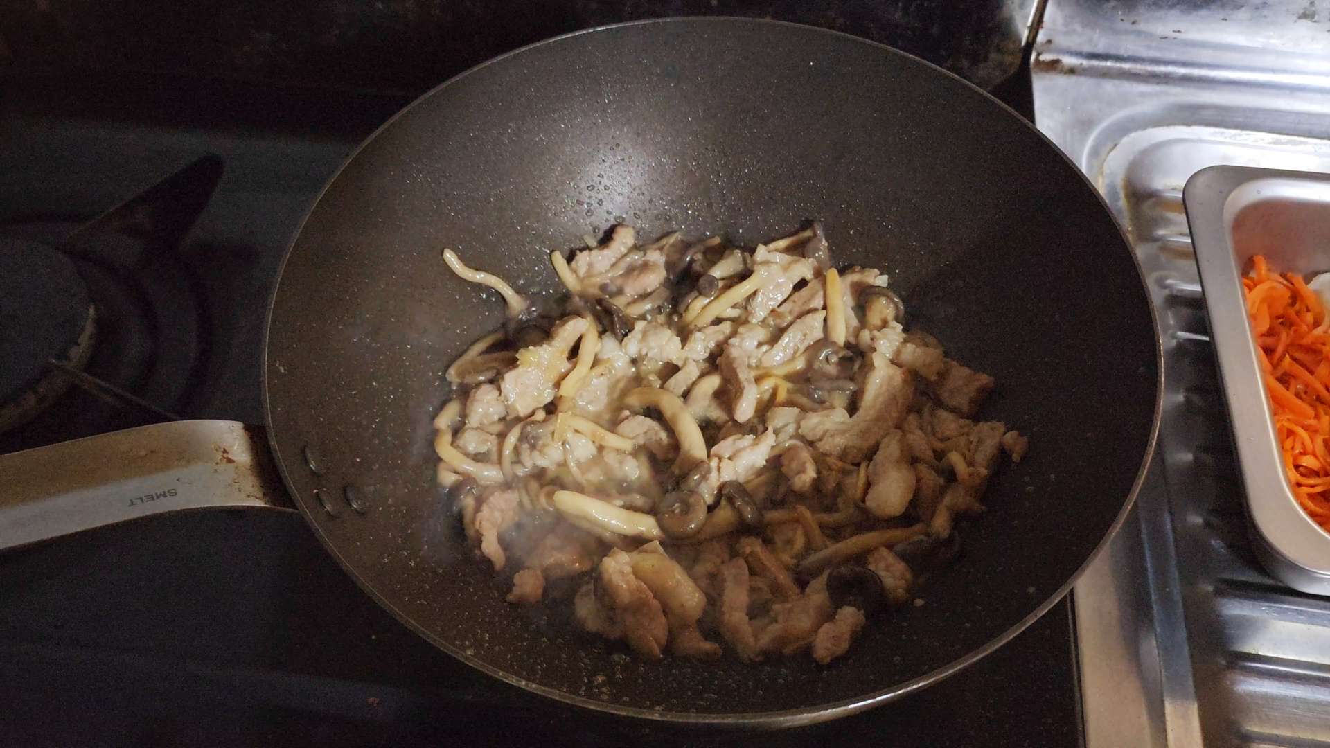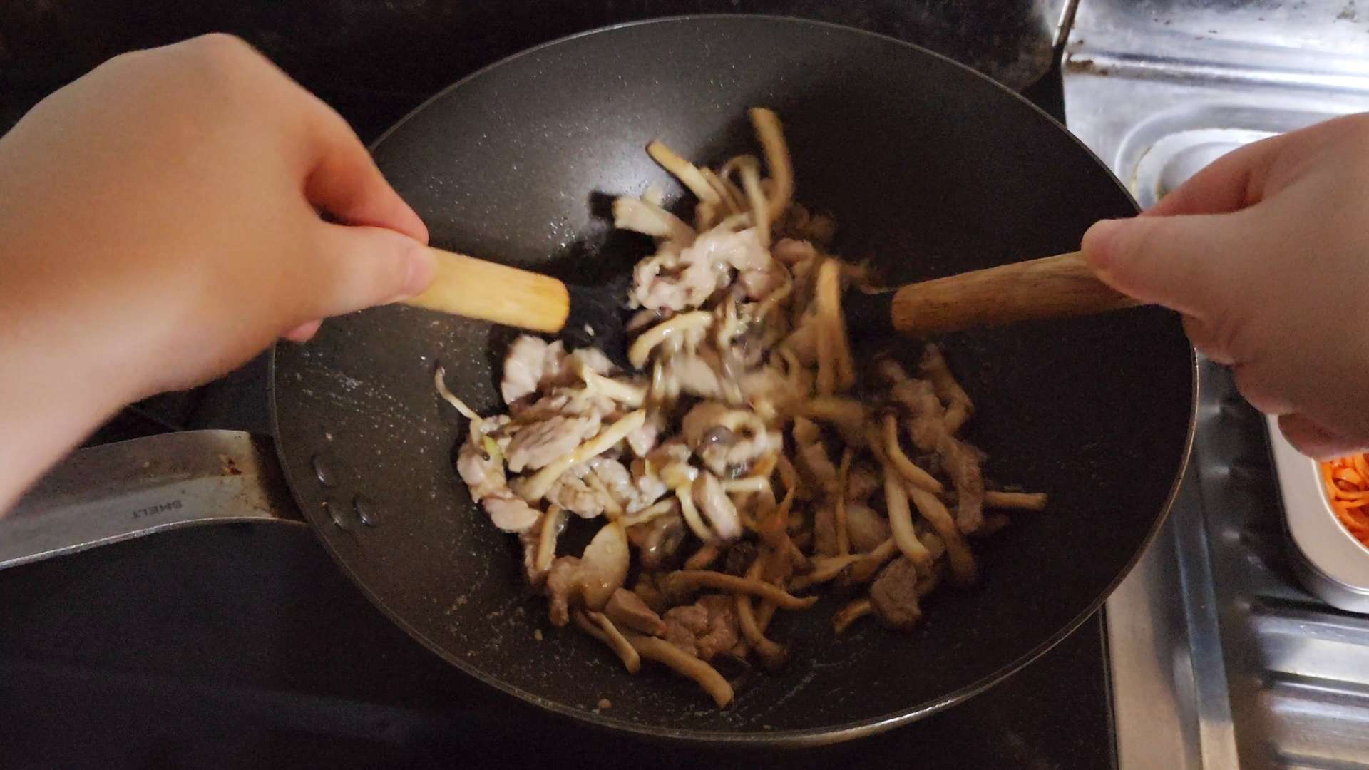 목살이 반쯤 익으면 느타리버섯을 넣고 볶아줍니다.