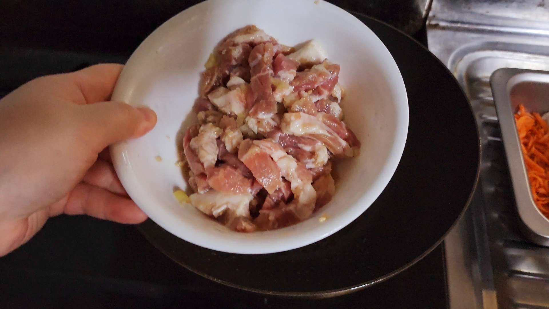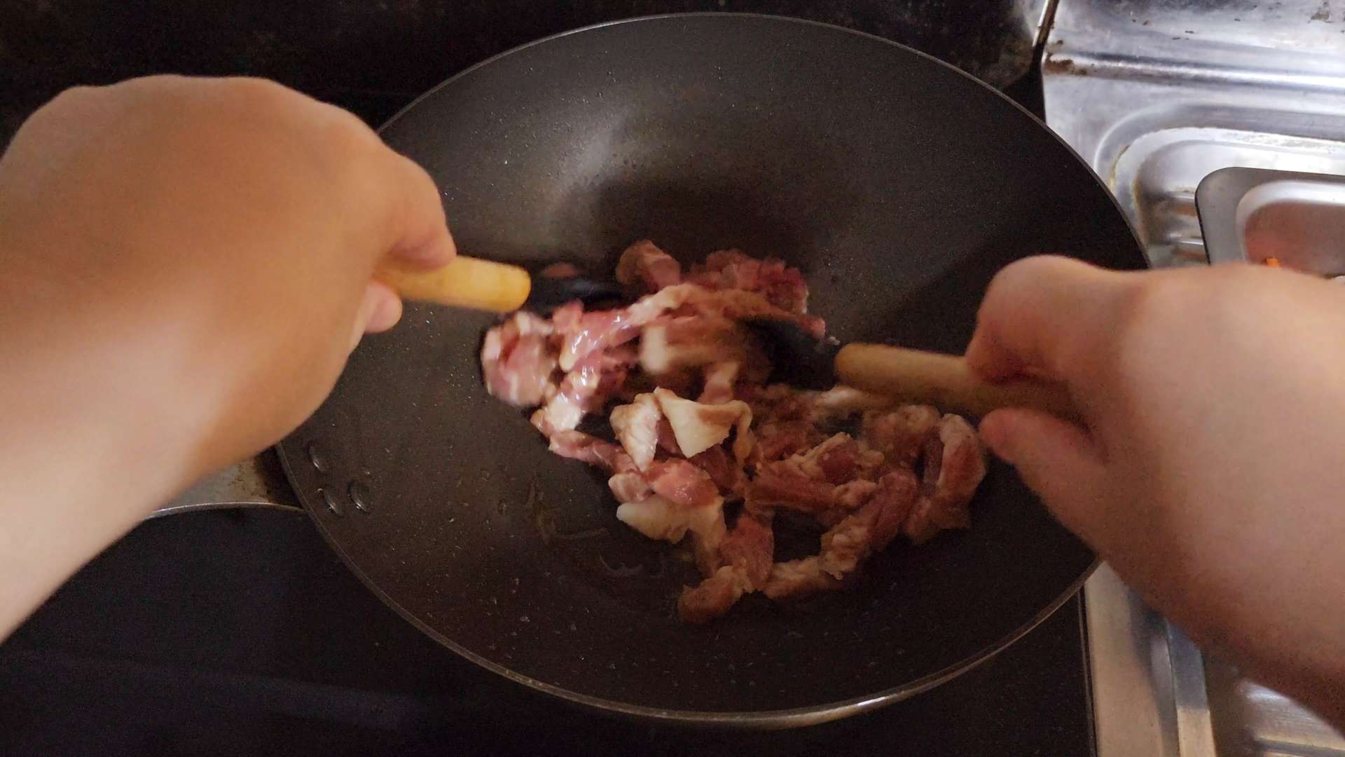 중불로 예열한 팬에 식용유를 두르고 양념한 목살을 넣고 볶아줍니다.