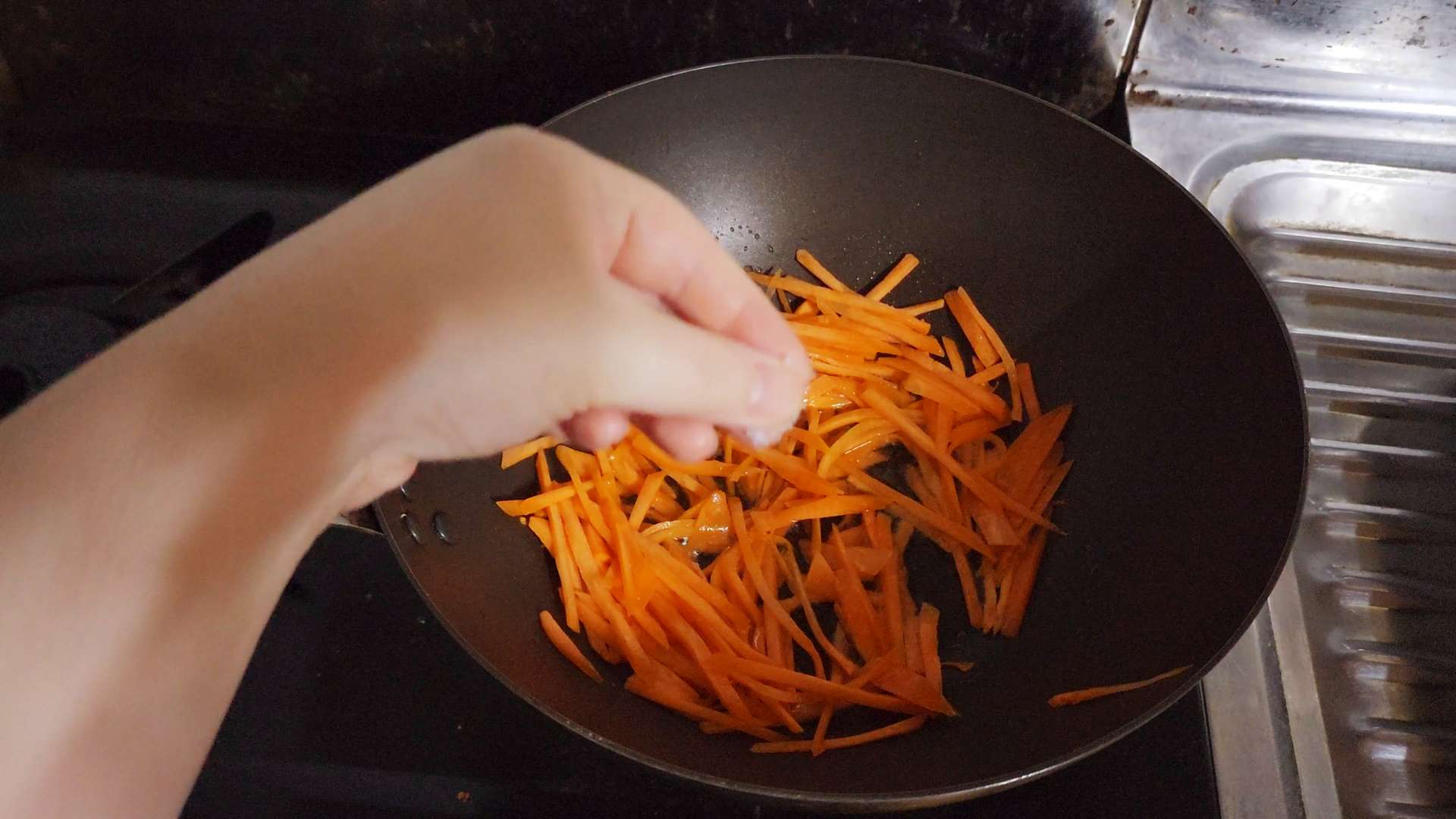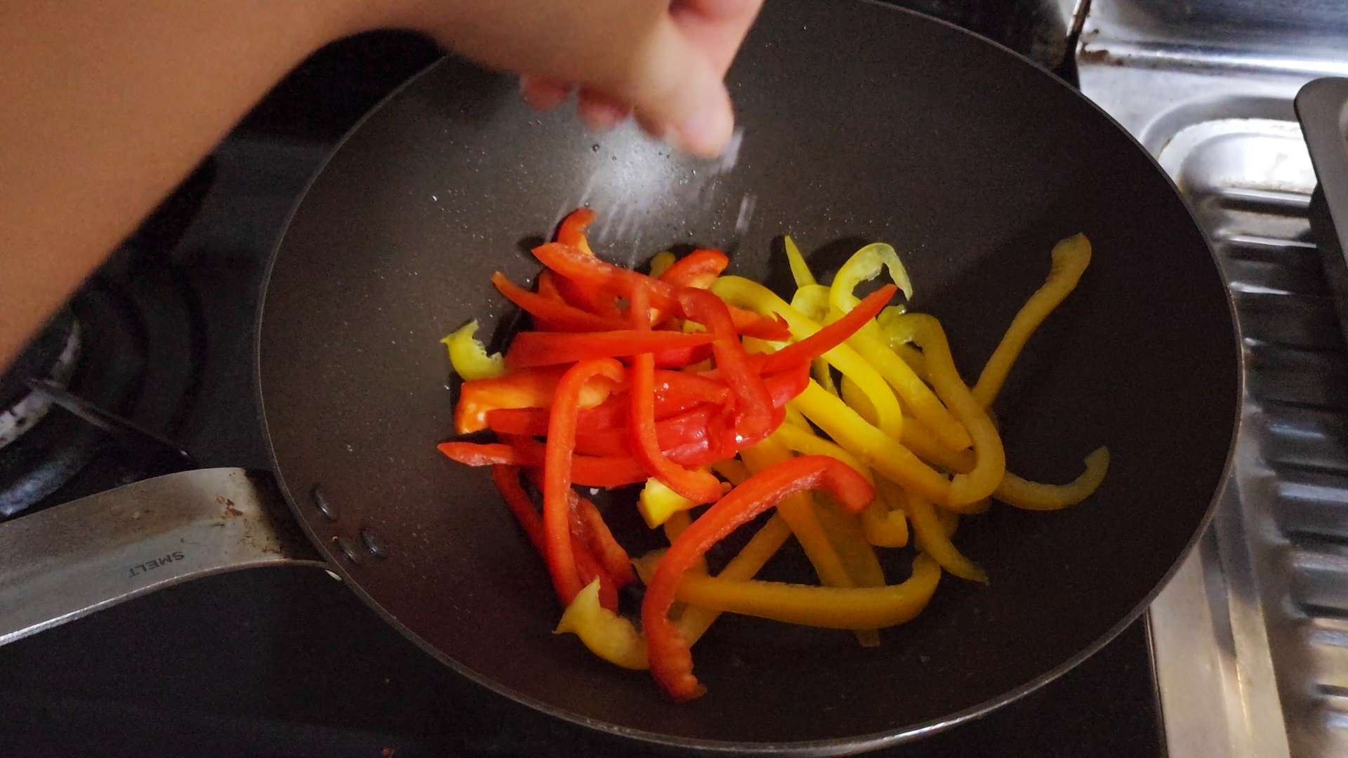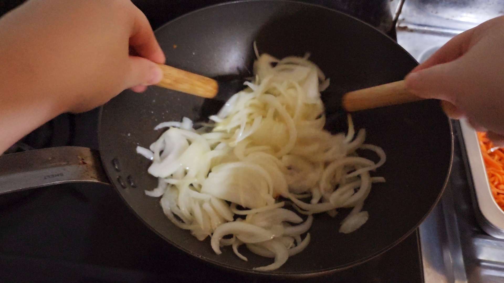 중불로 예열한 팬에 식용유를 두르고 채썬 당근, 양파, 파프리카를 소금 한꼬집 넣고 볶아줍니다.