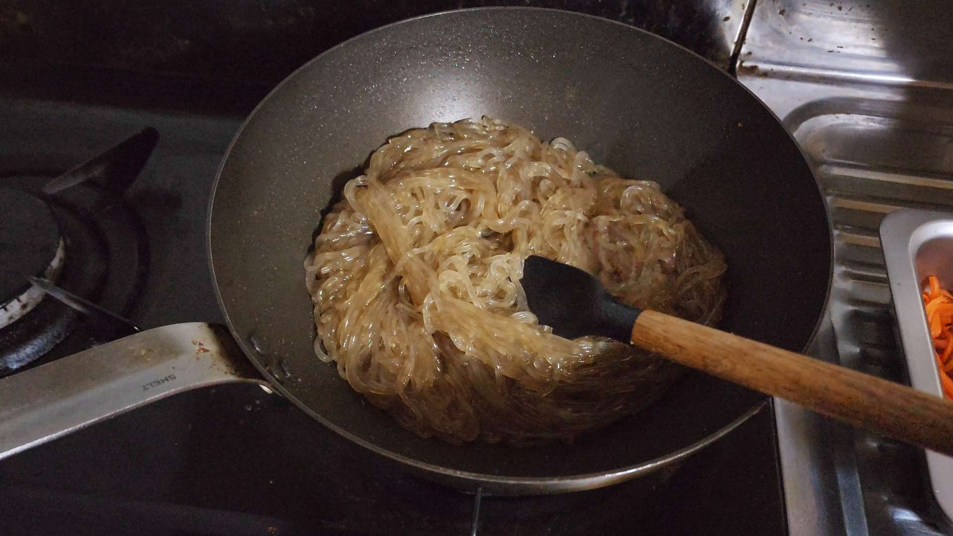 불린 당면, 진간장 3T, 물 200ml, 식용유를 넣고 투명해질 때까지 볶아줍니다.
