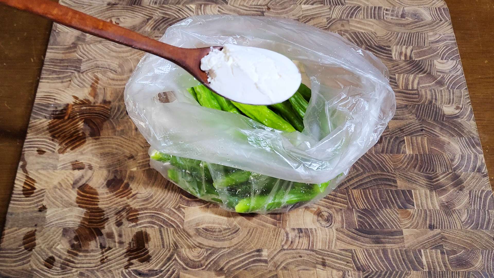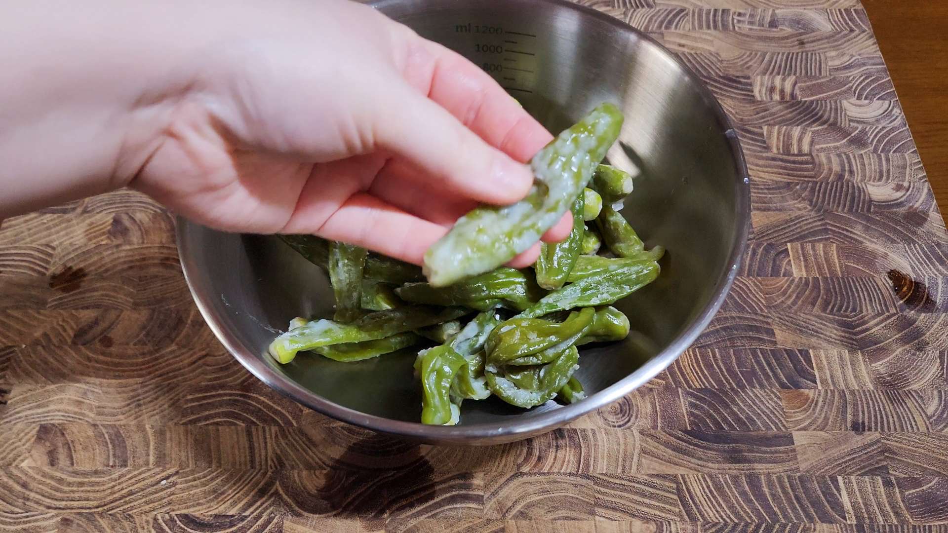 위생백에 꽈리고추, 밀가루 3T를 넣고 흔들어 밀가루를 골고루 묻혀줍니다.