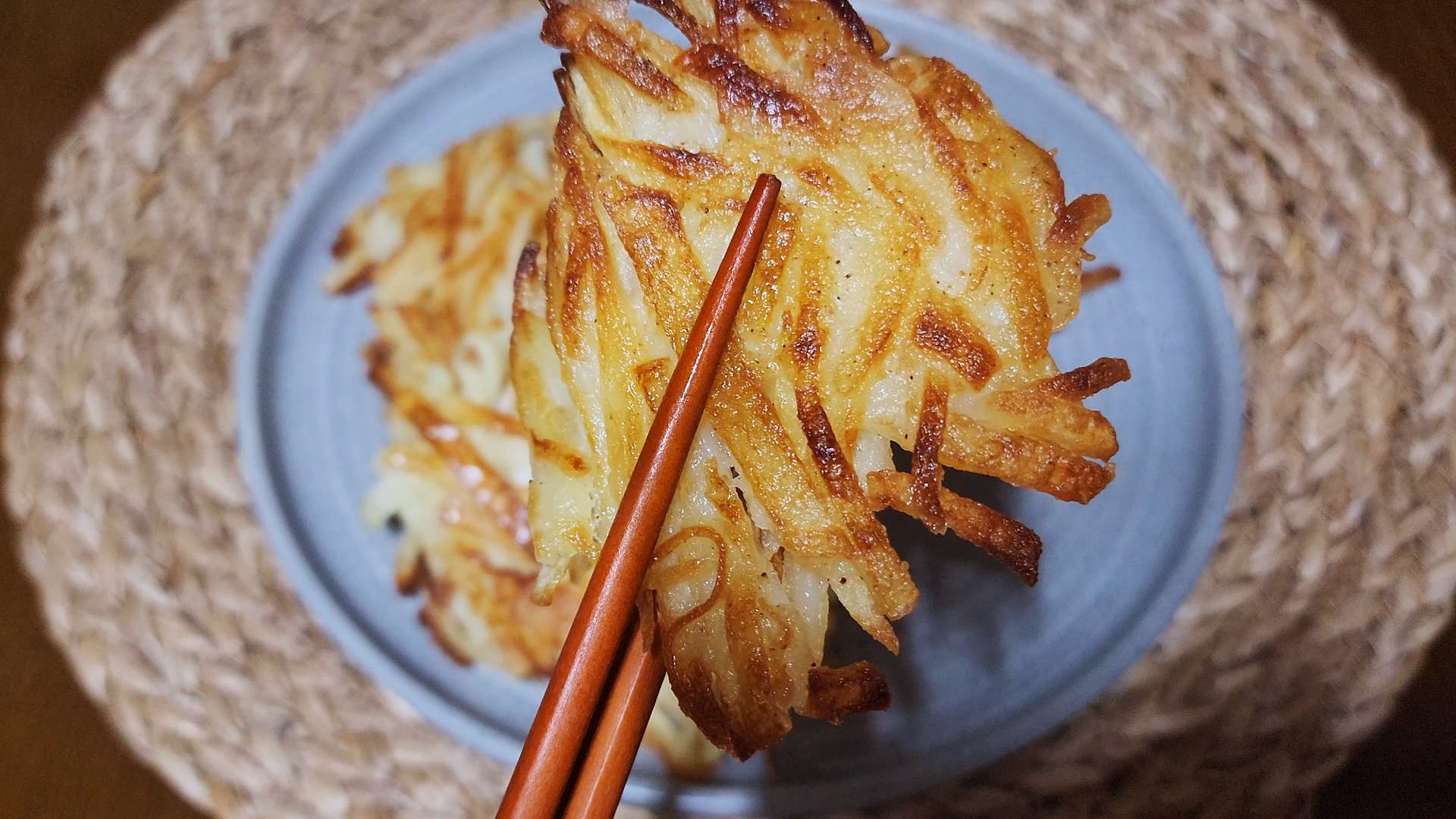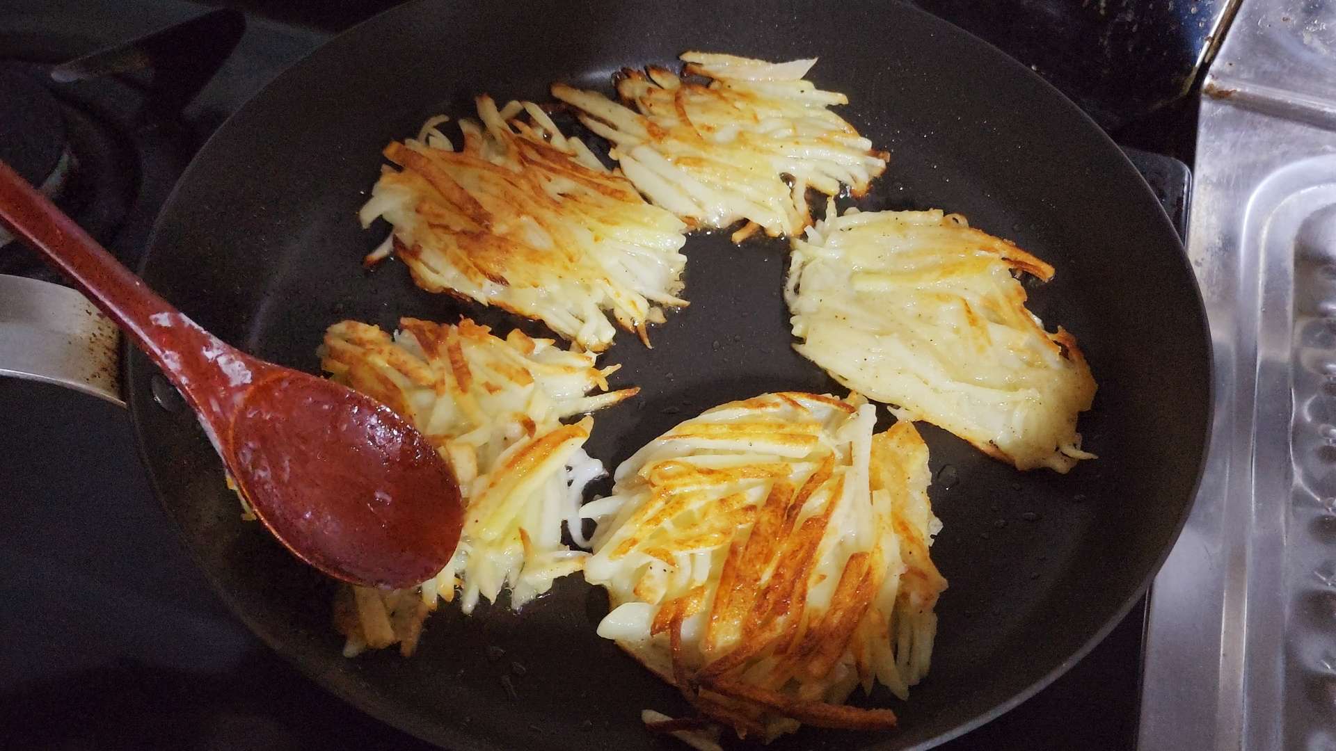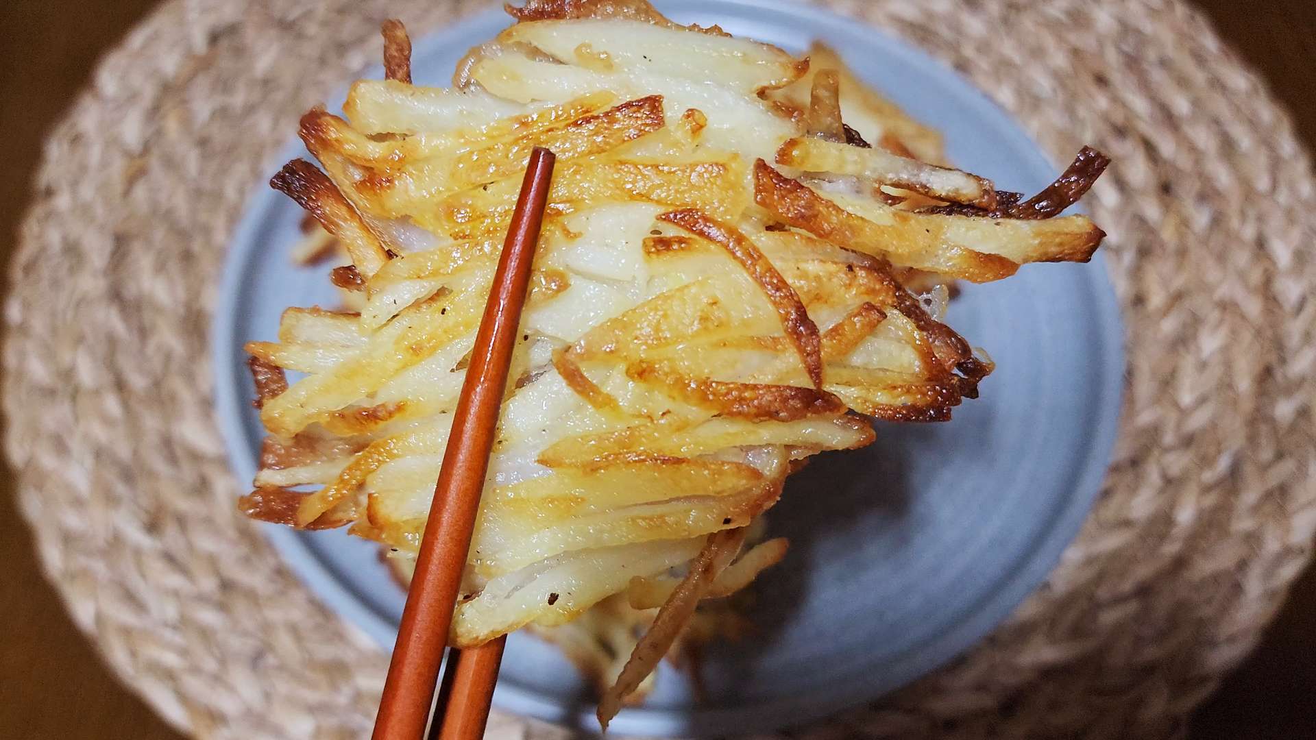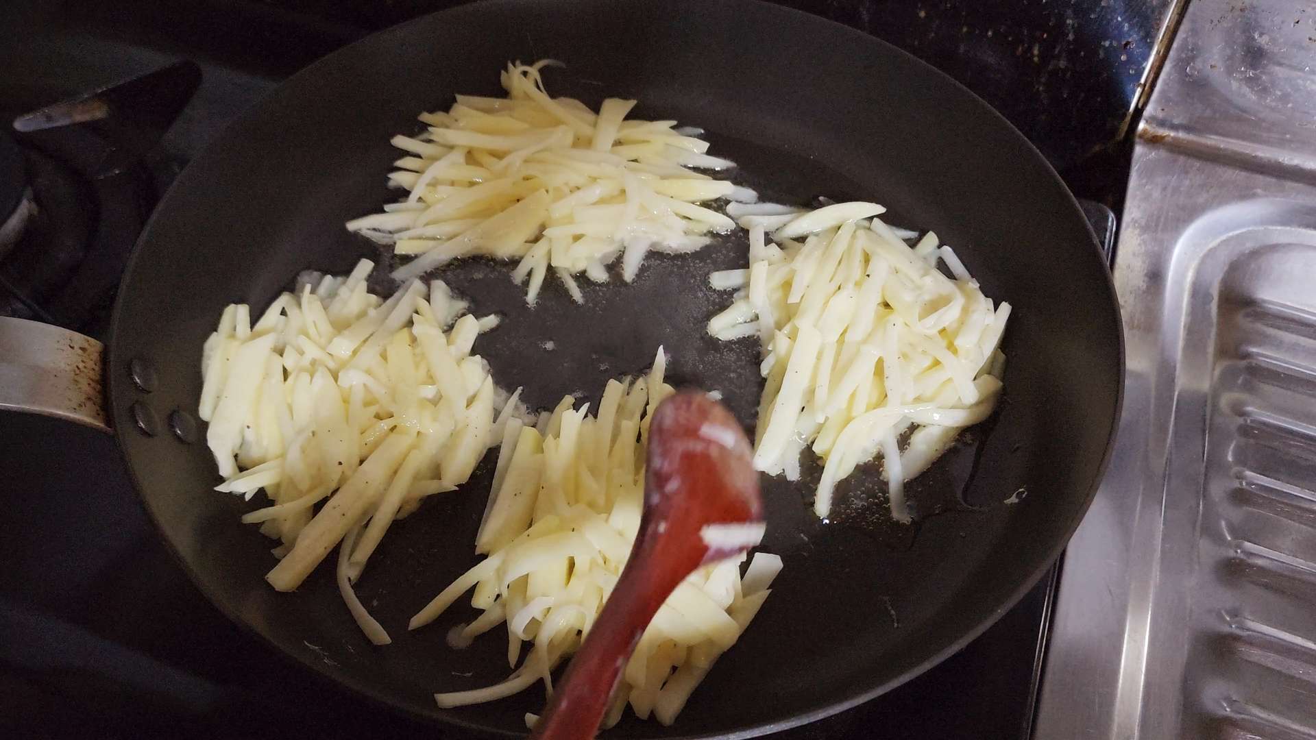 감자 속이 투명해지고 가장자리가 노릇해지면 뒤집어줍니다.