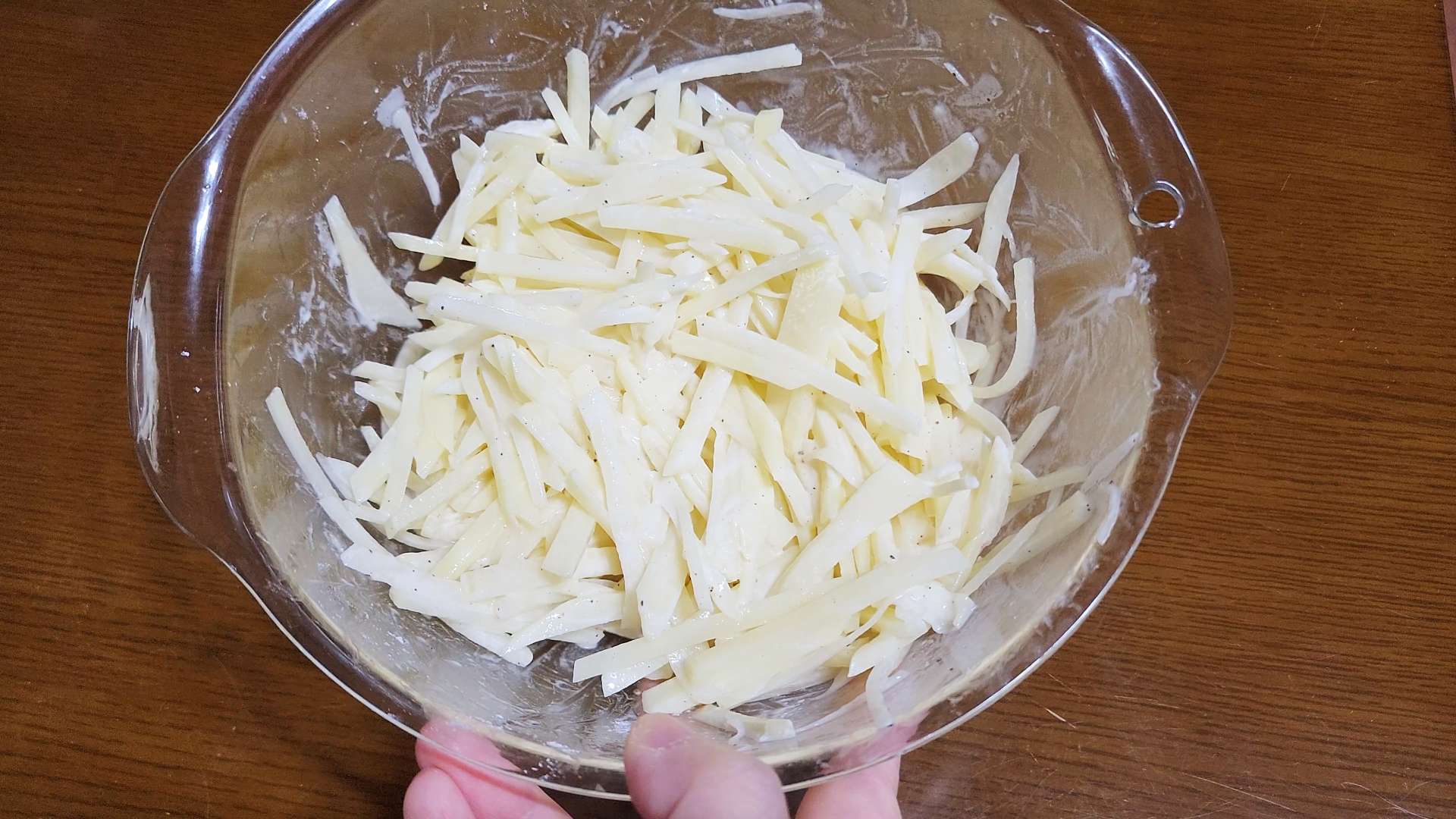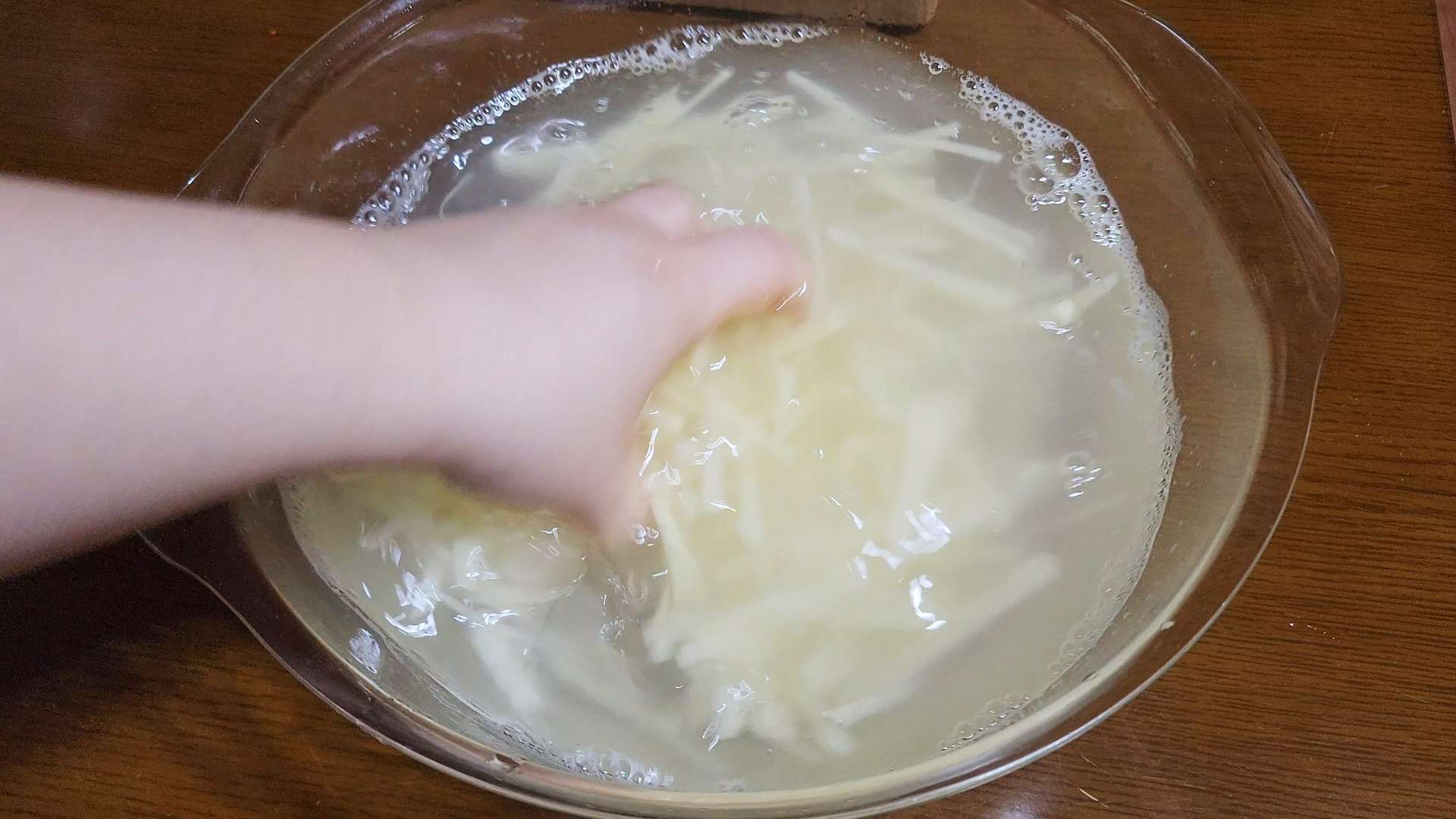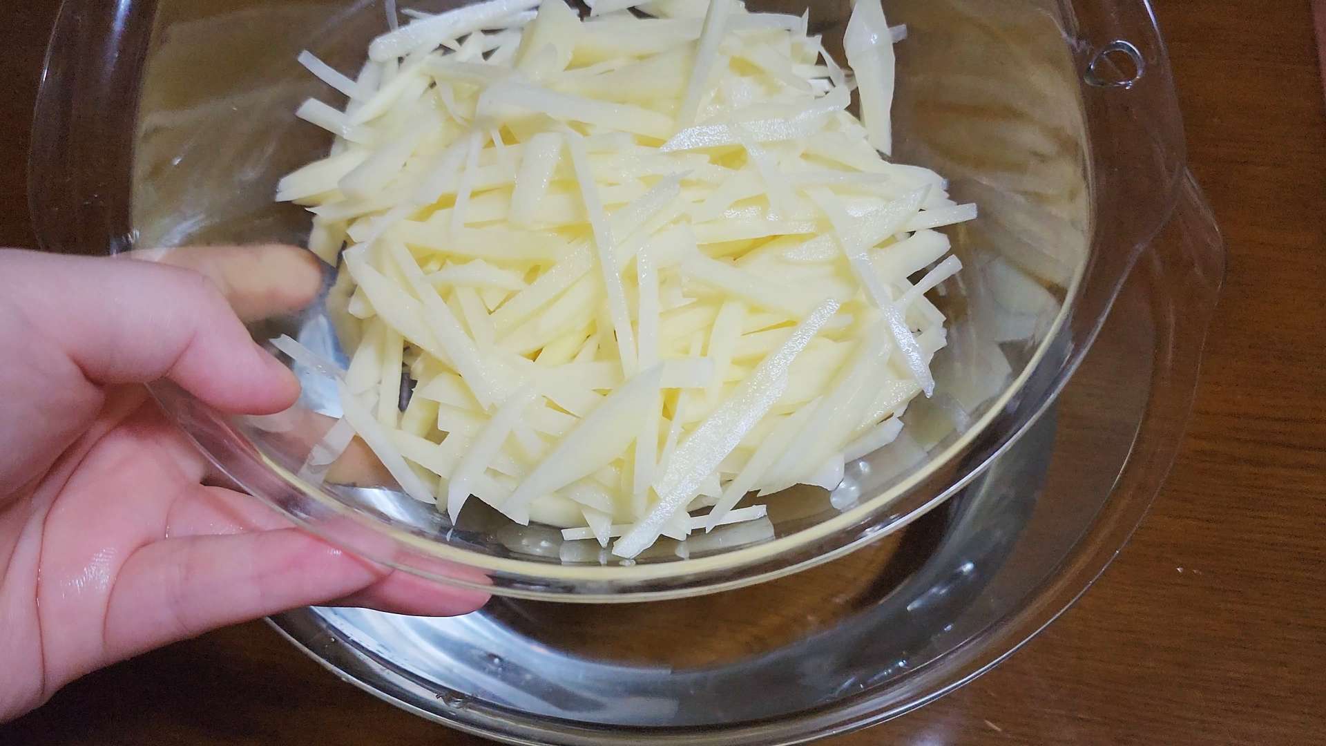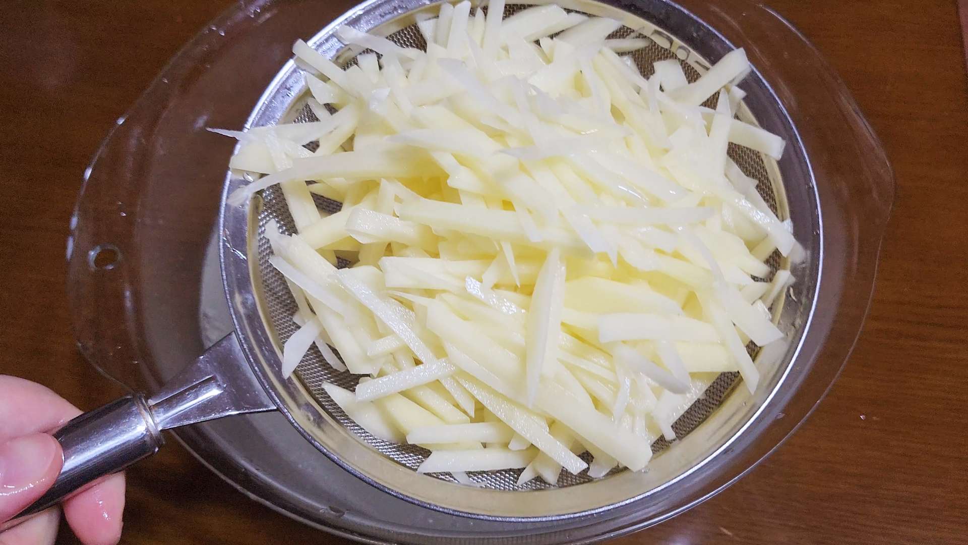 채썬 감자는 흐르는 물에 두번 헹구고 체에 밭쳐