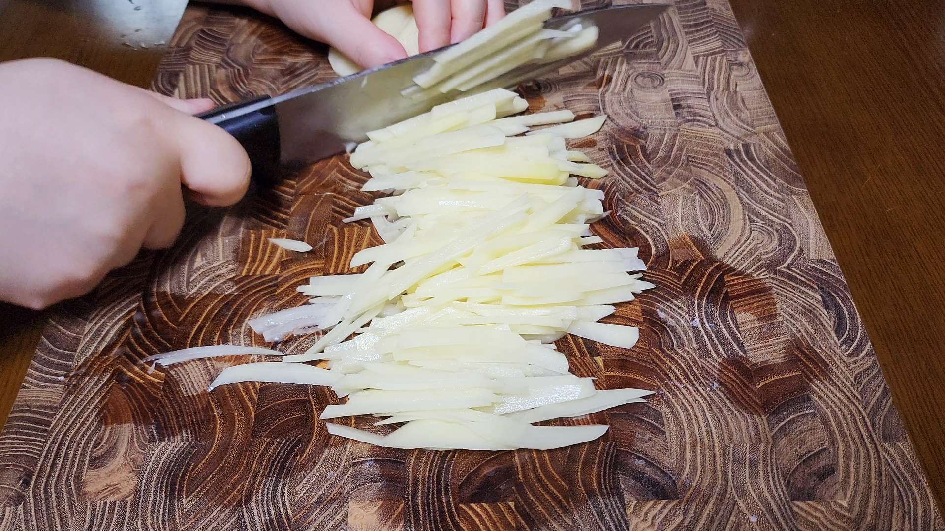 감자는 껍질을 벗기고 얇게 채썰어 줍니다.