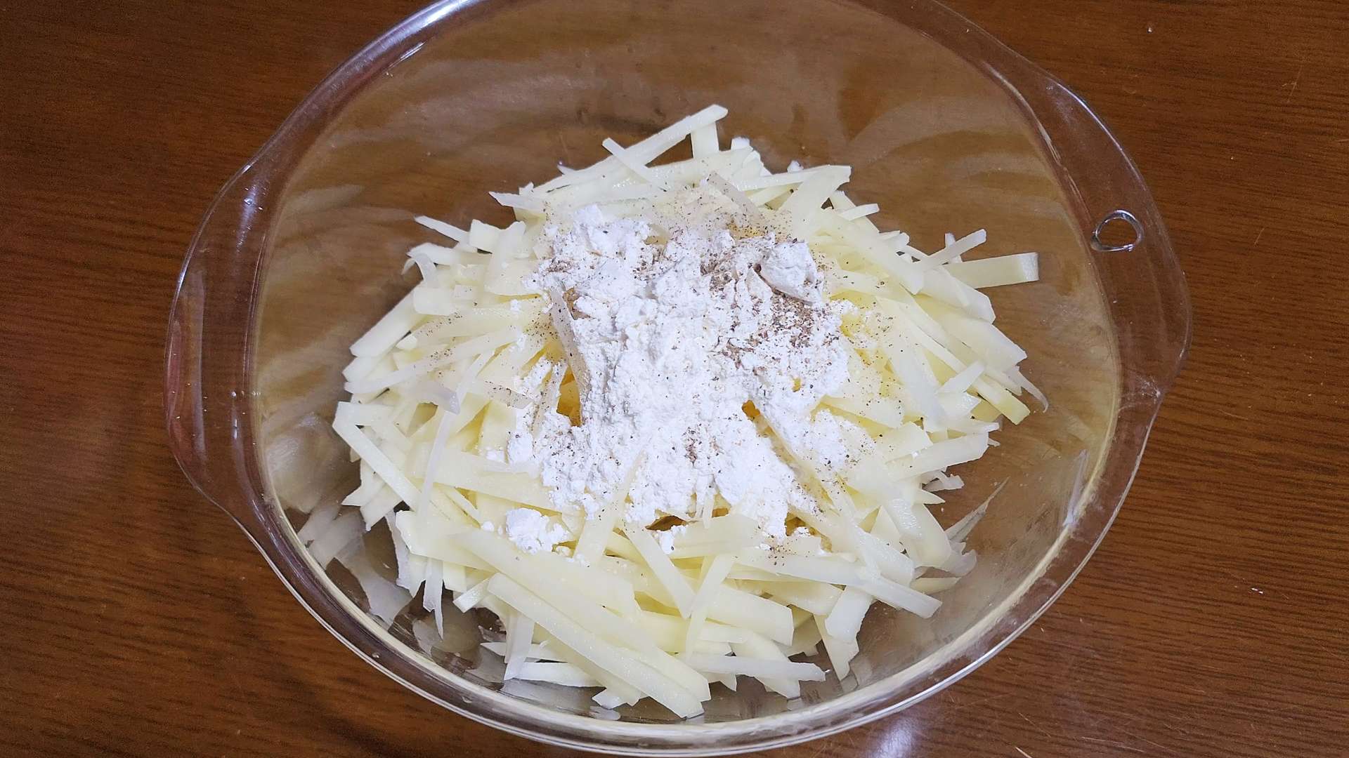 볼에 감자, 부침가루 1.5T, 소금 1/2t, 후춧가루를