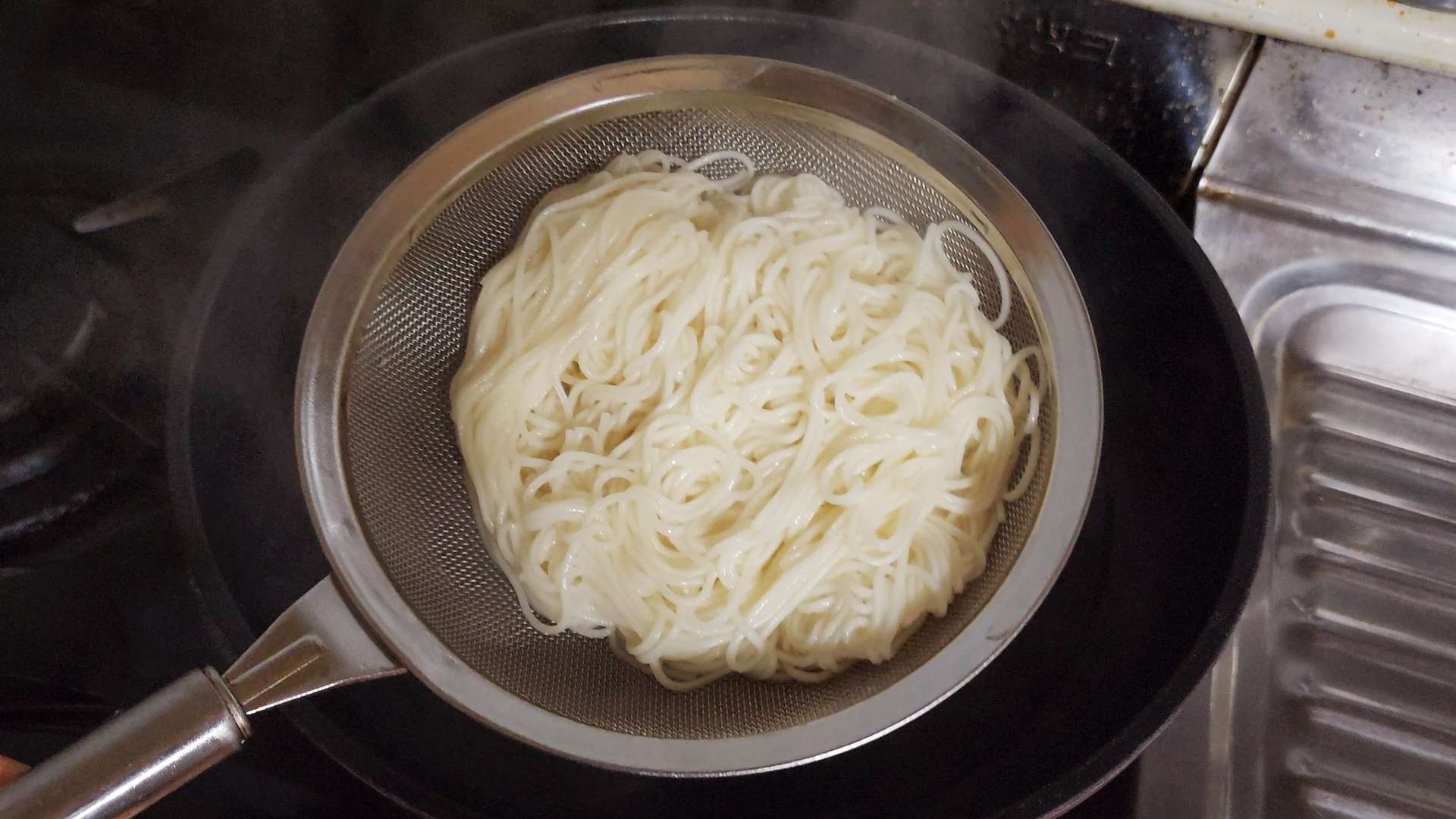 소면을 찬물에 세번 헹구고 체에 밭쳐 물기를 제거해줍니다.