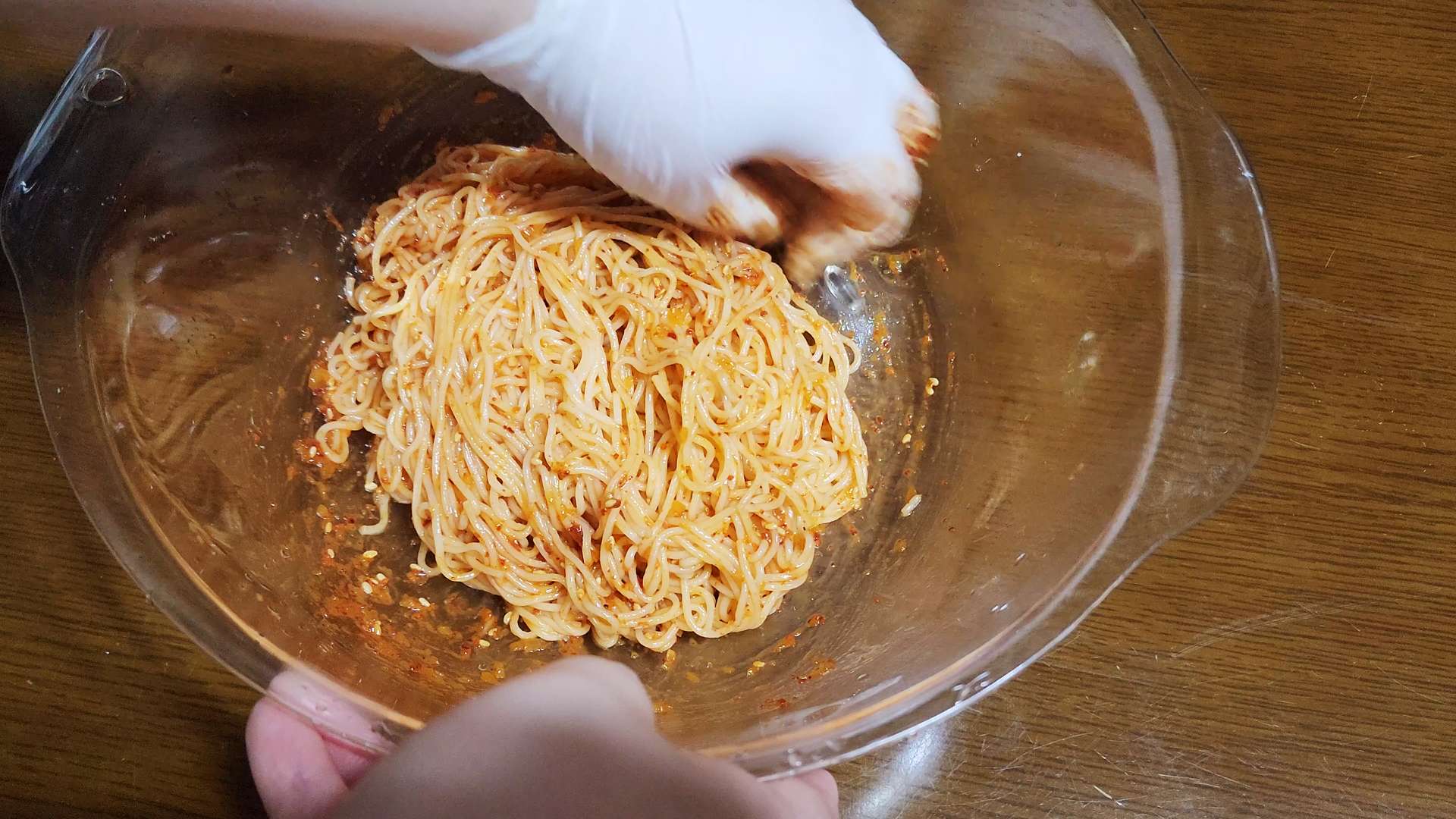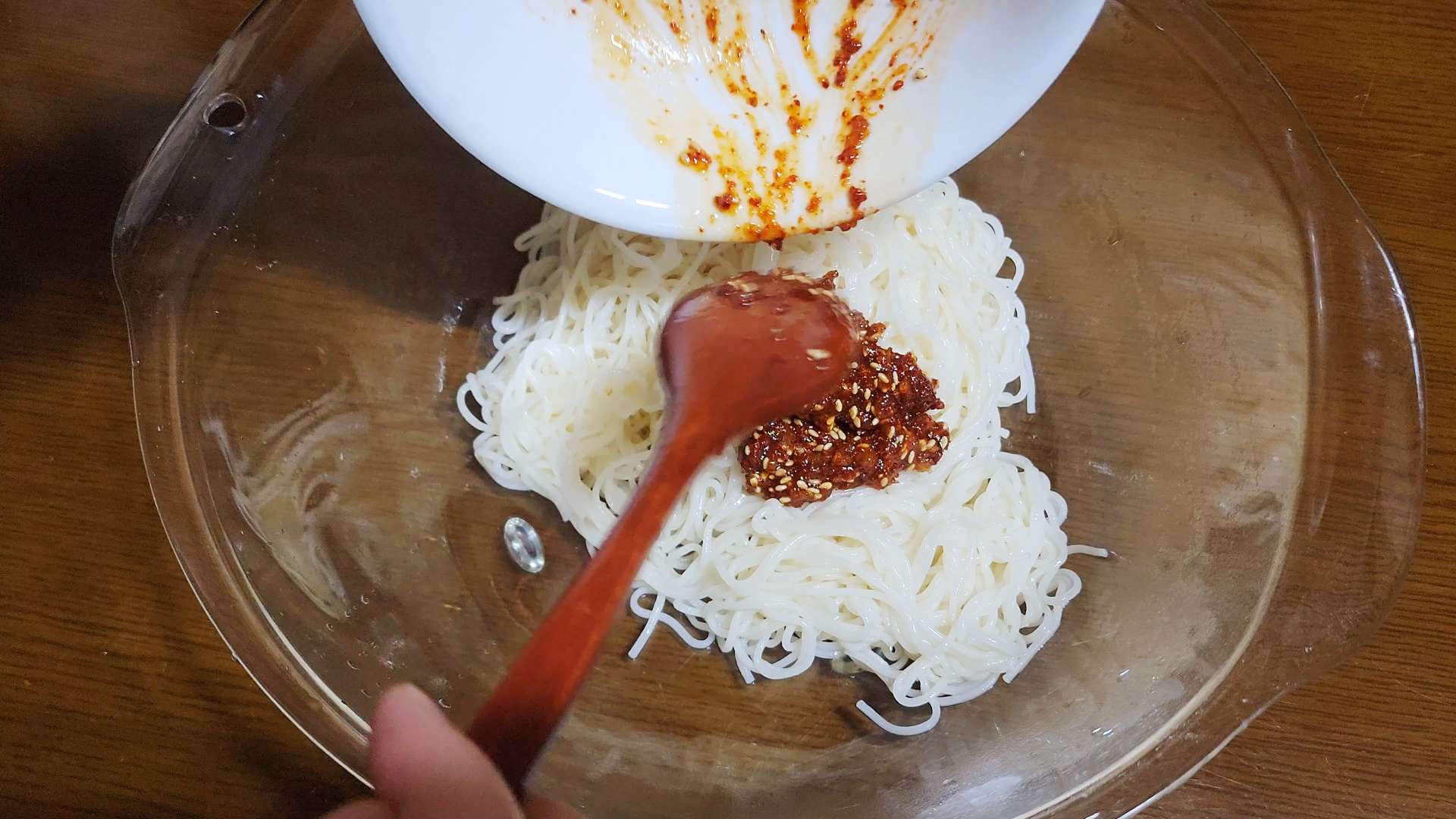 볼에 소면, 양념장을 넣고 섞어줍니다.