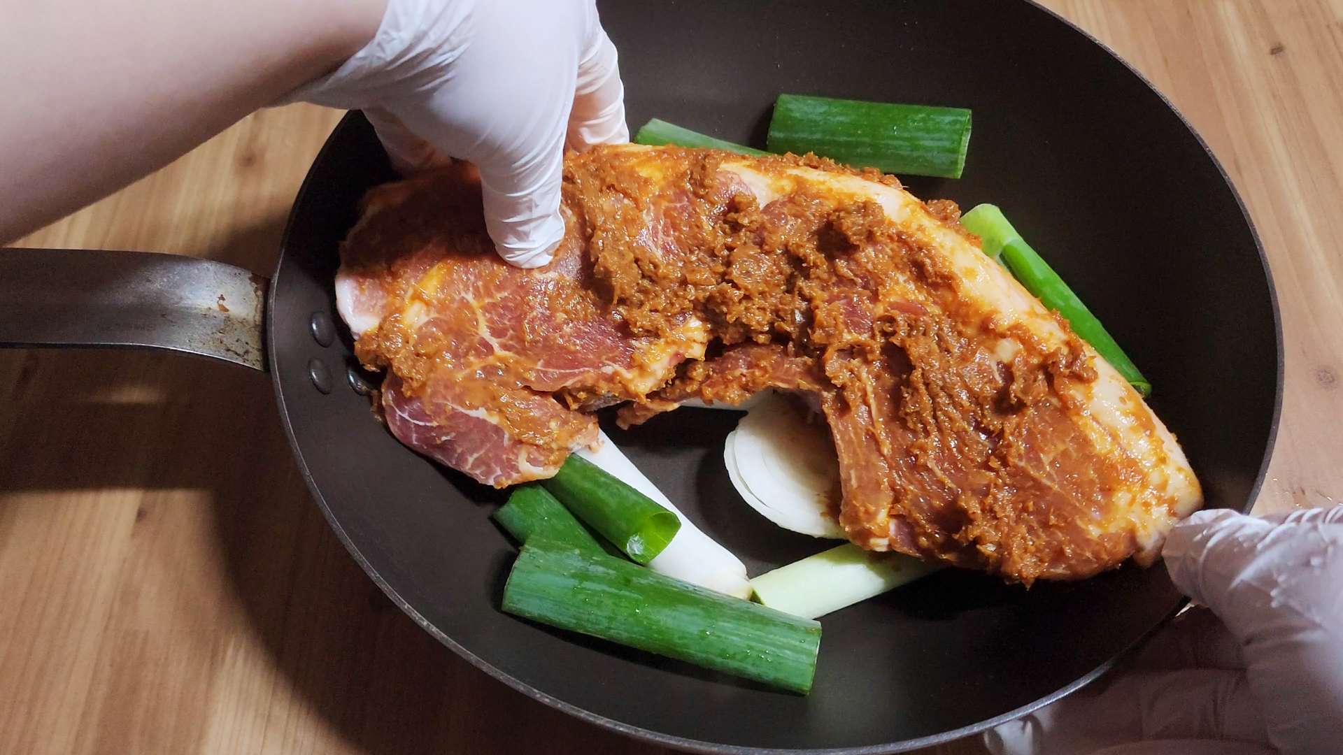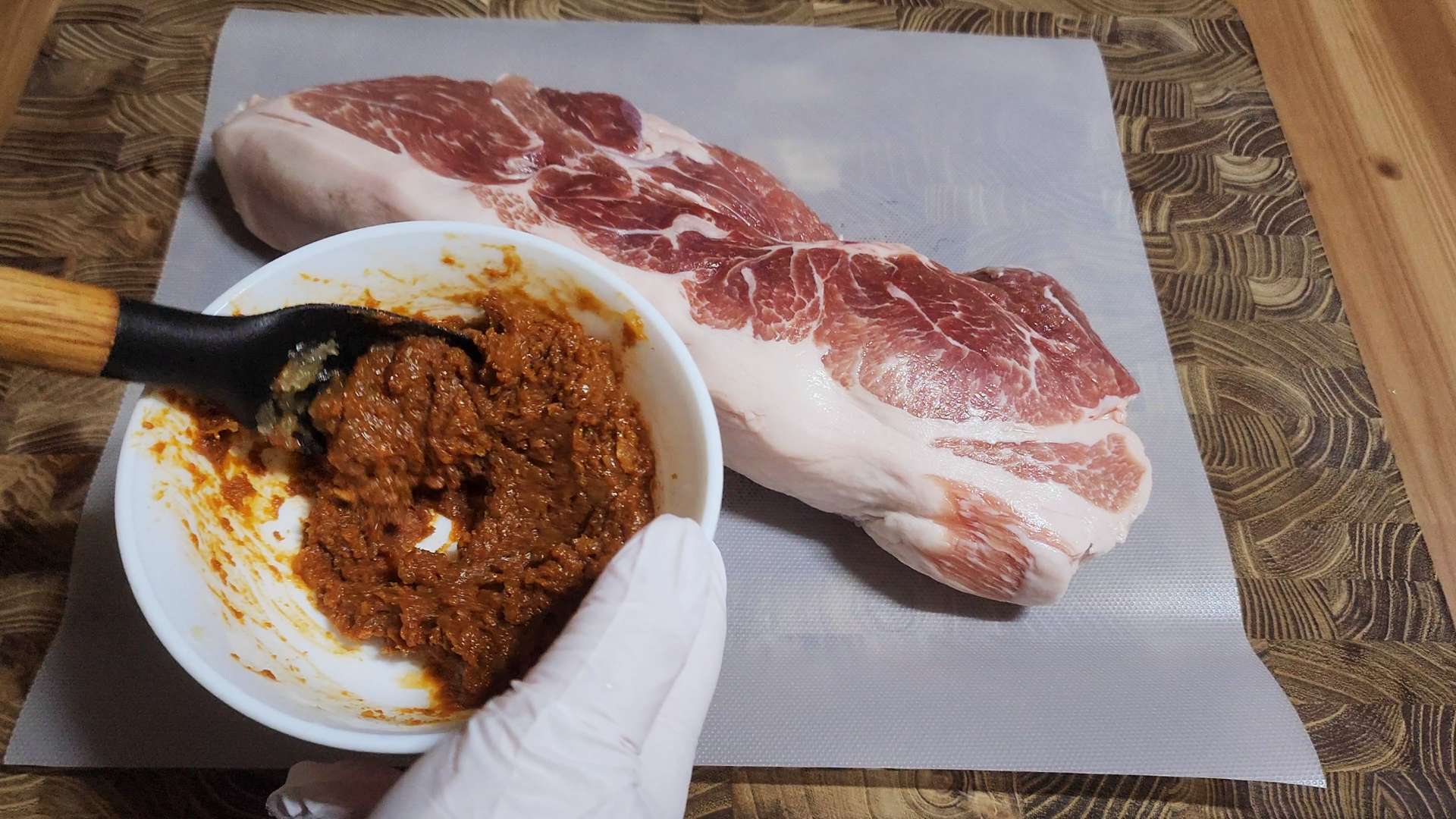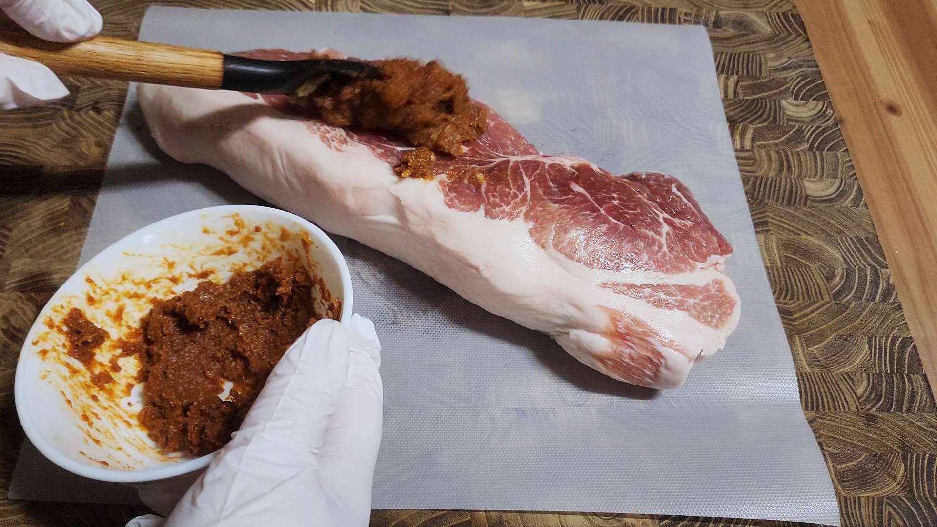 돼지고기 앞다리살에 된장 양념을 앞뒤로 발라줍니다.