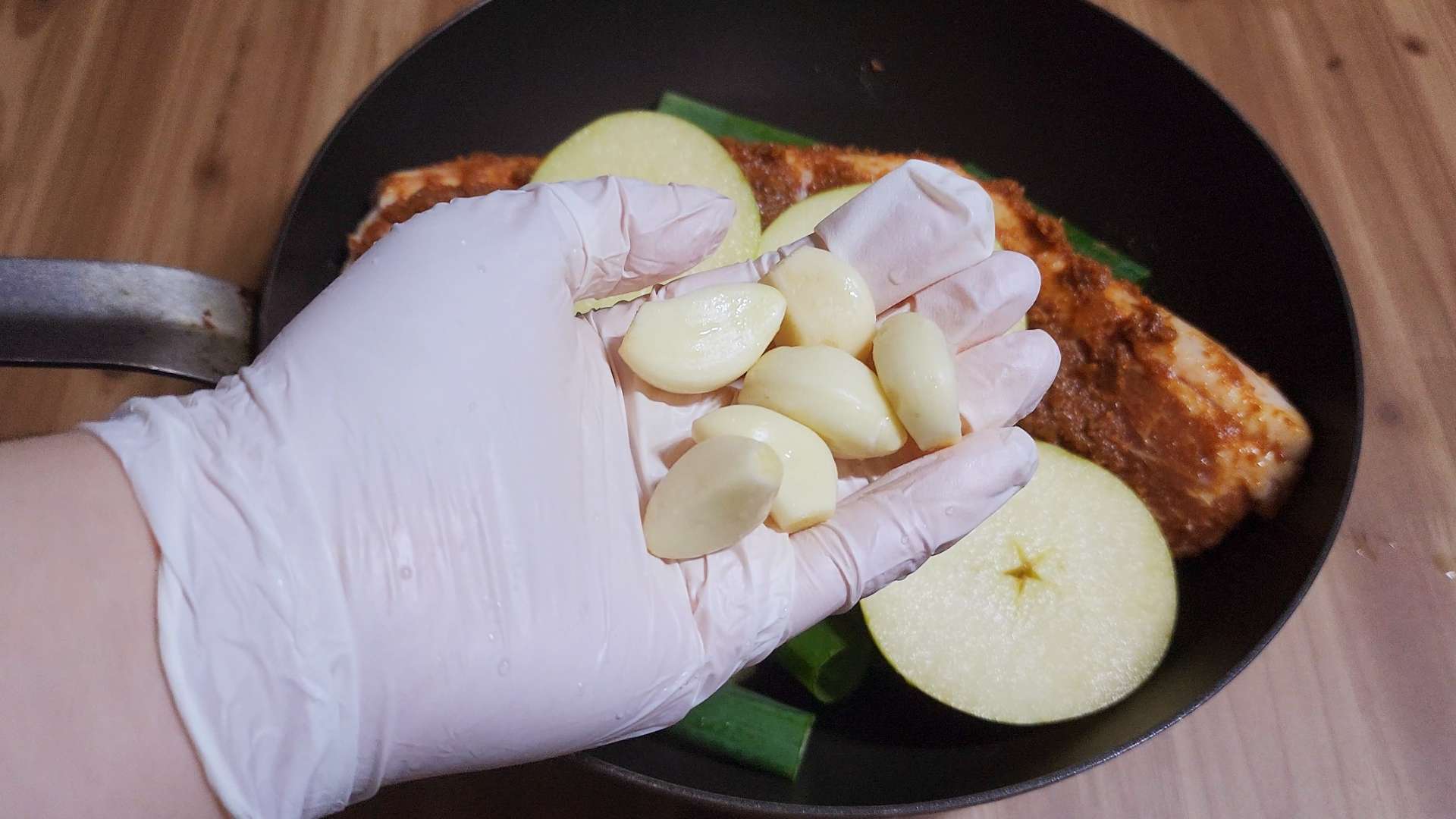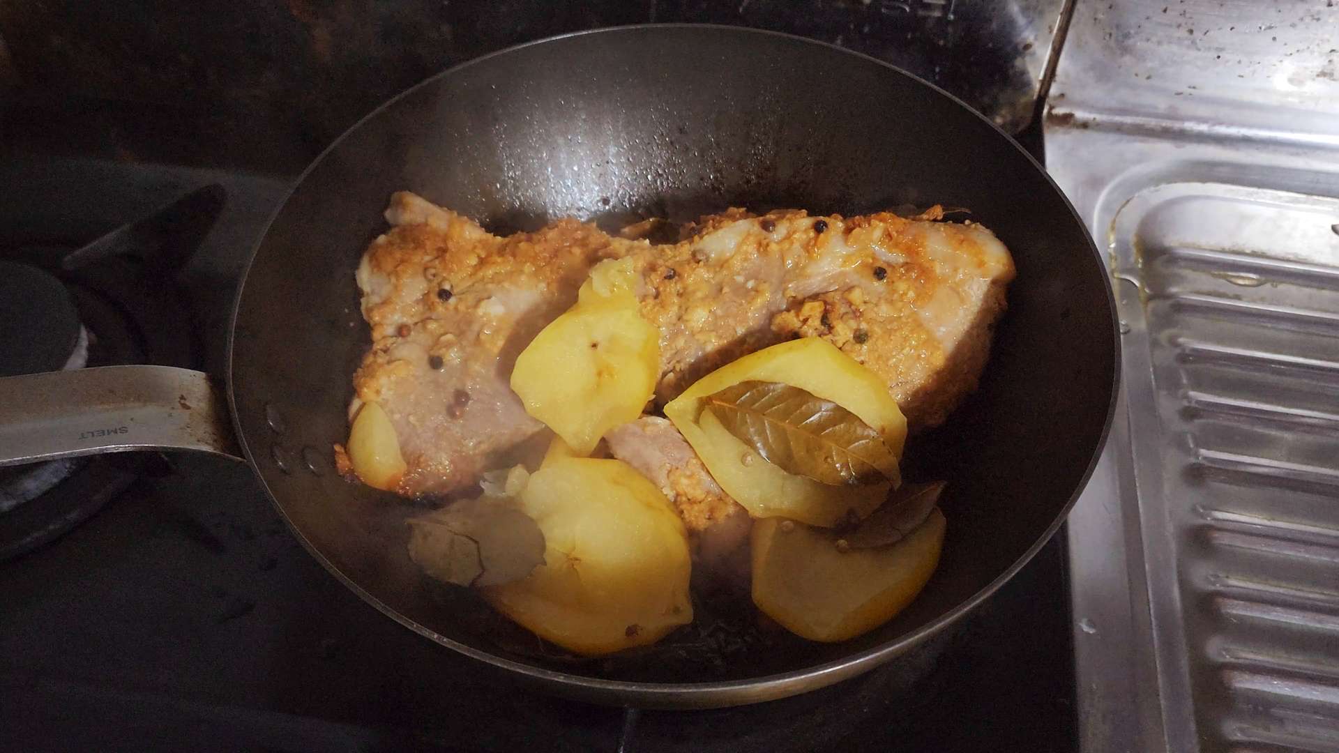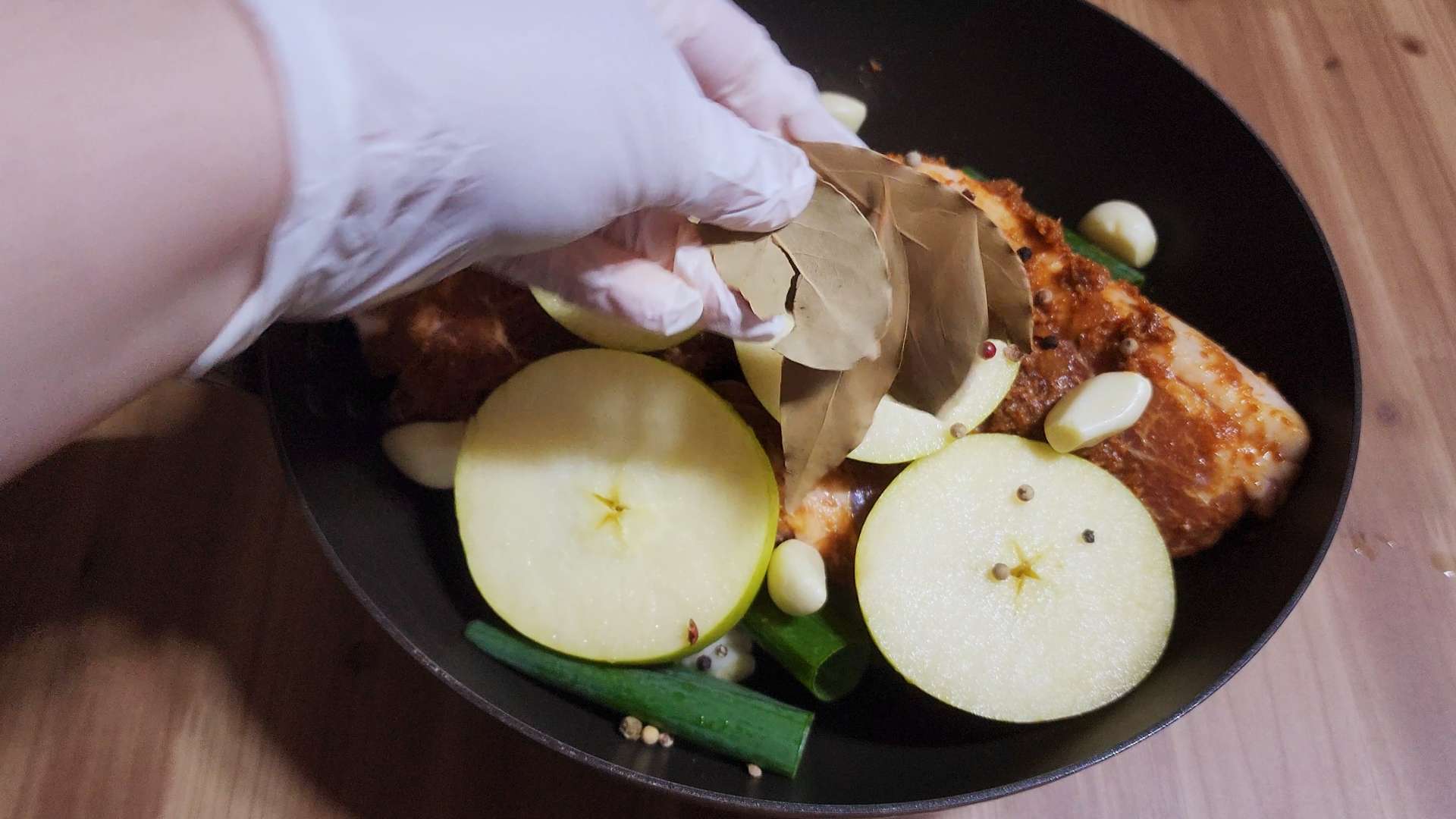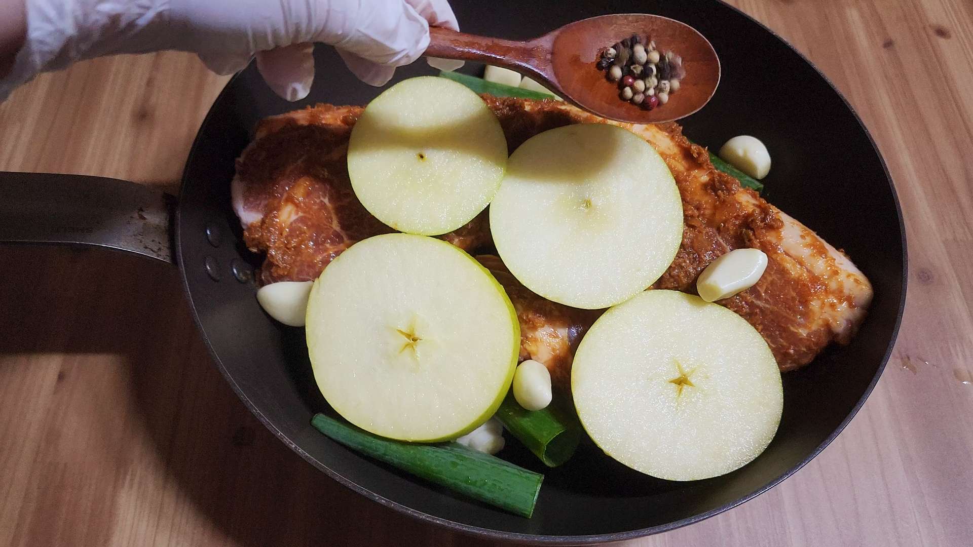 재료: 돼지고기 앞다리살 500g, 사과 1개, 양파 1개, 대파 1대, 마늘 6알, 통후추, 월계수잎 5장,
