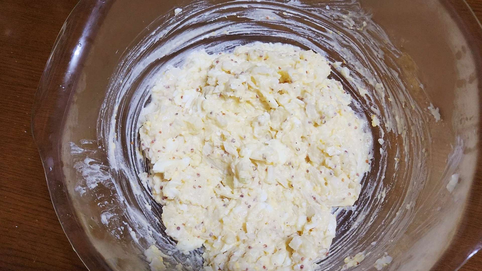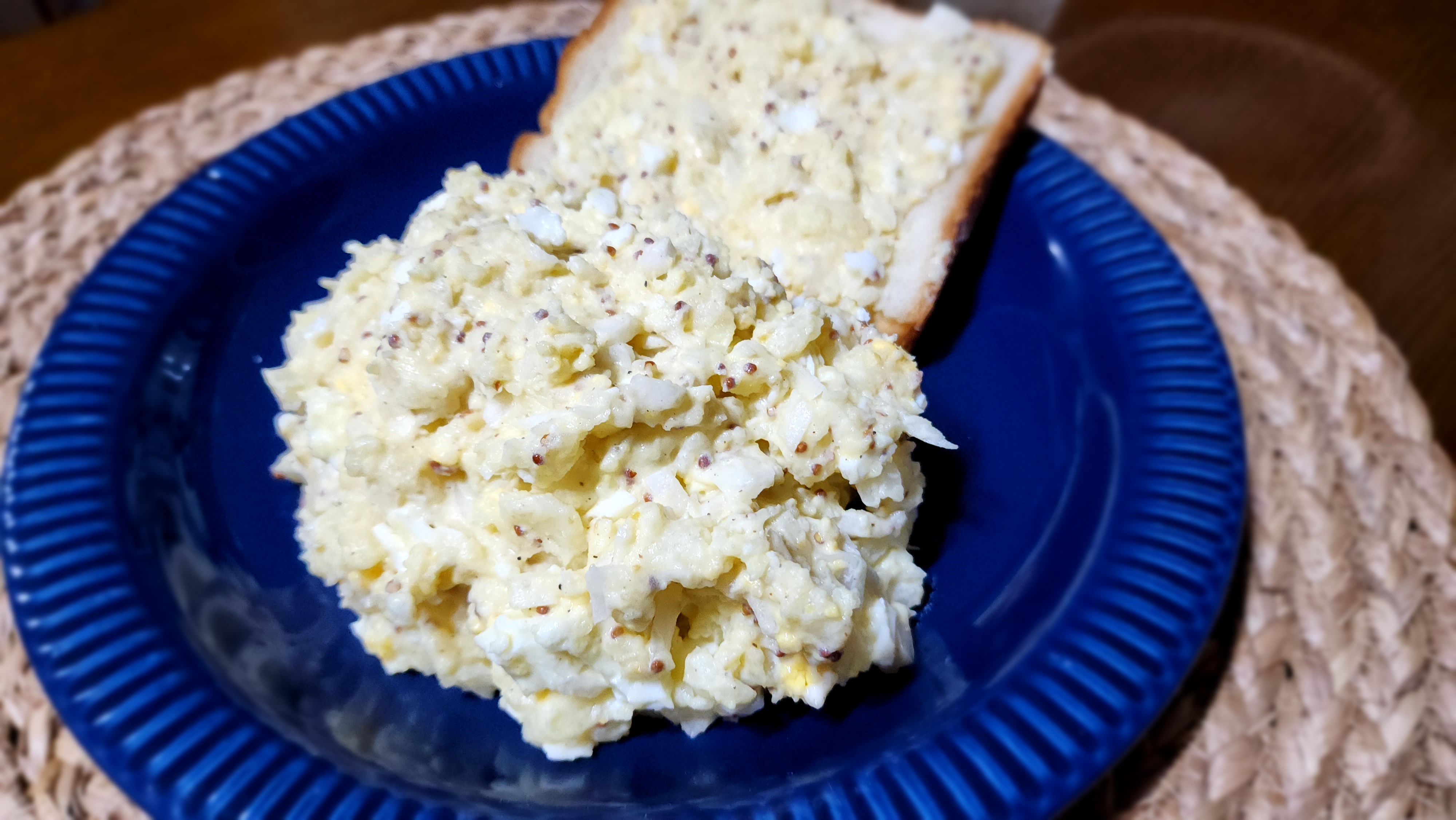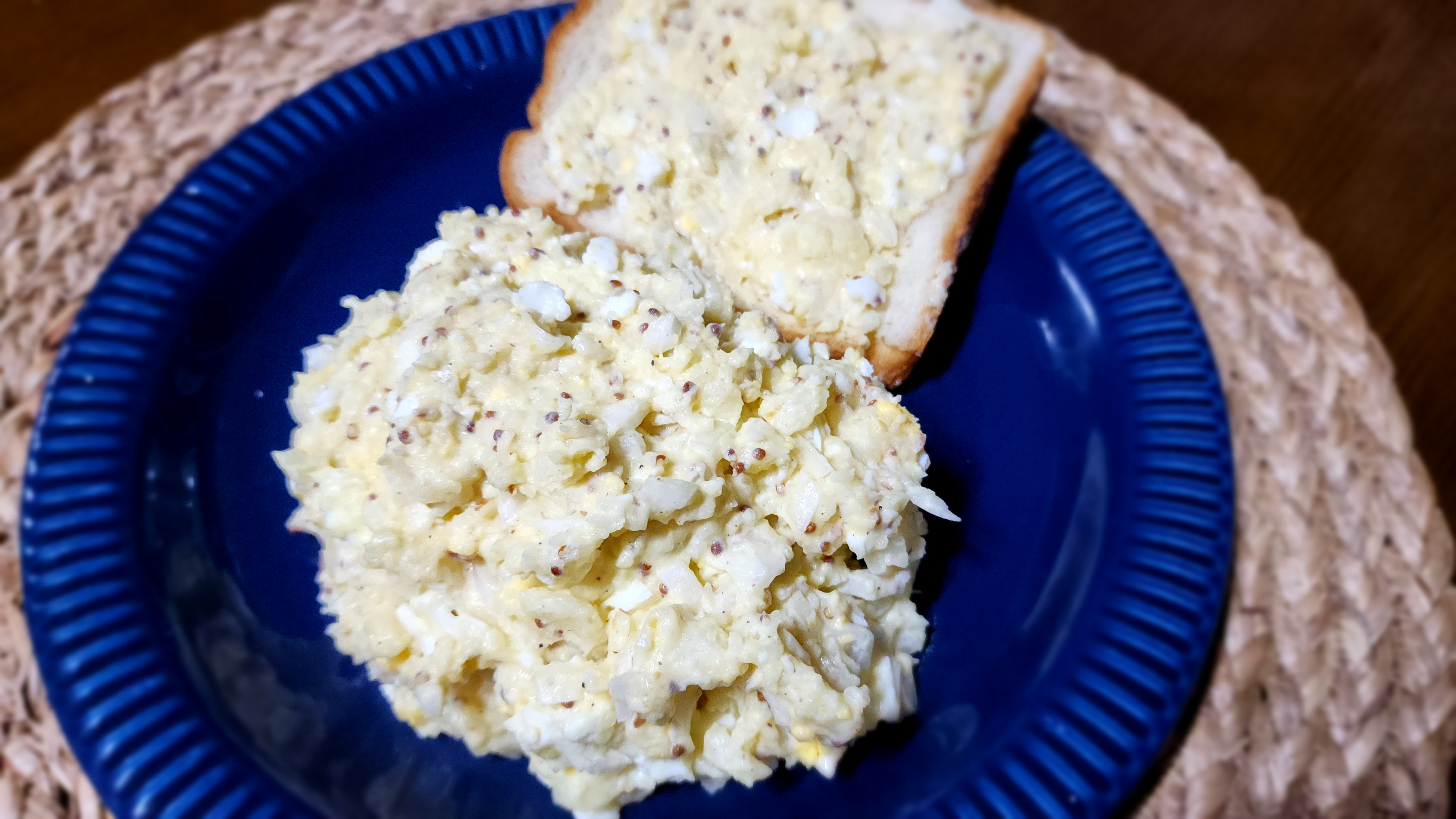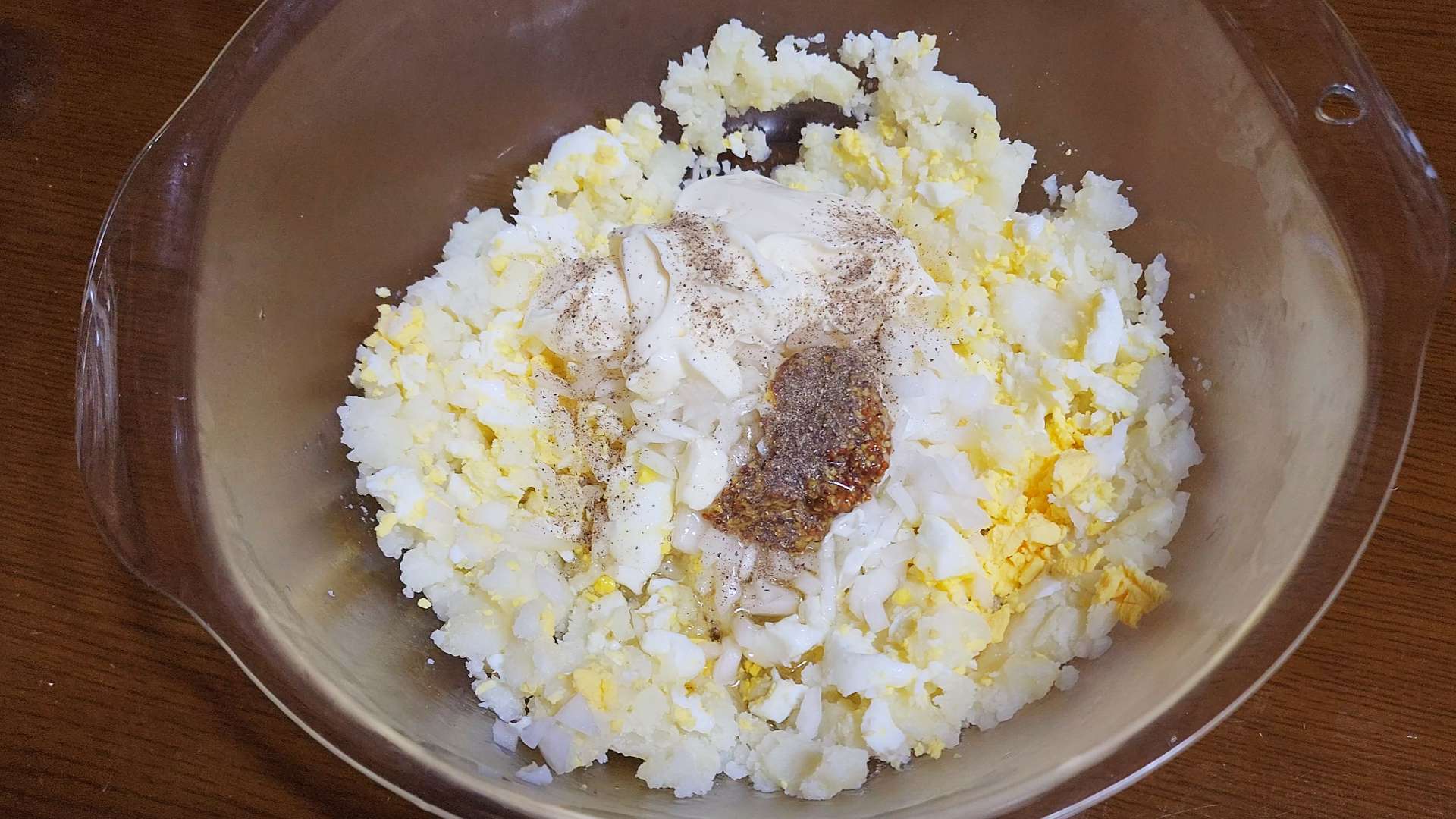 재료: 감자 3개, 달걀 2개, 양파 1/2개, 마요네즈 5T, 씨겨자 1T, 올리고당 2T, 후춧가루