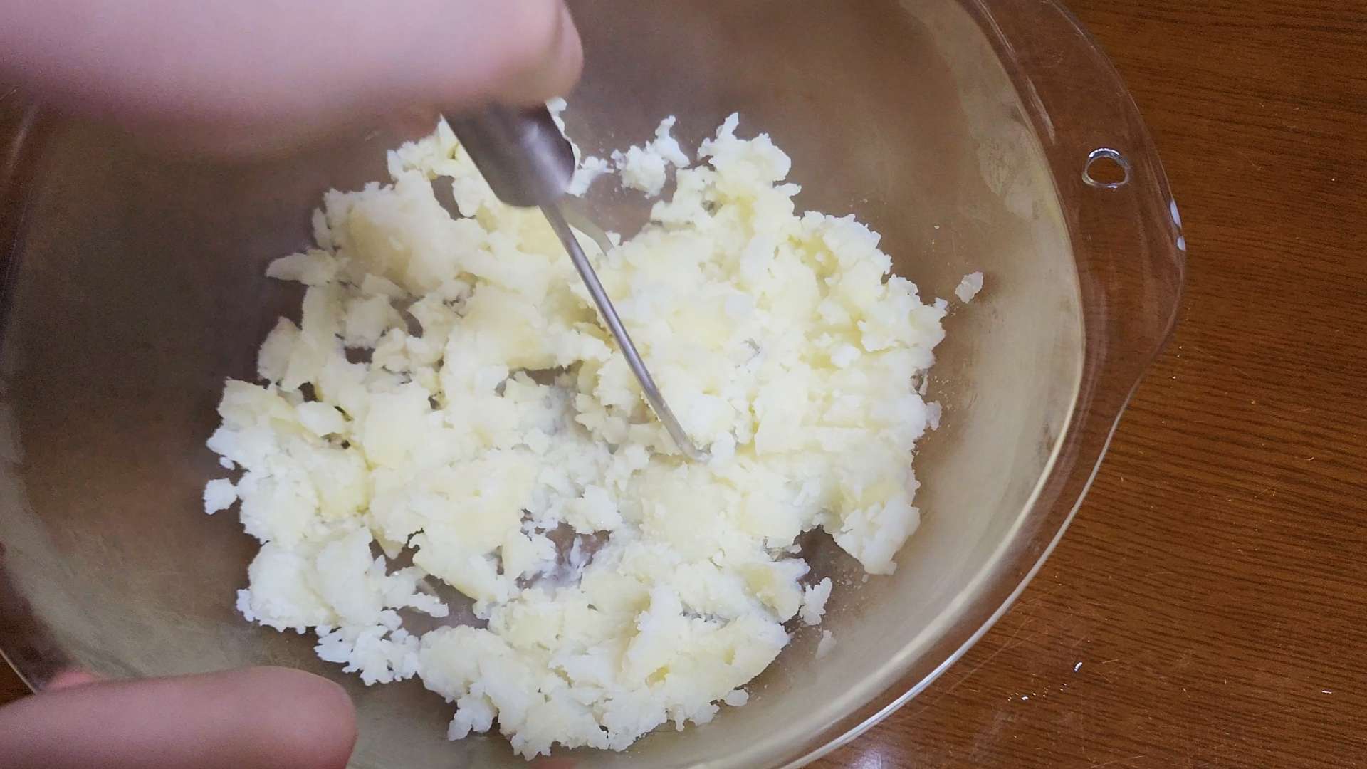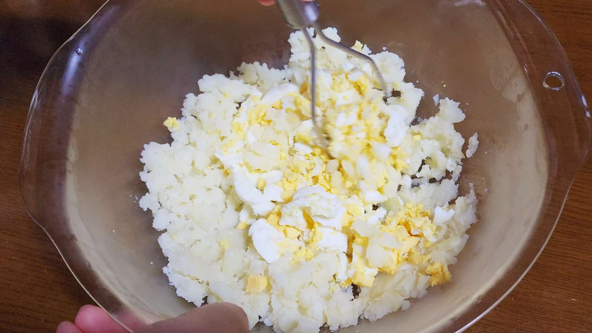 볼에 감자, 달걀을 넣고 으깨줍니다.