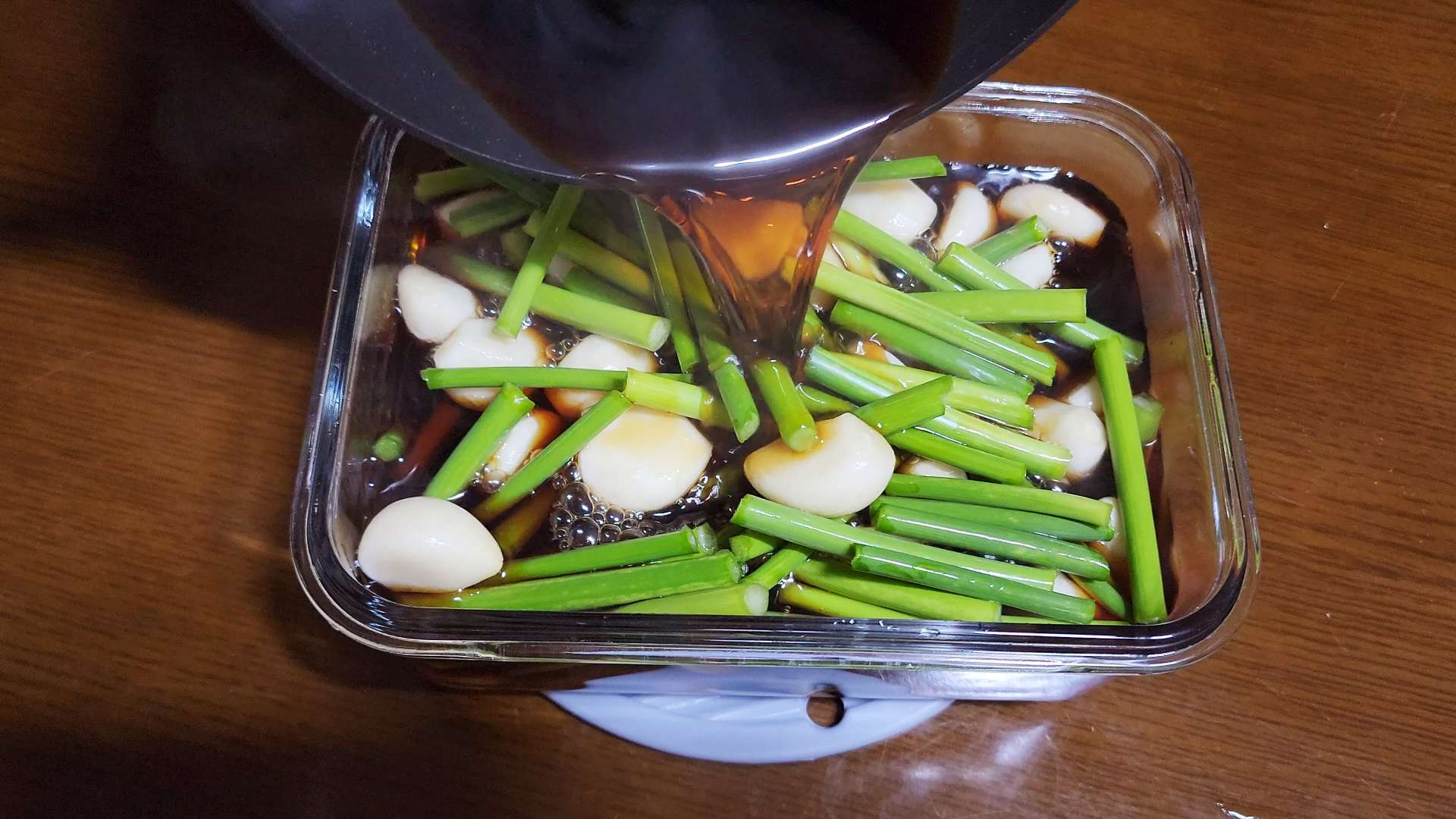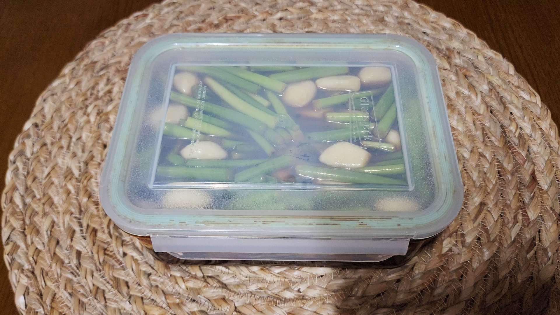 밀폐용기에 마늘, 마늘쫑을 담고 절임물을 뜨거울 때