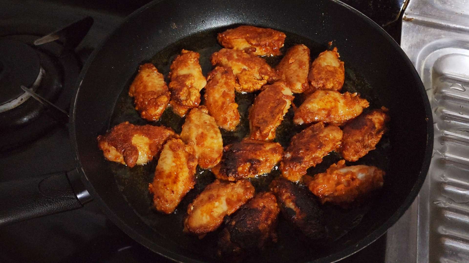 강불로 달군팬에 식용유를 1cm 높이 정도 올라오도록 부어줍니다. 식용유가 달아오르면 닭을 넣고 중불로 줄여 줍니다.