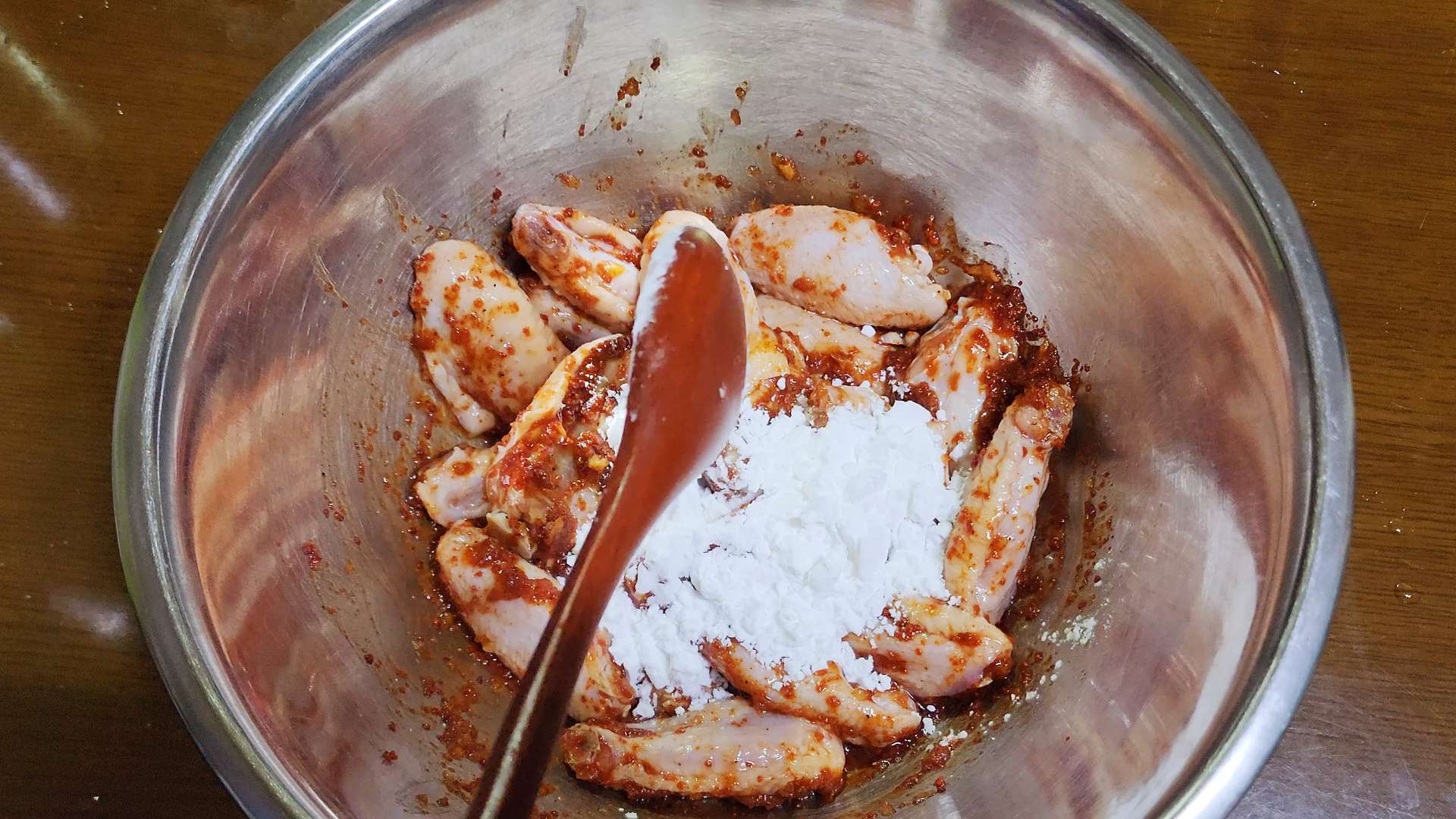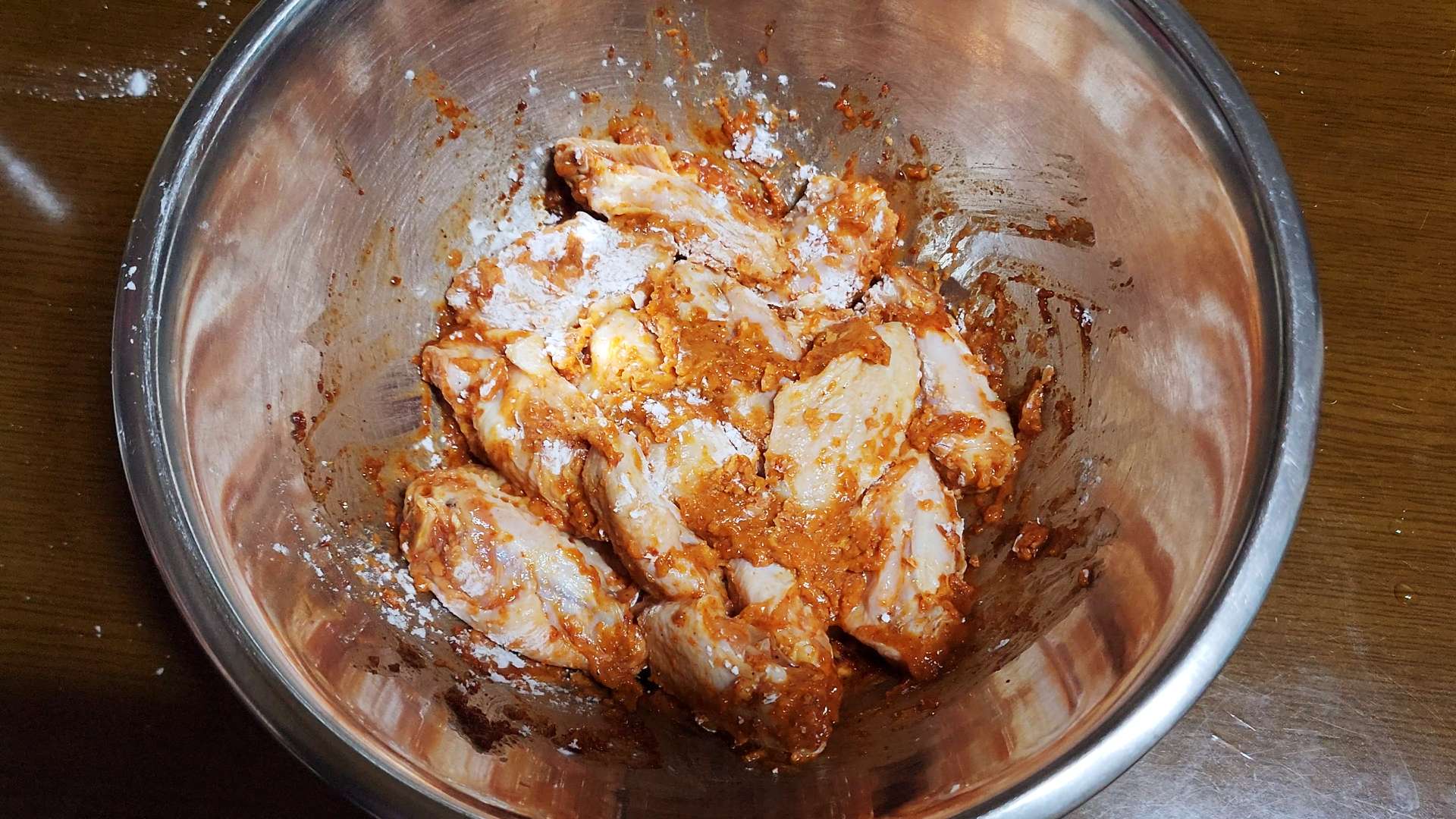 닭에 감자전분 듬뿍 2T를 넣고 섞어줍니다.
