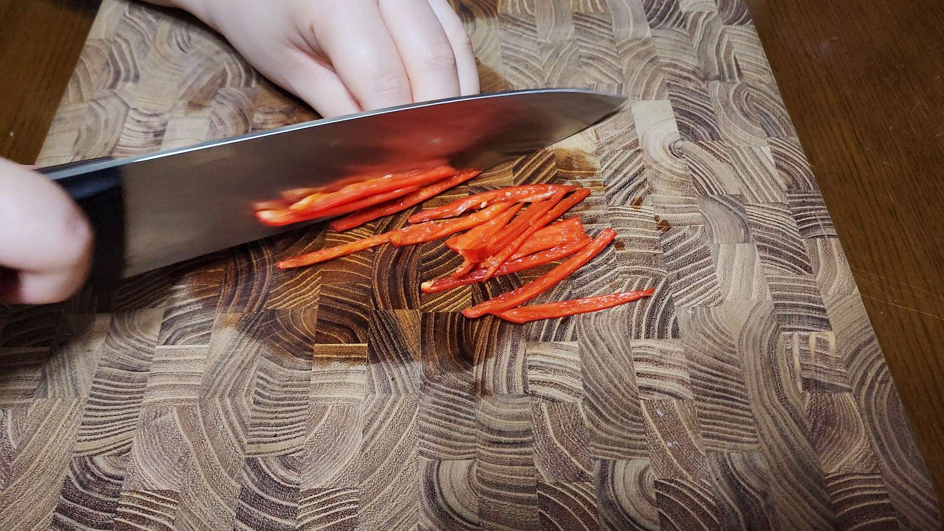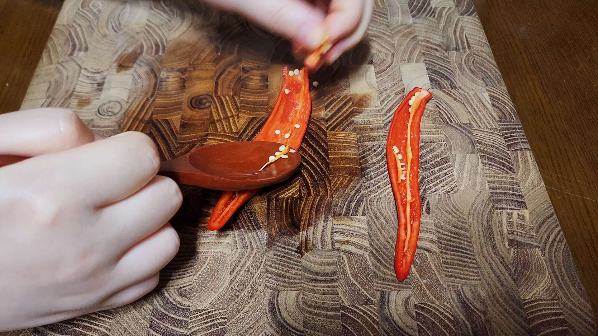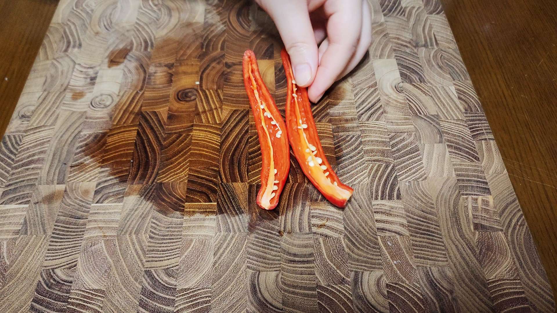 홍고추는 길게 반으로 잘라 씨를 제거해줍니다.