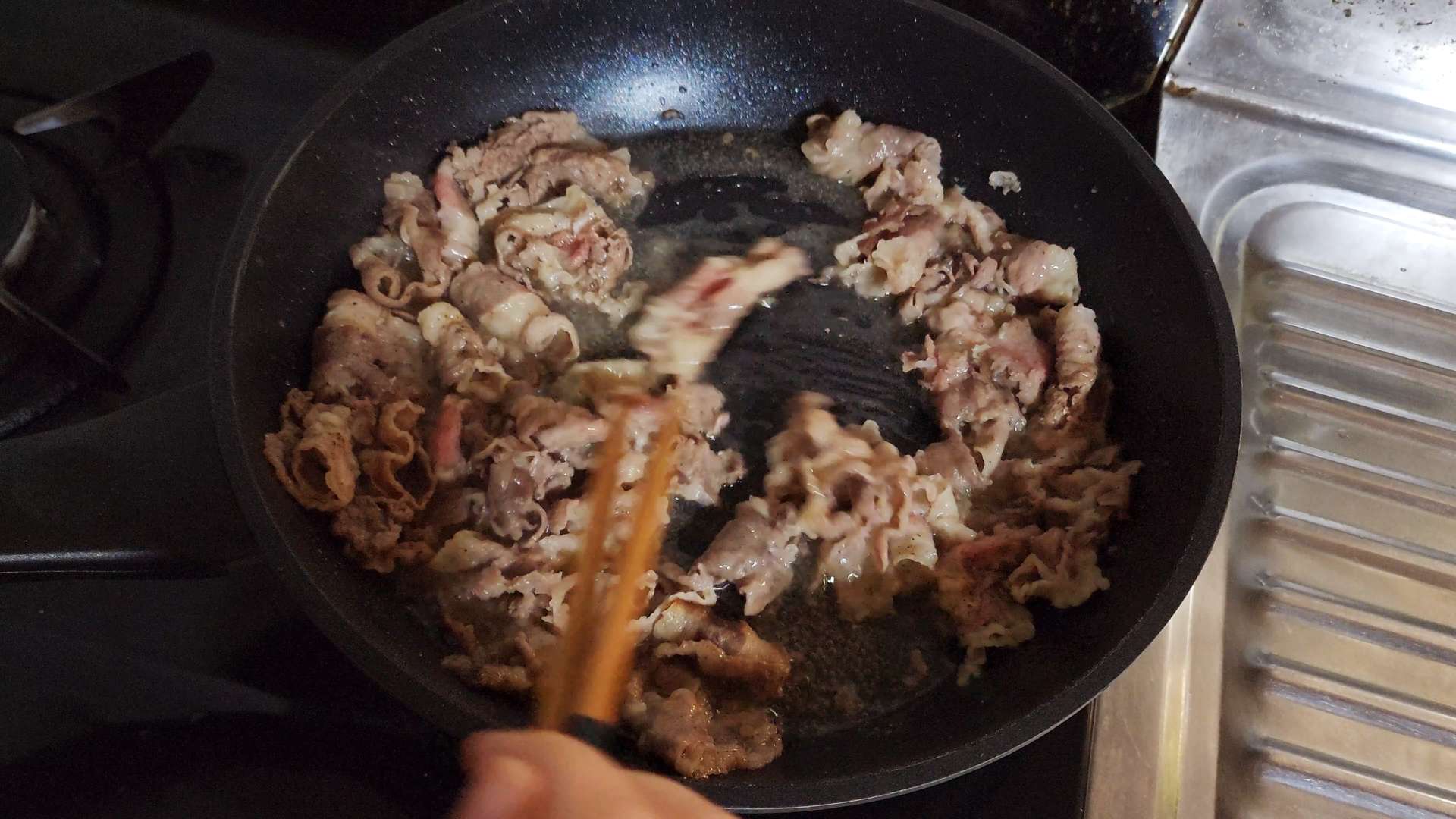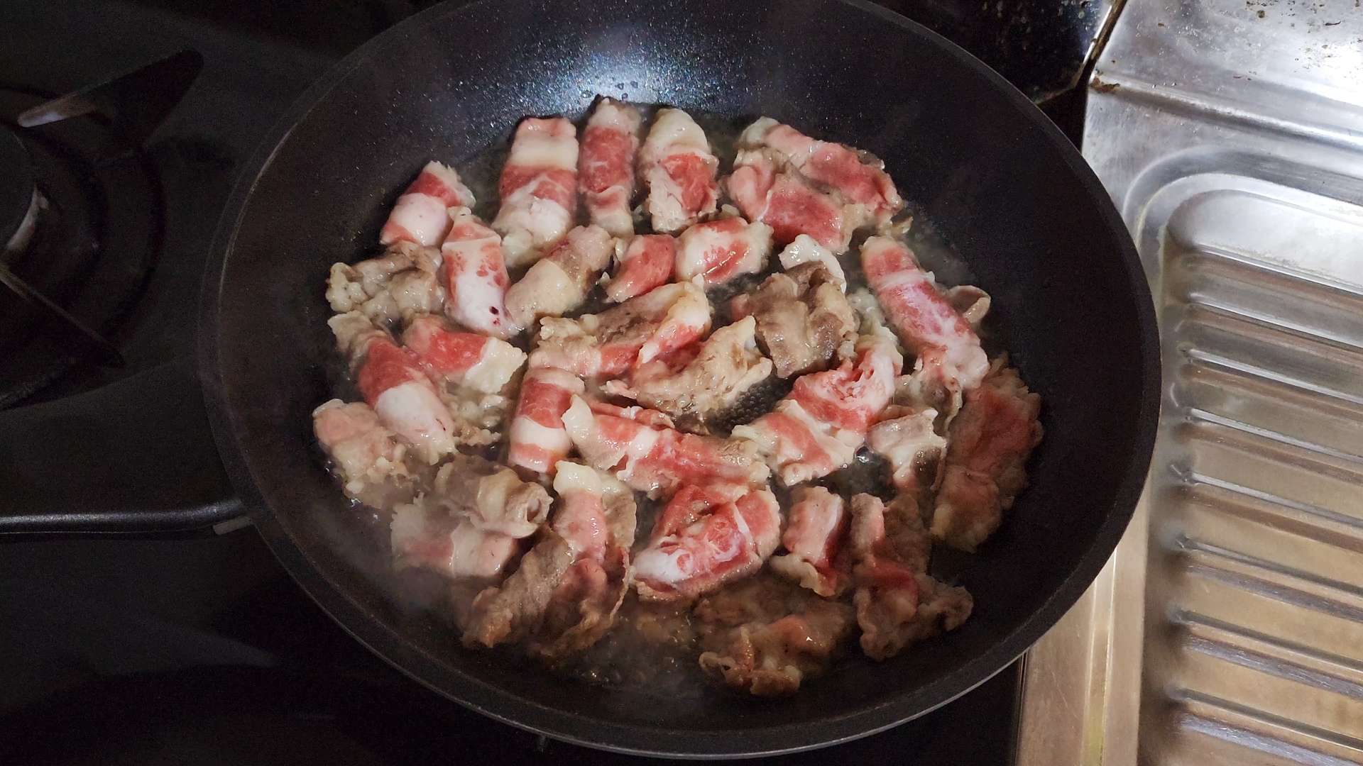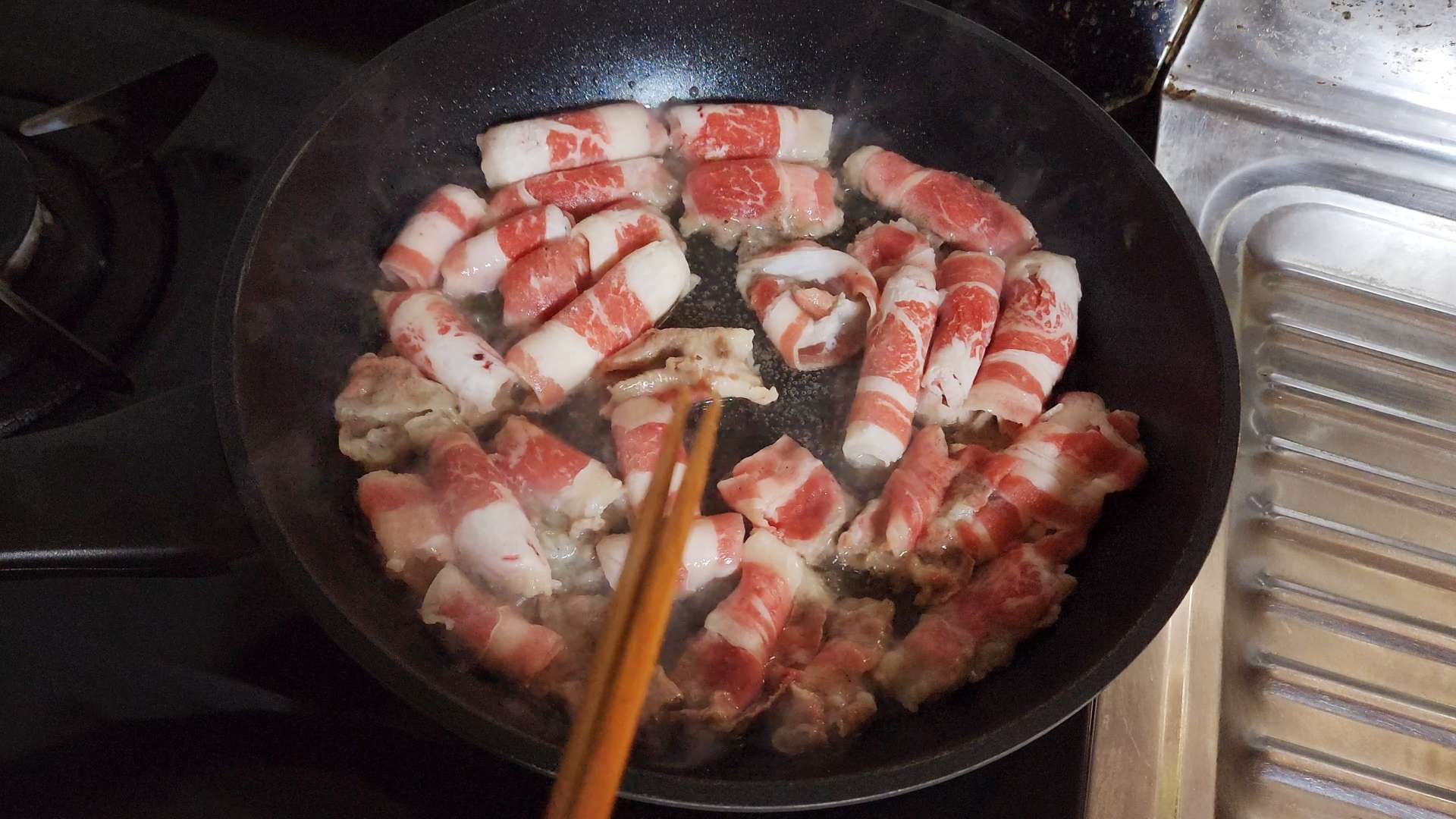강불로 달군팬에 식용유를 두르고 우삼겹을 넣고 구워줍니다.