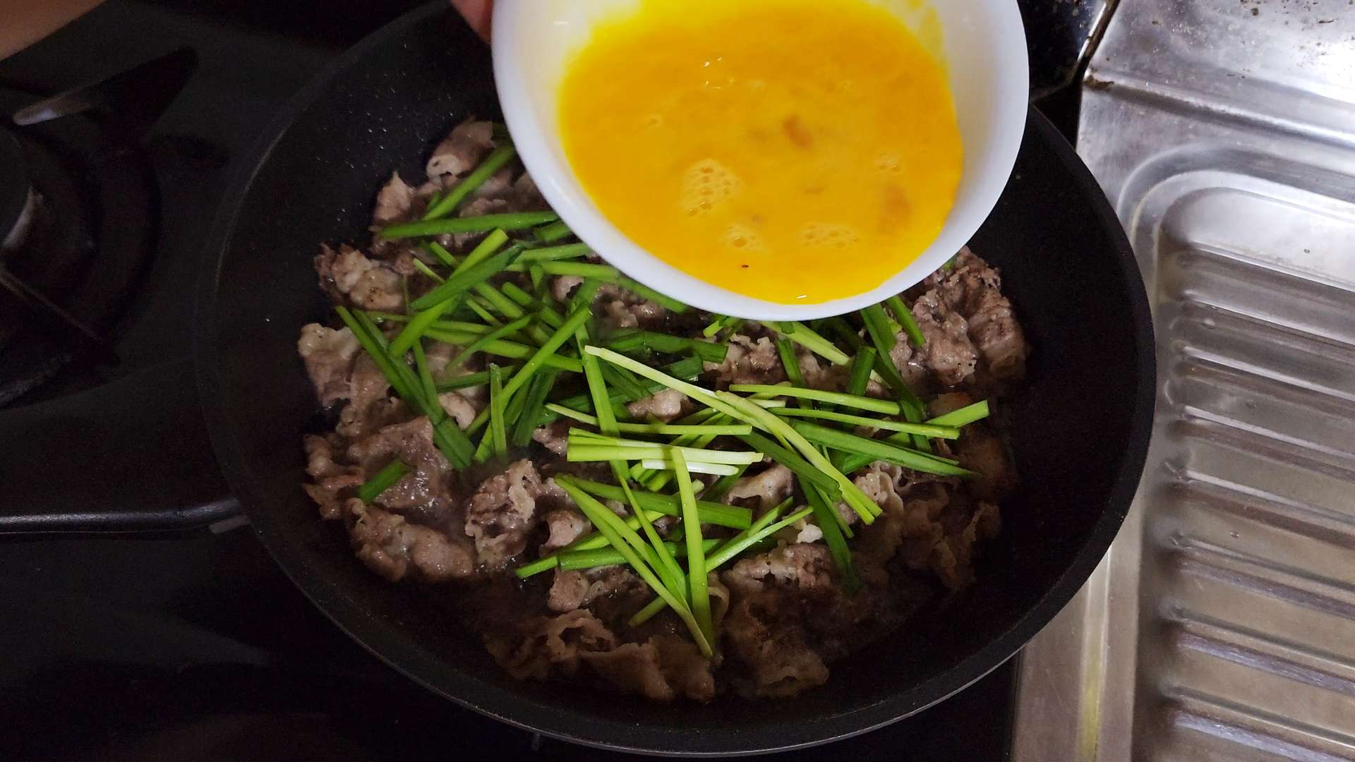 부추, 달걀물을 넣어 줍니다.