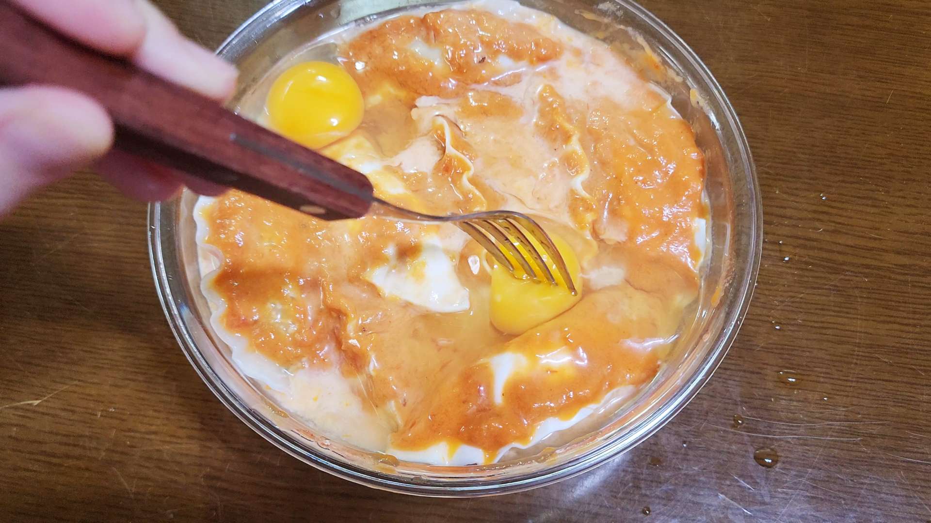 달걀 2개를 넣고 노른자를 포크로 찔러줍니다.