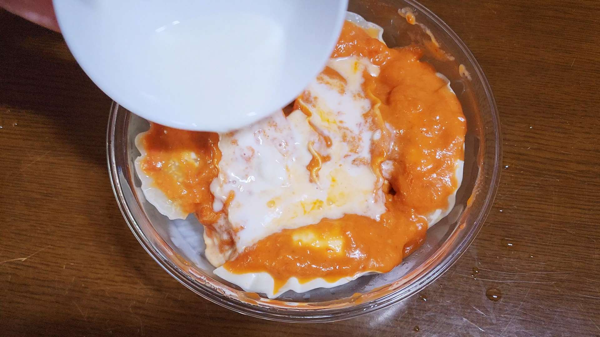 로제 토마토소스, 우유 10ml를 부어줍니다.